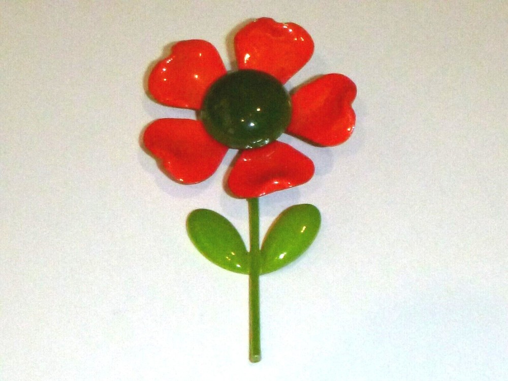 Fab flower power brooch - enamel paint over metal! Big orange daisy with a green stem and leaves. Measures 3.75" in height and is 2.25" wide...