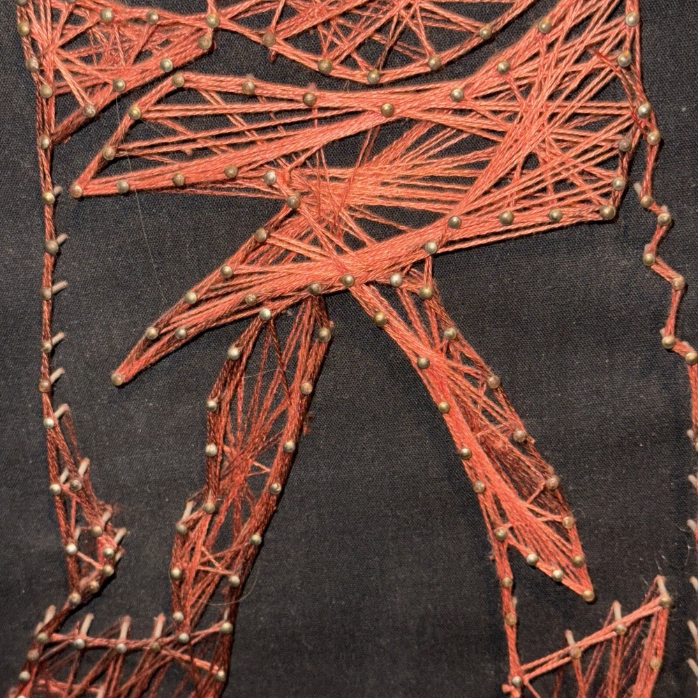 The vintage mid-century golf string art featuring Puerto Rican PGA golfer Chi Chi Rodriguez is a unique piece of sports memorabilia. Measuring inches, this artwork pays homage to golf and Puerto Rico, with intricate string design capturing the essence of the sport. The craftsmanship and vintage appeal make it a standout piece for any golf enthusiast or collector looking to add a touch of nostalgia to their space. This vintage string art depicts a smartly dressed golfer mid swing in red, gold and white thread. Framed in hardwood over black fabric, this piece of original mid century art is in excellent condition.