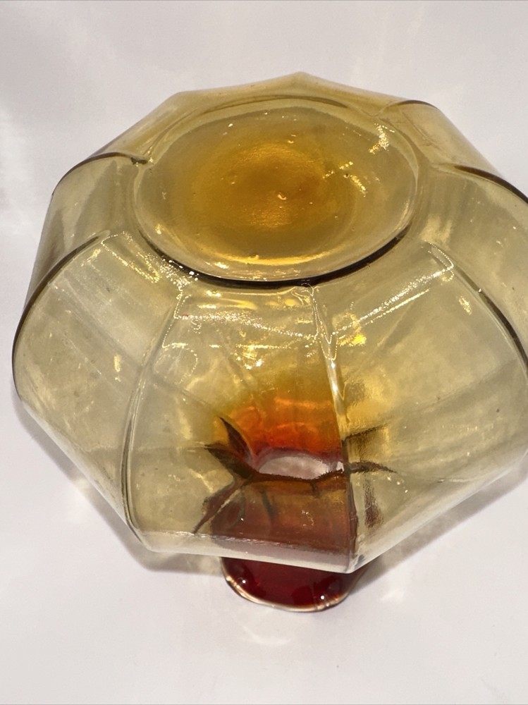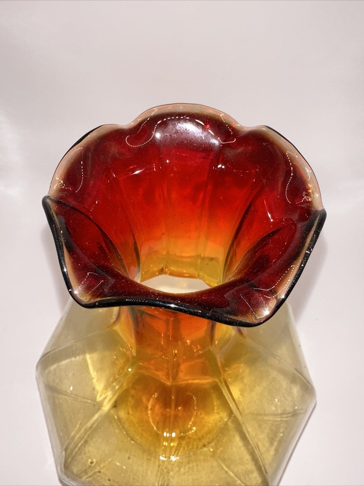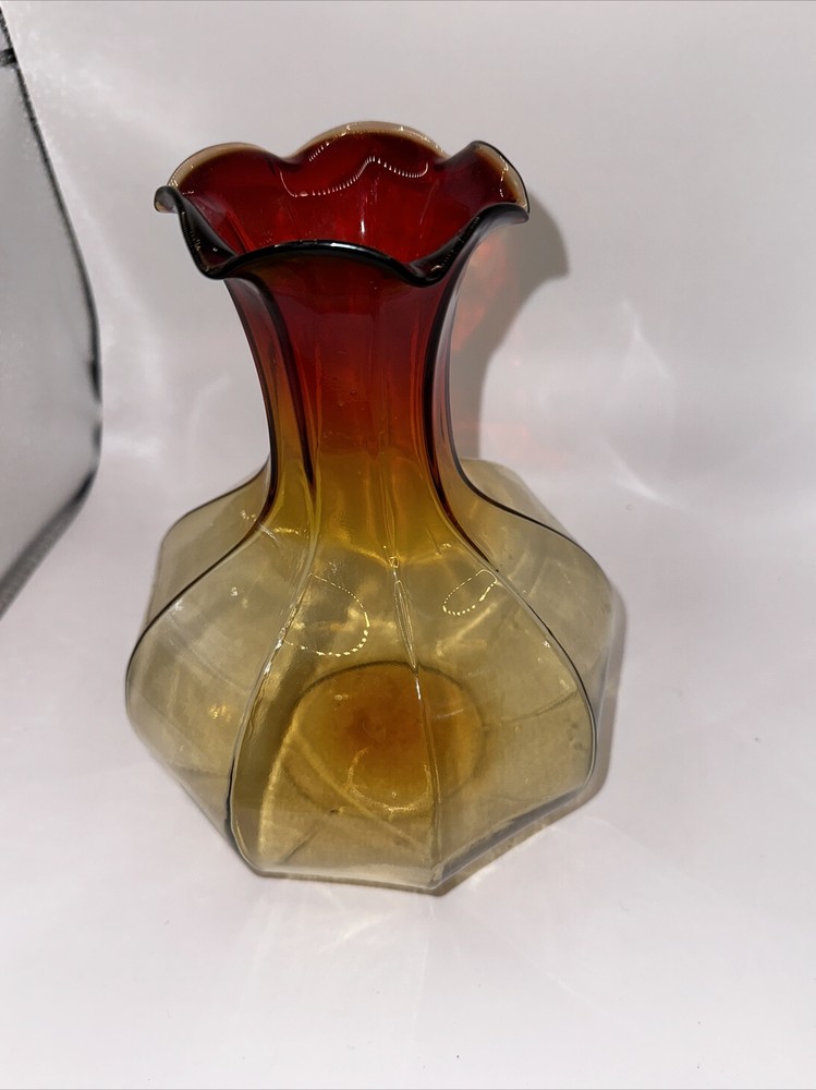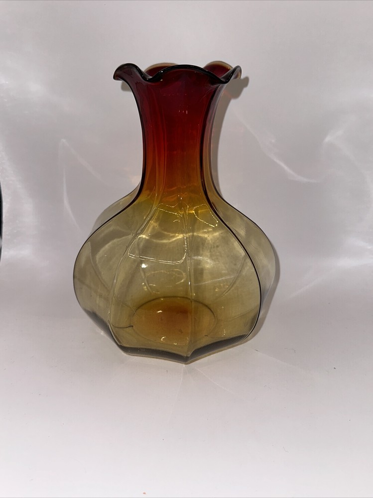 This vintage Indiana Glass Amberina Orange vase is a beautiful addition to any collection. With a ribbed pattern and matte finish, this 9-sided glass vase stands at 8 inches tall and is perfect for all occasions. The vase is an original piece and has not been signed. The round shape of the vase resembles a nonagon, and it is made of high-quality glass material. This vase is perfect for displaying flowers or as a decorative piece on its own. Add a touch of mid-century charm to your home with this stunning vintage vase.