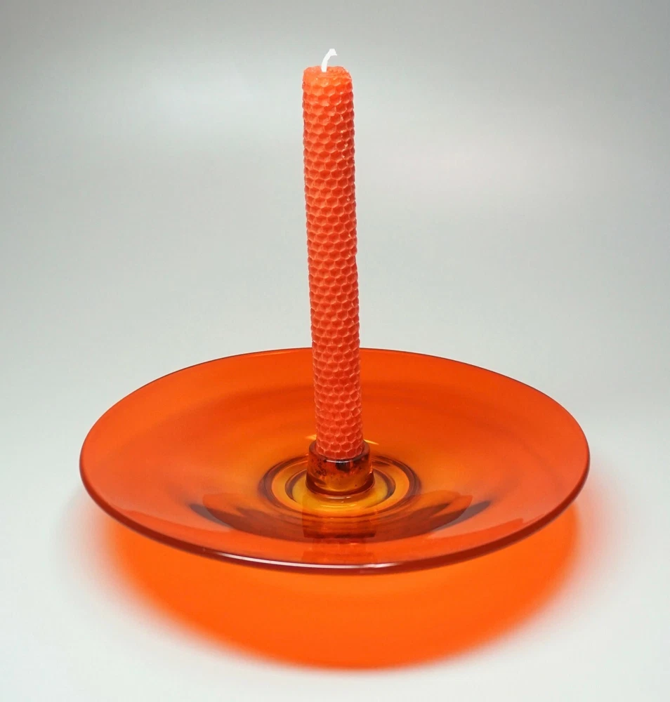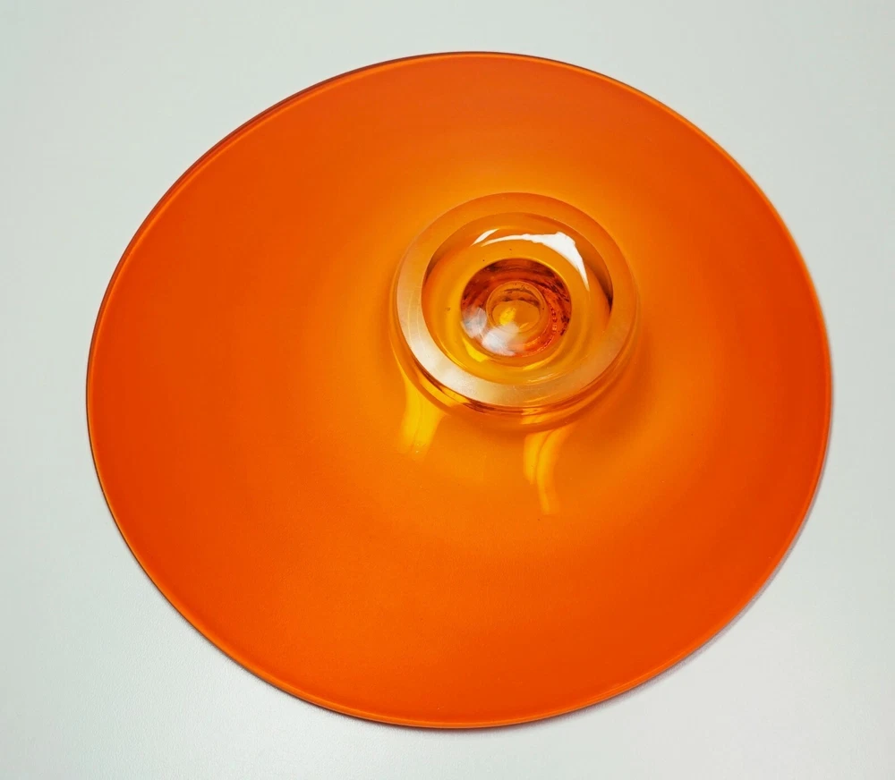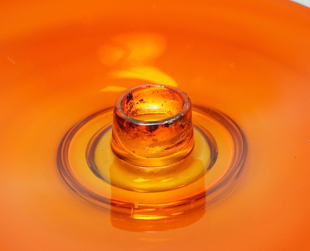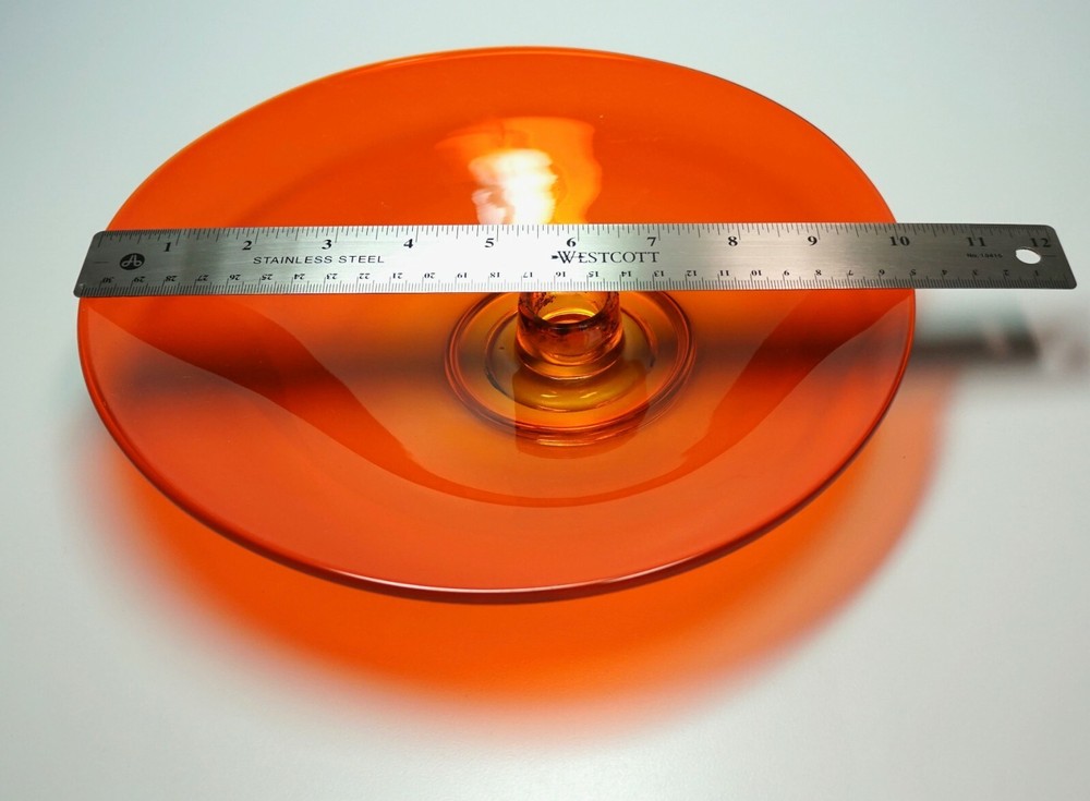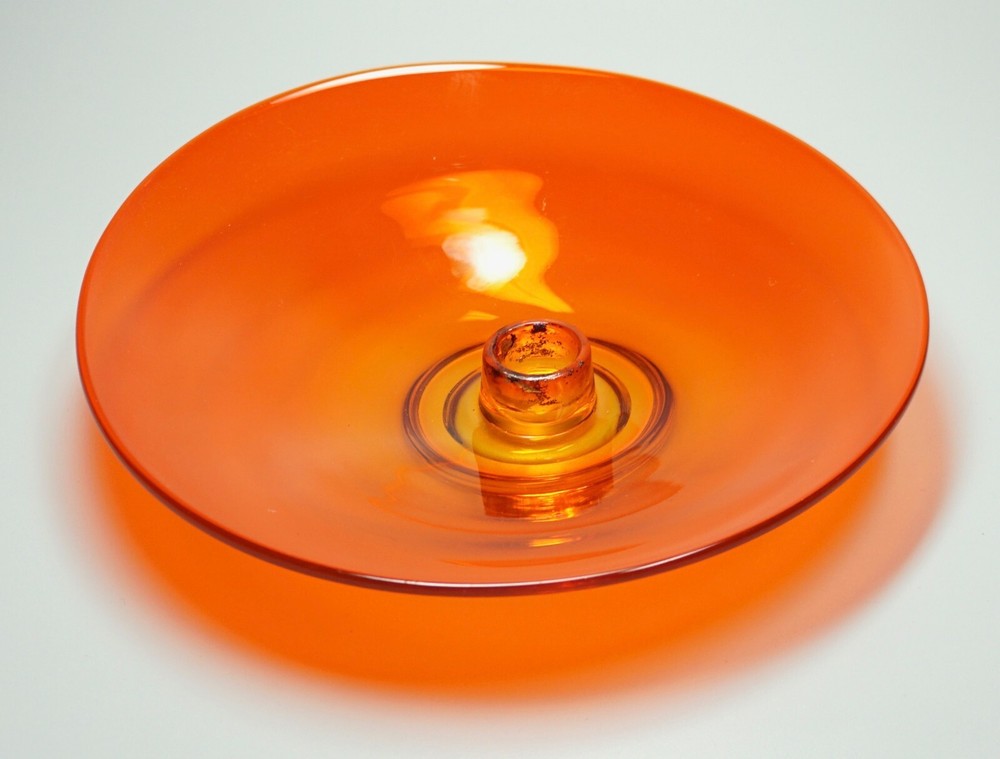 Vintage Mid Century Mod Bright Orange Glass Candle Holder Dish 10" Ovoid Centerpiece Stunning piece of mid century modern glass Minimal signs of age/use Brilliant, transparent orange with a slight fade to yellow around candle socket 10 1/4" x 10" ovoid shape Height slopes from 2 1/8" to 1 5/8" The candle socket is placed off-center Holds a taper candle up to 7/8" diameter (not included) No chips or cracks A few use marks upon close inspection Expect some wax residue on socket No maker mark detected Weight before packing: 1 pound 12 ounces Professionally packed with extreme care. Extra cushioning and sturdy, oversized box for fragile items. A macro lens is used to capture as much detail as possible. Keep in mind when using zoom tool that the item is magnified many times, which exaggerates even the tiniest scratch. Apology Shipping Note: As of June 1, 2019, USPS has escalated shipping costs. Packages over 1 cubic foot will incur considerably higher shipping charges based on dimensions of box. Happy to answer additional questions and provide more photos prior to purchase Items may show blemishes not typically seen with the naked eye Item sold "as is" and not returnable - Please ask questions prior to purchase Professionally packed - Quickly shipped It is Buyer's responsibility to examine photos, read the entire item description and ask questions pertaining to color, condition, etc. prior to purchase. If color is critical, contact me prior to purchase as color varies based on lighting conditions and computer monitors International Buyers: Import duties, taxes and charges are not included in the item price or shipping cost. These charges are the buyer's responsibility. Please check your country's customs office to determine what these additional costs will be prior to making an offer or purchasing. 90% of our packing materials are recycled from local businesses