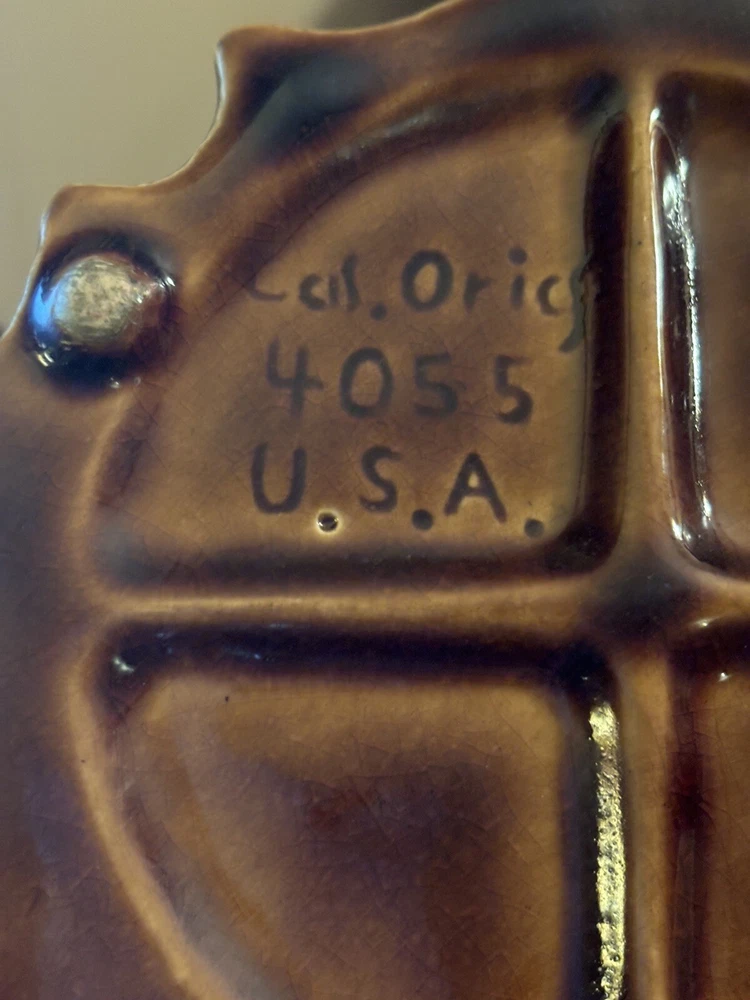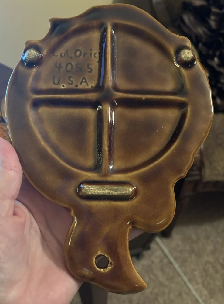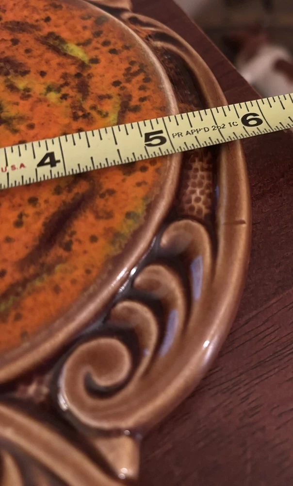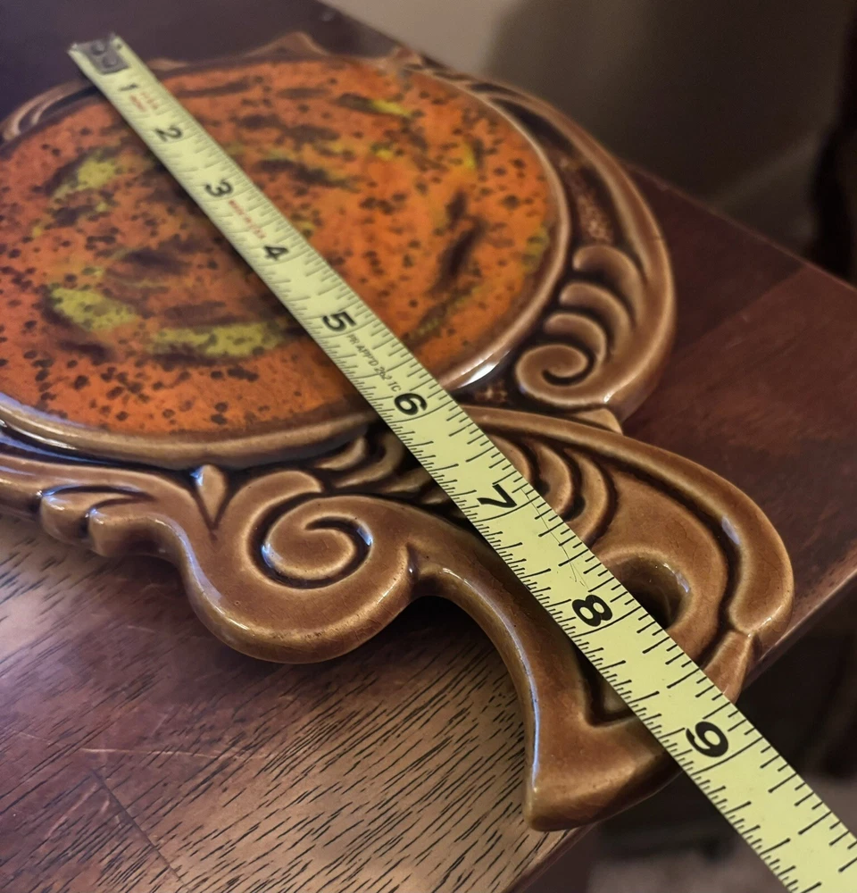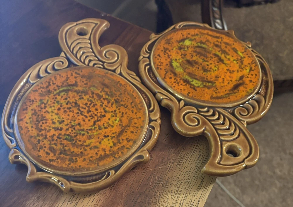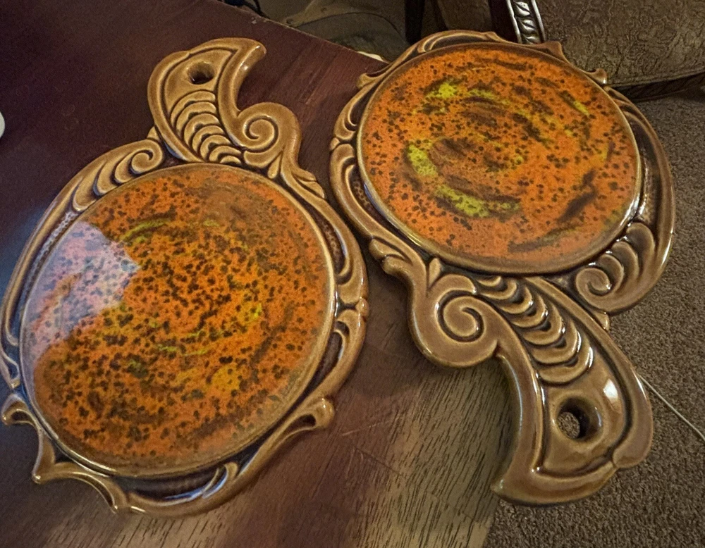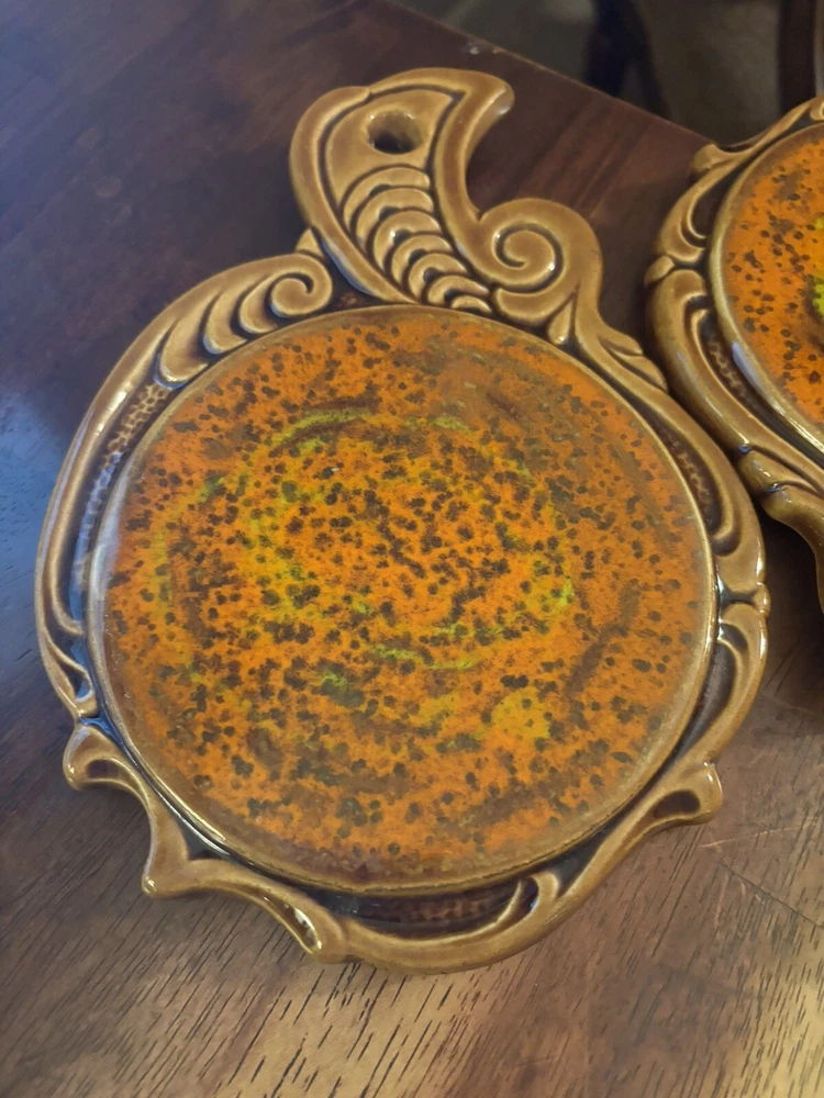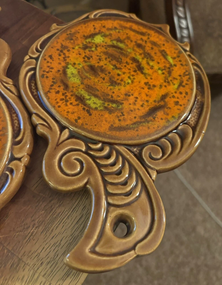 Add a splash of retro charm to your kitchen with this set of two vintage ceramic trivets from California Pottery USA. The abstract pattern in orange and gold hues adds a touch of sophistication to your dining table. These trivets are large in size, measuring 9 inches in height and 6 inches in width, making them perfect for hot dishes and serving trays. Crafted in 1975, these trivets are original and licensed reproductions of the time period. The glazed finish and 1970s style make them a unique addition to your collection of dinnerware and serveware. Ideal for collectors and enthusiasts, this set is a must-have for anyone looking to add a pop of color and design to their kitchen. The ULTIMATE definition of Groovy!! These are gorgeous!! Use them as Trivets or wall art in your Retro Kitchen!!