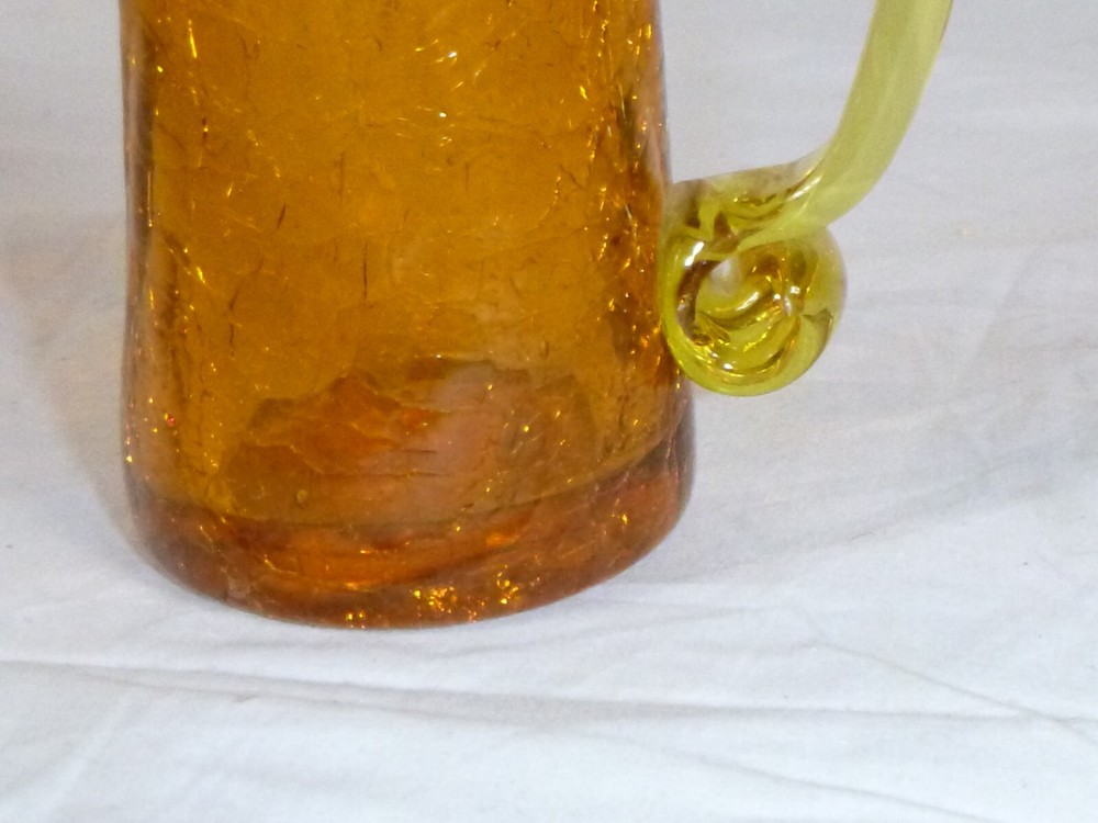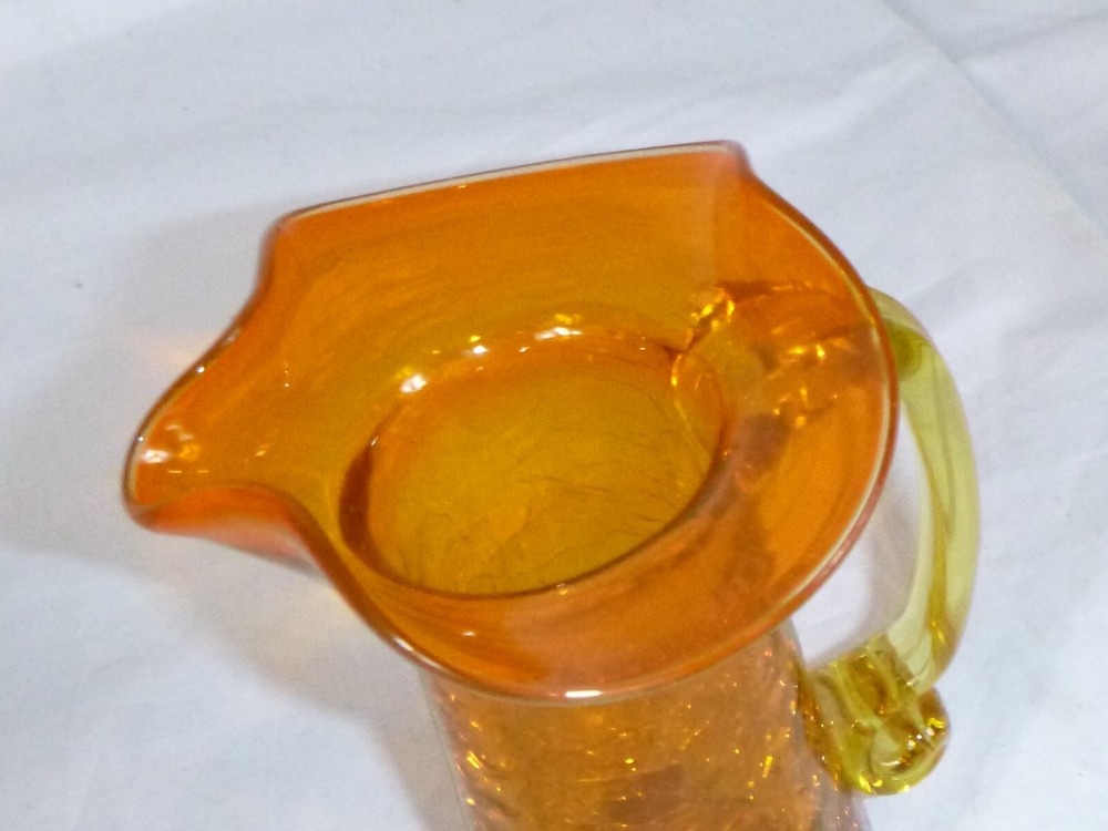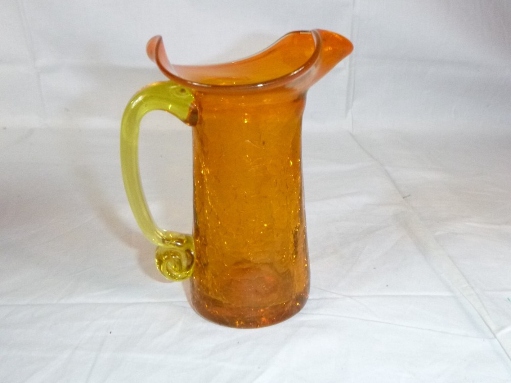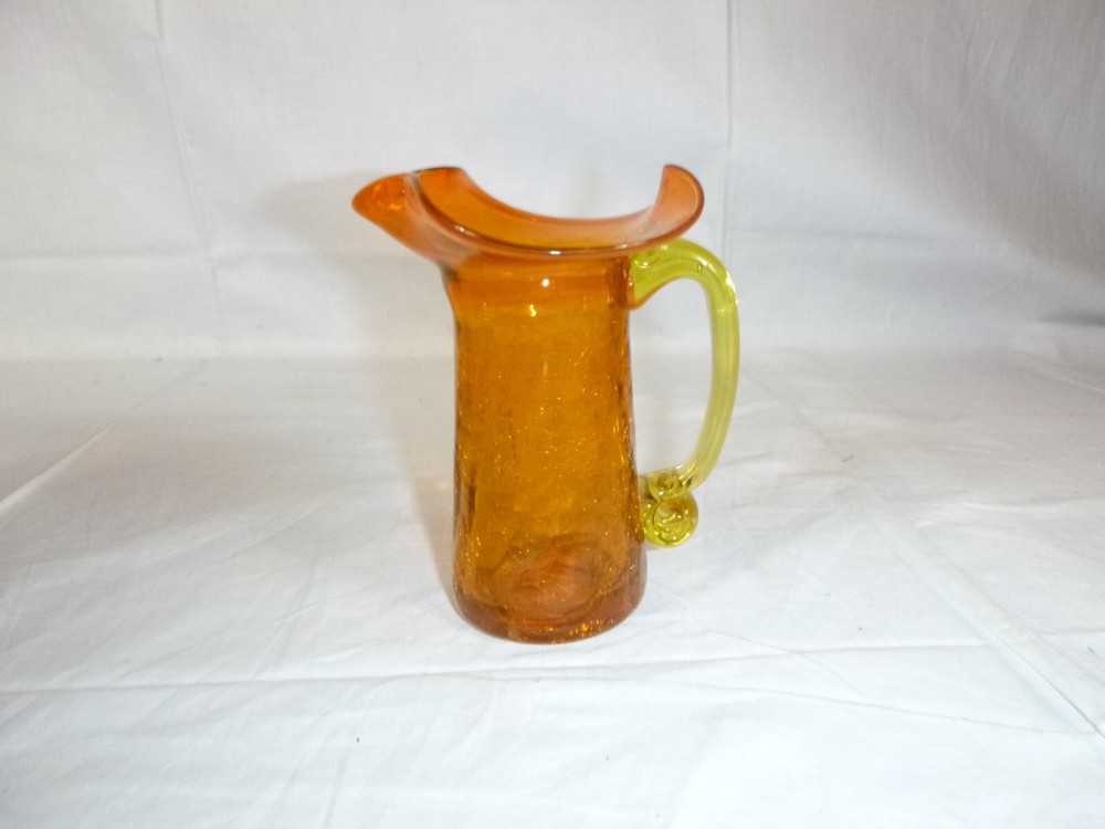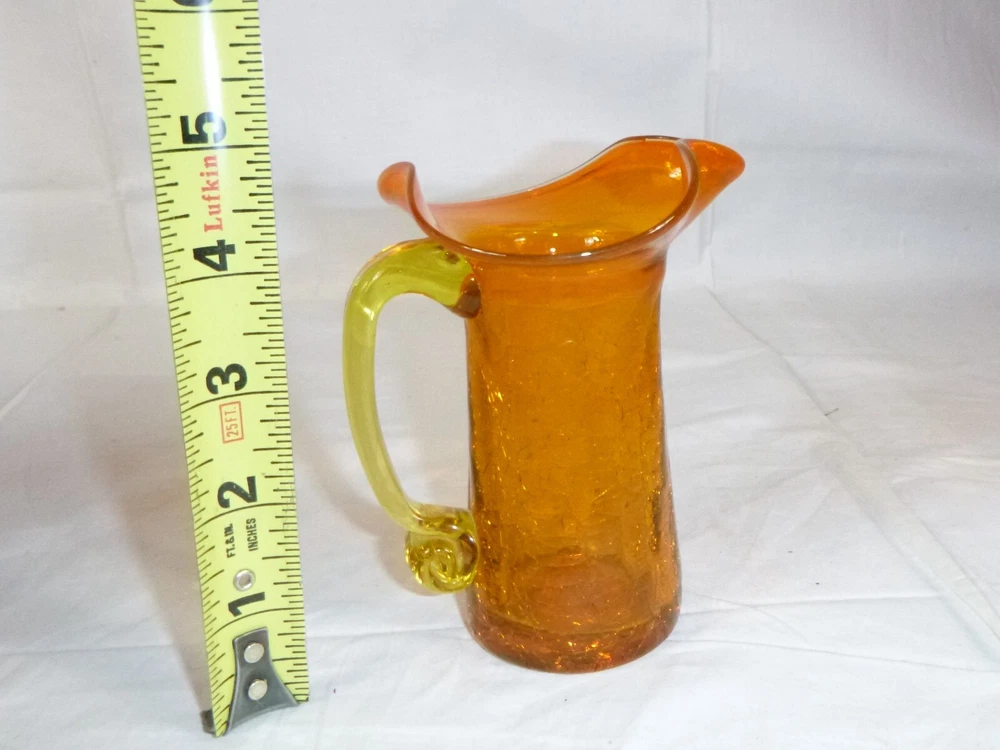 Very pretty vintage mini pitcher in orange. Measures 5" in height. I think this is by Rainbow Glass, but I could be wrong.... Great condition! Please see pics...