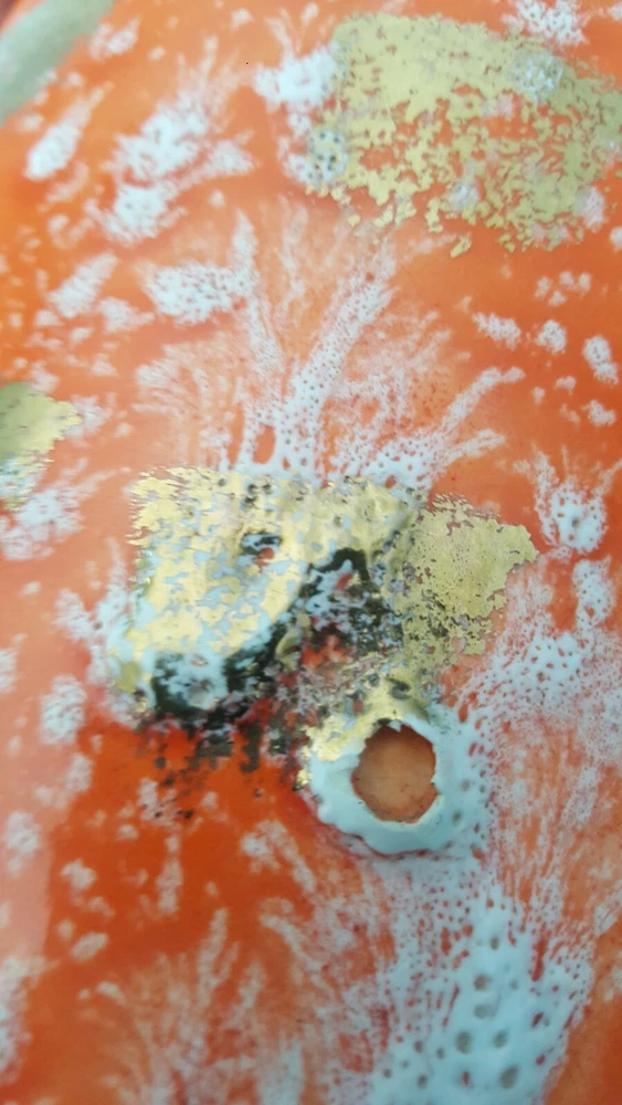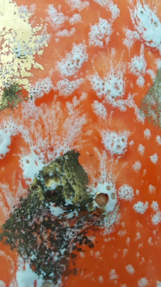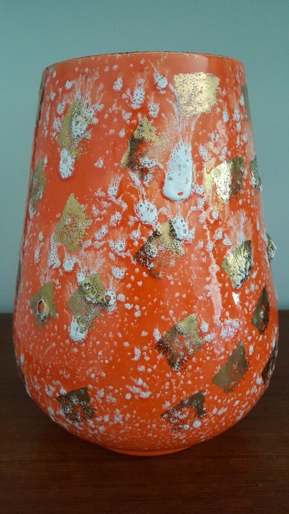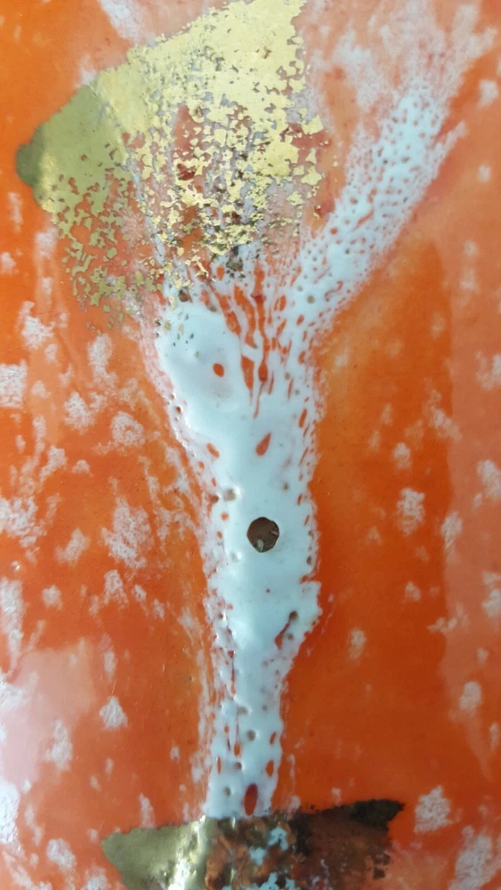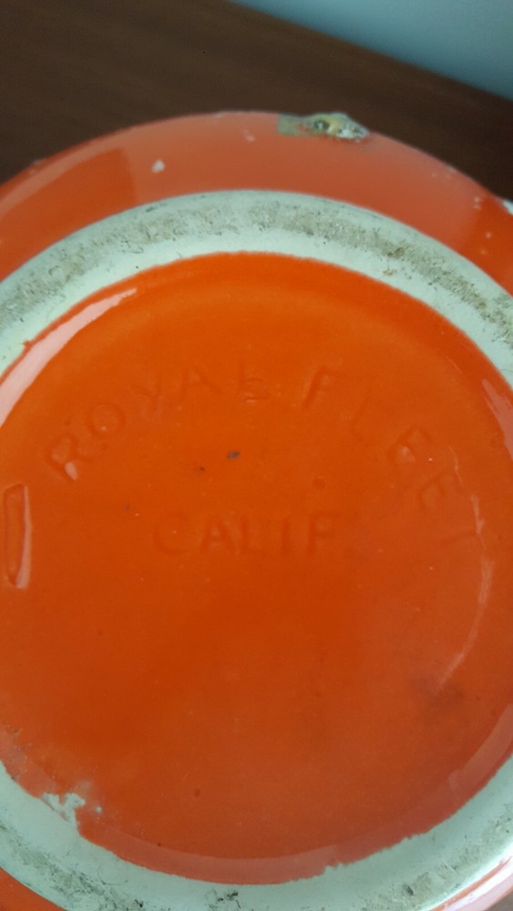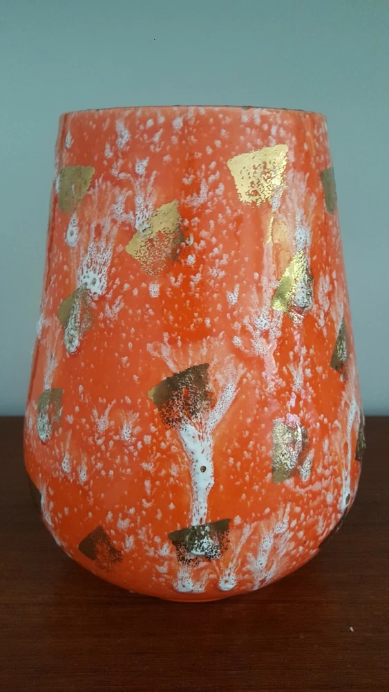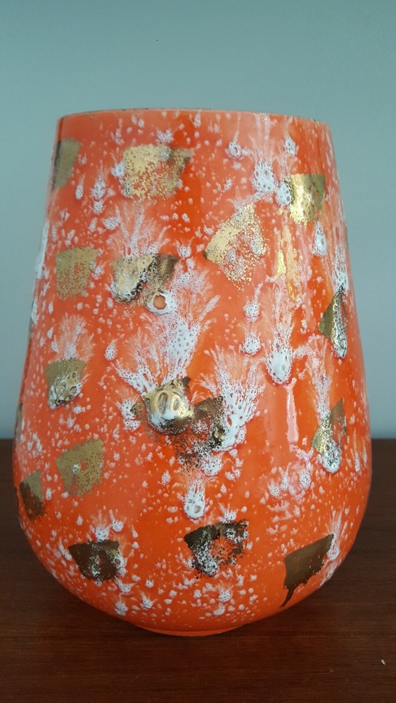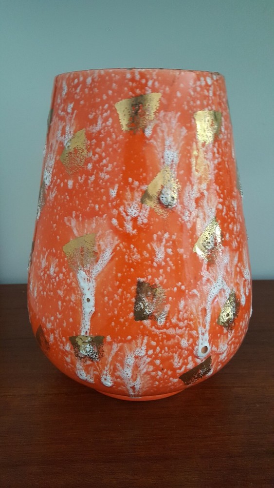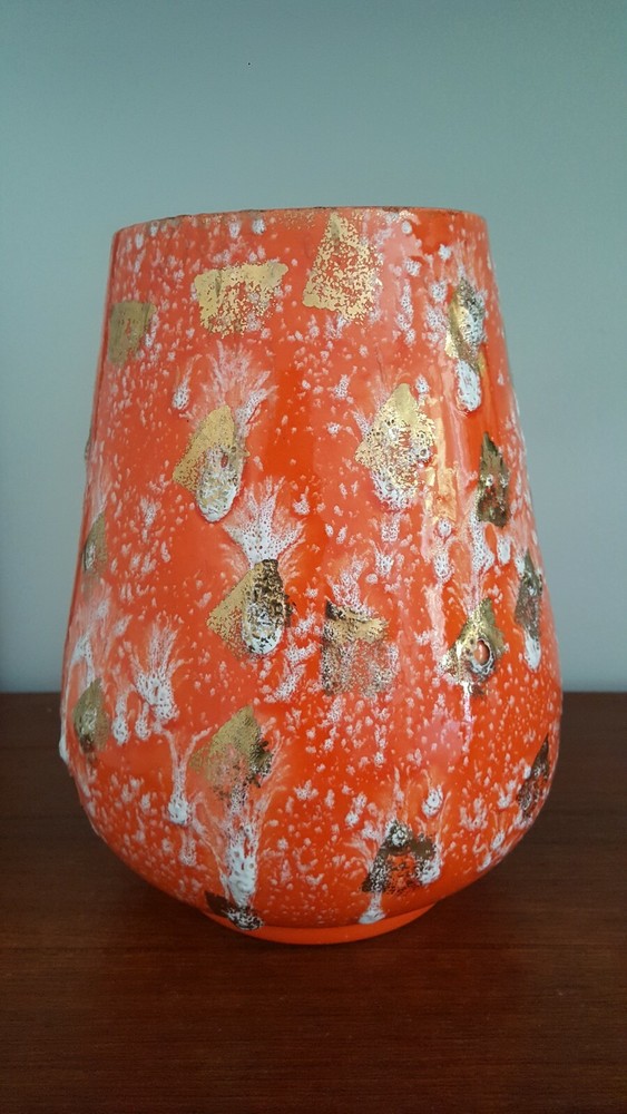 This is for a vintage mid century Royal Fleet California glazed lava pottery vessel vase. A stunning textured piece in orange, white and golds. Raised areas with drips, run and brushed areas sporadically placed all over the piece. Piece is in a gloss finish. Im not sure what its made of. It appears lighter in weight than say stoneware. We thought maybe ceramic but theres areas where pottery is raw and it does not look like white ceramic to us. You see photos. You judge. It stands at appx 10.5 inches tall. Top diameter of 5.25 inches while bottom base sit area is 5 inches. The circumfrence around the bottom belly/widest area of vessel is 25.5 inches. A guestimate with tape measure diameter across this area is maybe 7.5 inches to maybe 7 3/8 inches . Hard to get exact to to round shape. Theres no scratches, breaks or actual damage to piece. We are going to note the last photos . These are a couple of the textured raised areas on vessel. We are not calling these chips or breaks. They are more of like air pocket pop areas in pottery. They remind us of little air bubbles that opened during firing. This is best way we can try to explain. These are all there is in the photos. There are also a couple of which I referred to earlier in description to show the raw pottery under the glazing. Sort of a brown terra cotta type coloring. Zoom in to see. Very nice stand alone piece. Sharp. Please see all photos closely as part of description. Ask all questions prior to purchase as sale is final with no returns. Thank you for stopping and looking.
