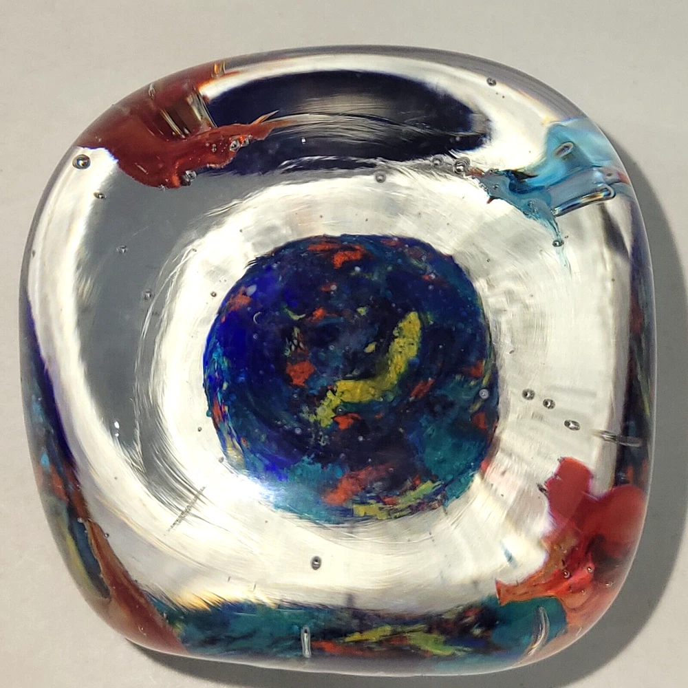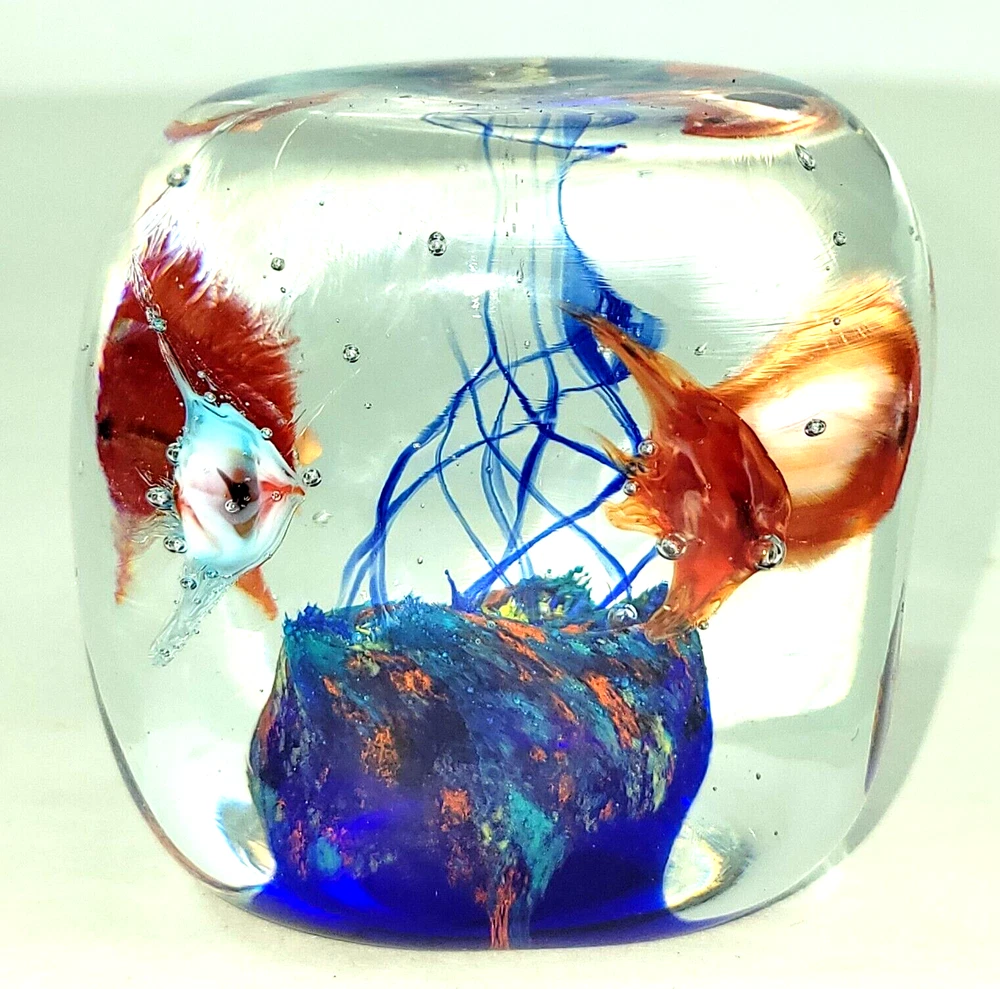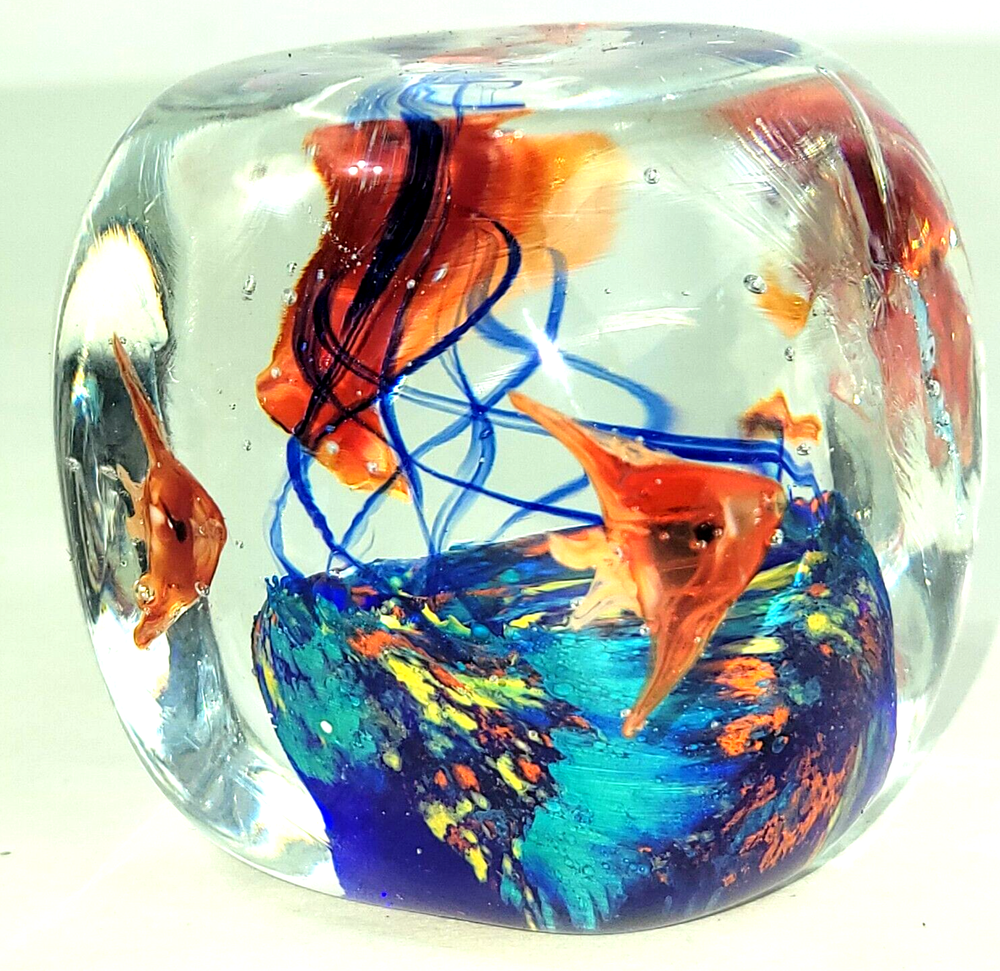 Vtg Mid-Century Handblown Glass Paperweight Sea Scene Orange & Blue 2 1/4"W x 2 1/4"H.