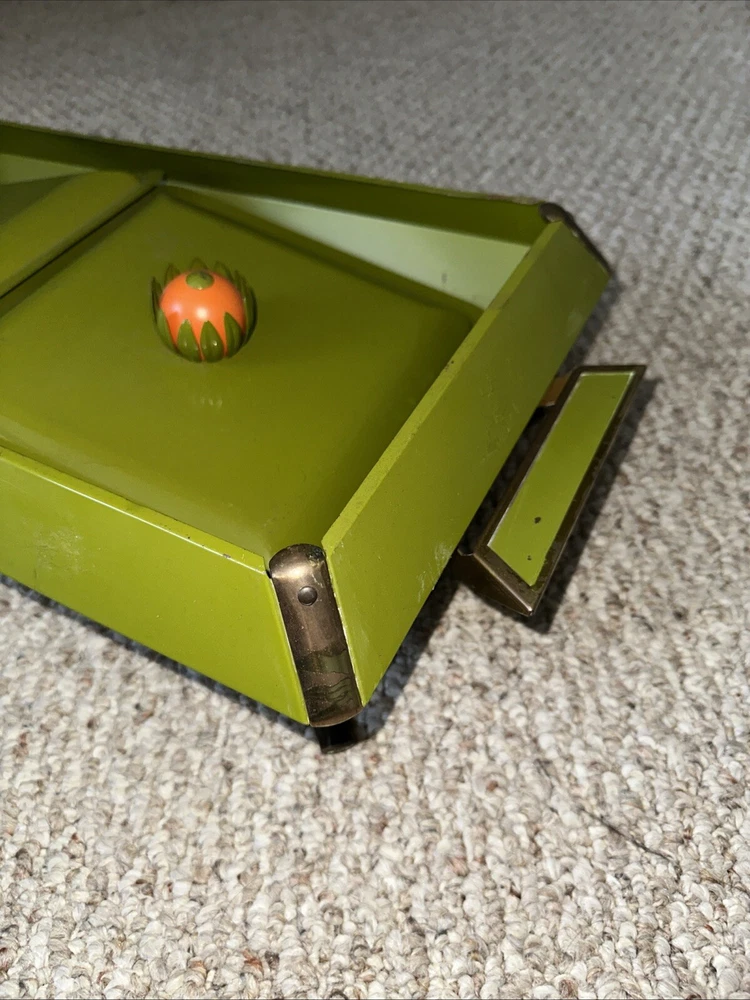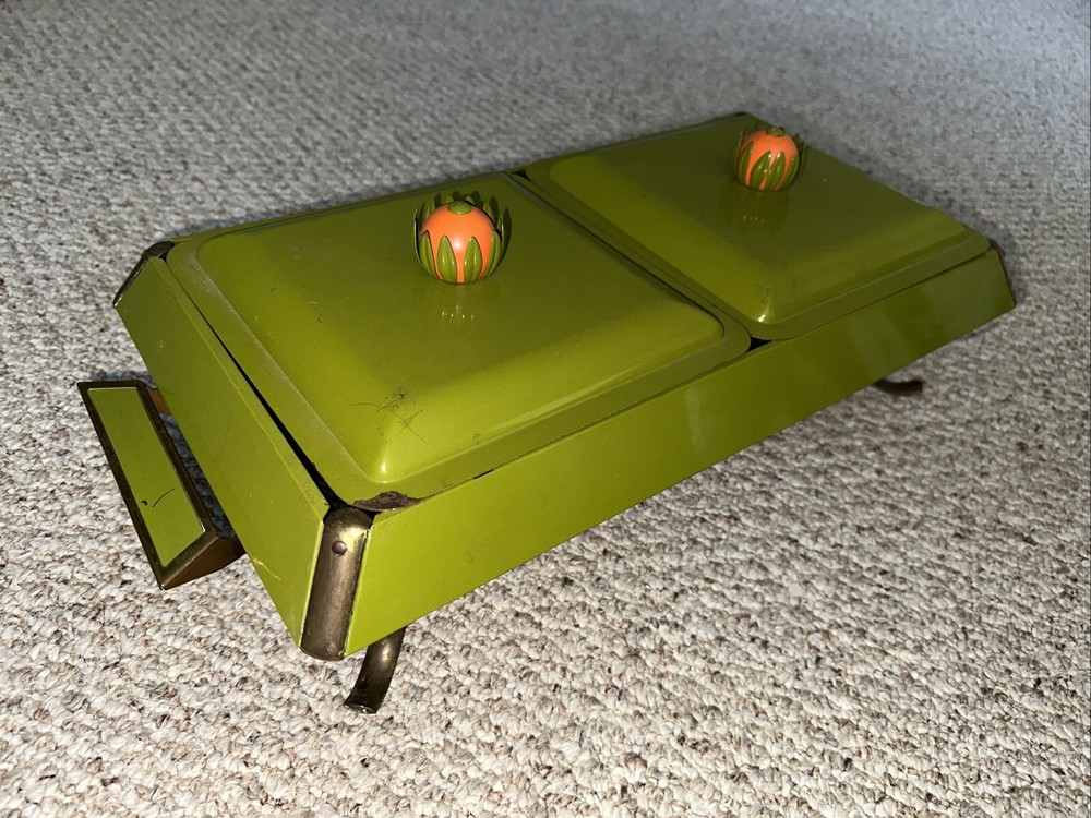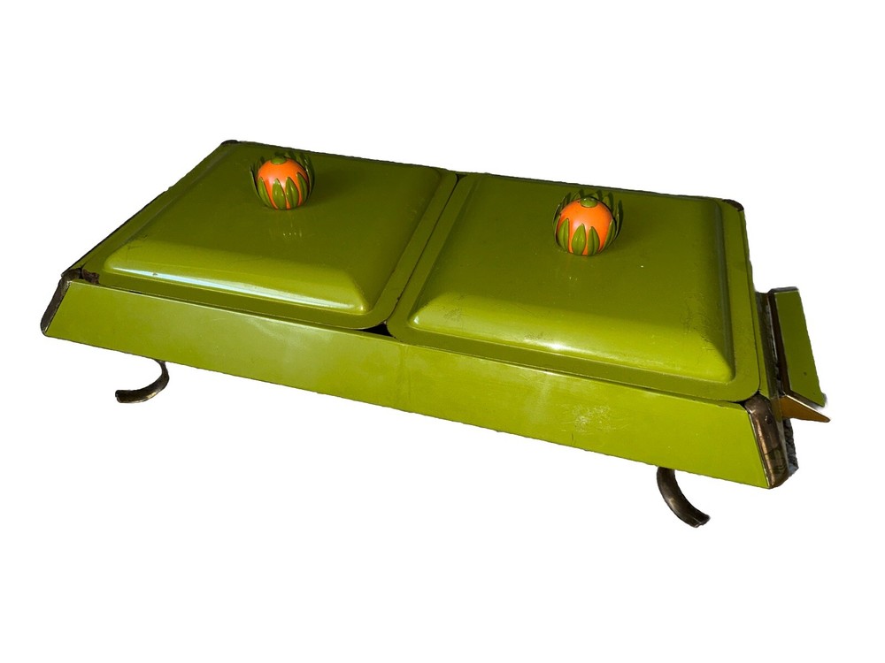 Vtg Mid-Century Lidded Double Chafing Green Geometric Orange Flower Top Handles. Condition is Used. Shipped with USPS Ground Advantage.