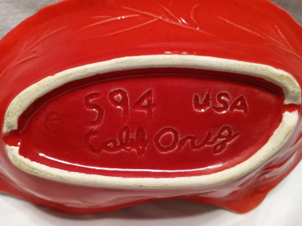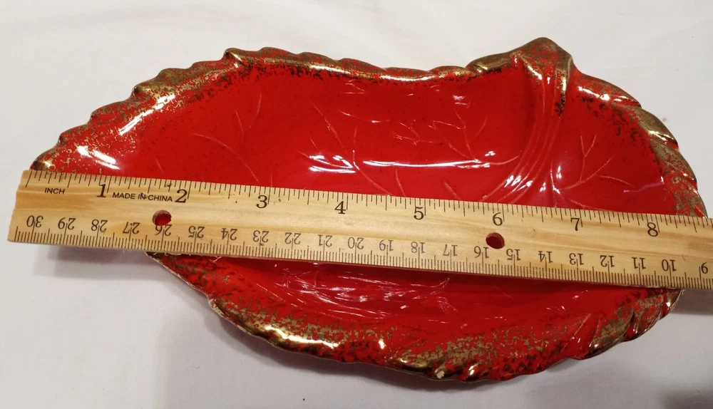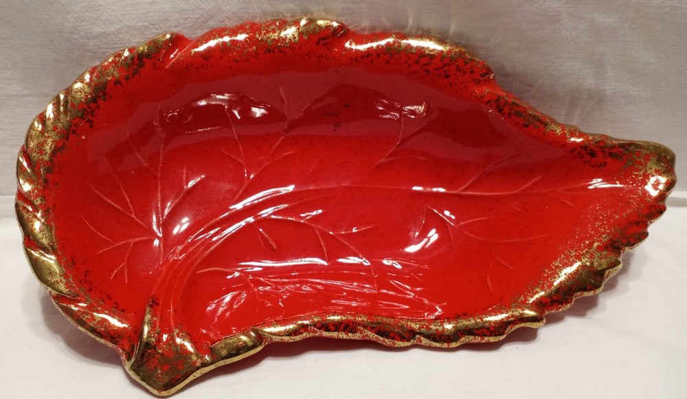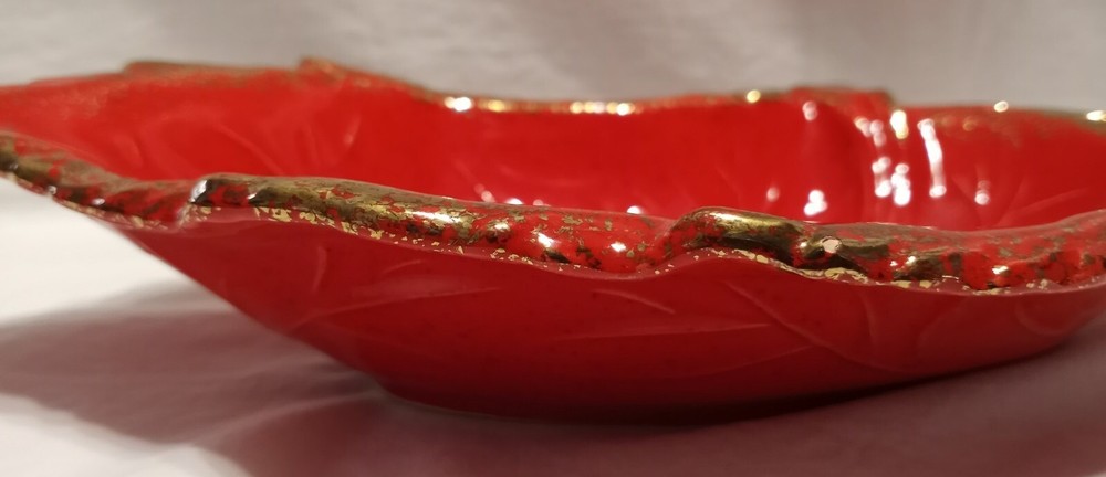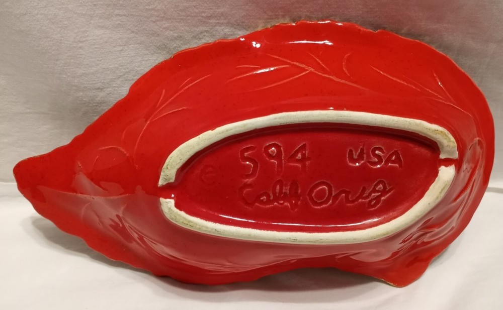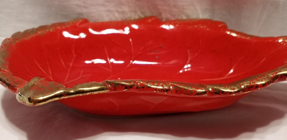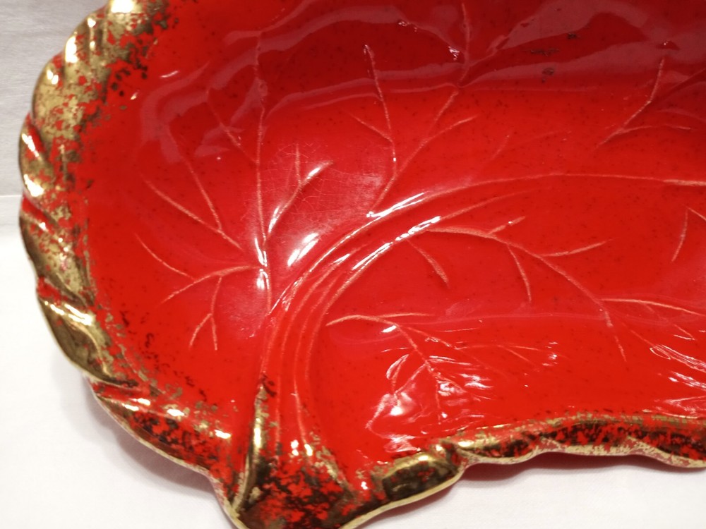 Veined leaf. Note a tiny glaze bubble chip vs flea bite along rim. Small enough it was difficult to photograph but it can be felt. Great fall harvest decor. Halloween....