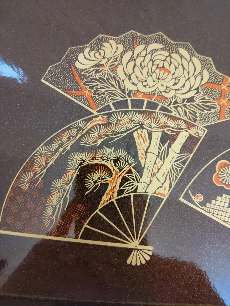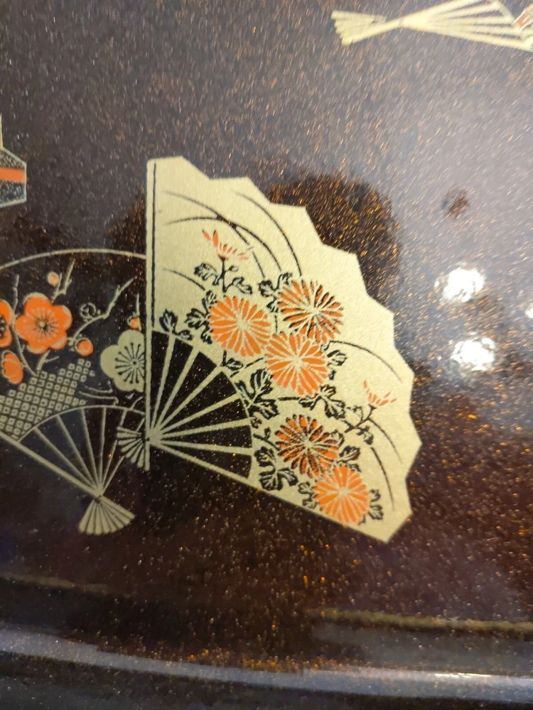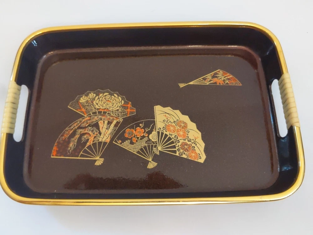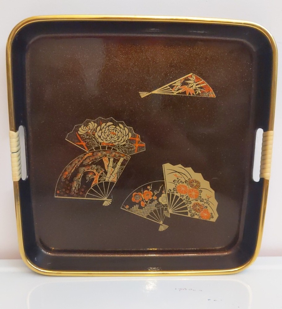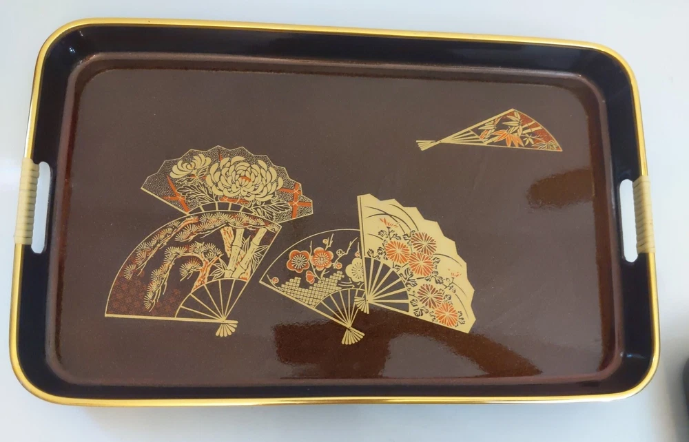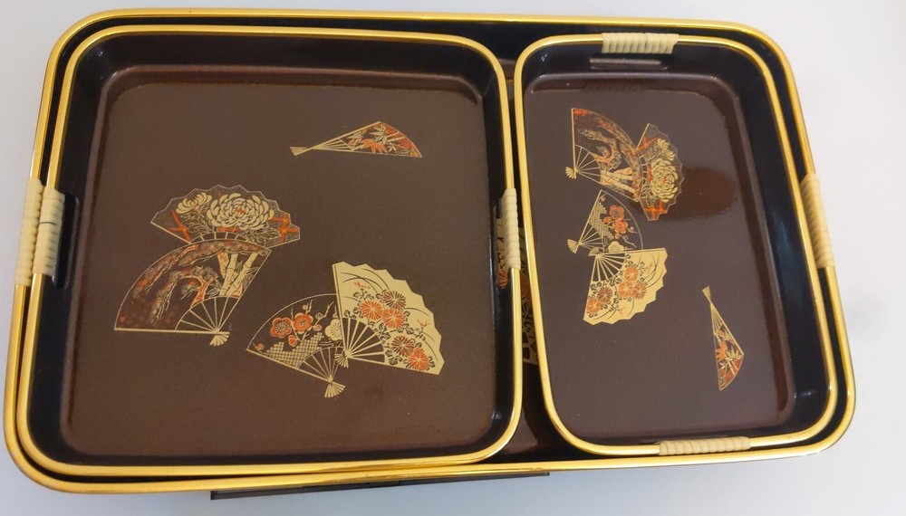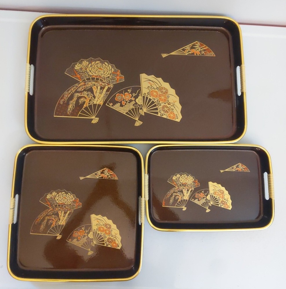 Vtg Oriental Mid Century Fans W/ Floral Landscape Brown/Orange 3 Tray Set. I cannot tell if these are plastic, melamine or wood 3 trays good condition see pics please for scratches etc Ask questions Sizes are 18.5" x 11.5" 10.5" x 10.5" 10.5" x 7"