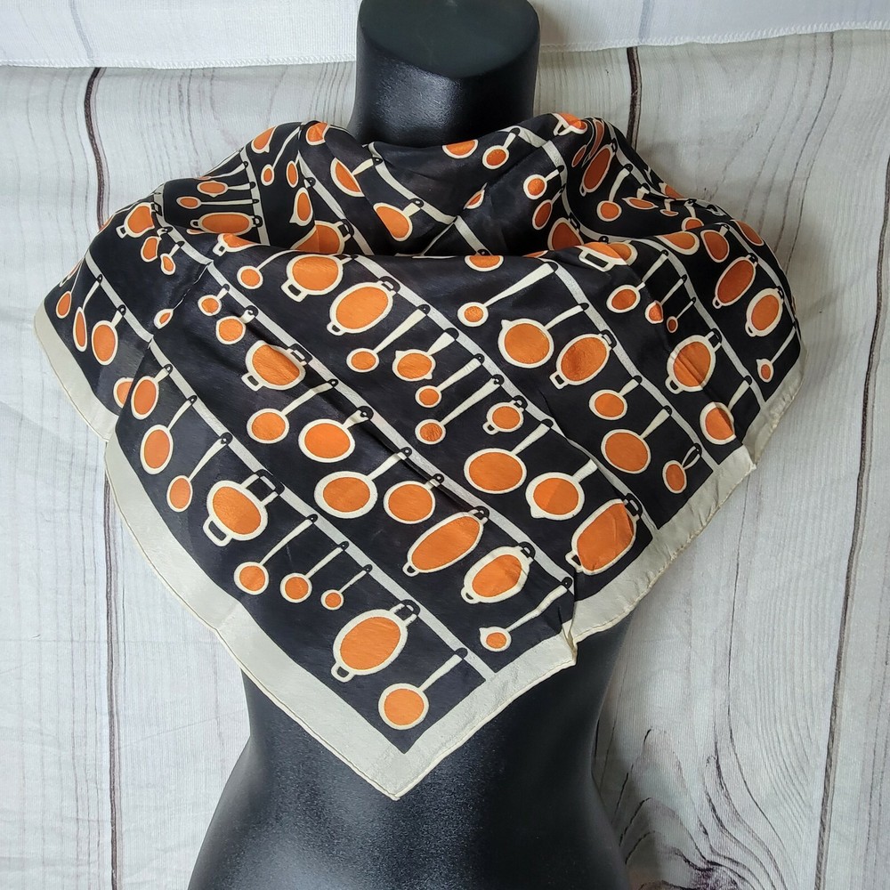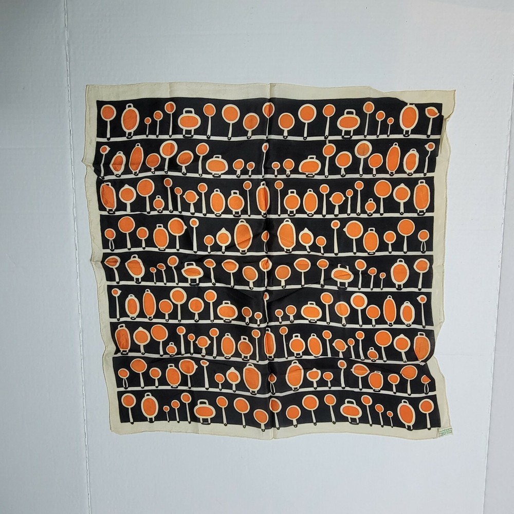 Vtg Silk Scarf Hand Rolled Orange black Square mid century geometric circles. Clothing: Most clothing listed is sourced from individuals and preowned. As such it is subject to stains, strings, tears and holes. I do my best to point out any imperfections but I certainly could miss something. Please examine closely as I want you to be happy with your purchase. Pictures show condition ask questions prior to bidding thanks Also note Pictures for measurements where applicable. I am not a big chain store so if it doesn't fit gift it, donate it, wear it anyway or just collect it because it is yours to keep. Please note that colors on your screen may be slightly different than the true color of these items in person.