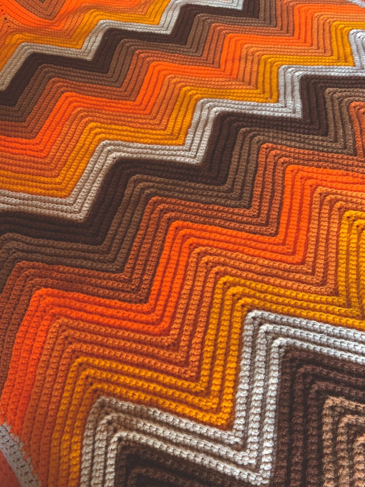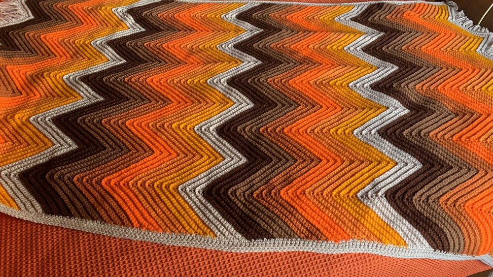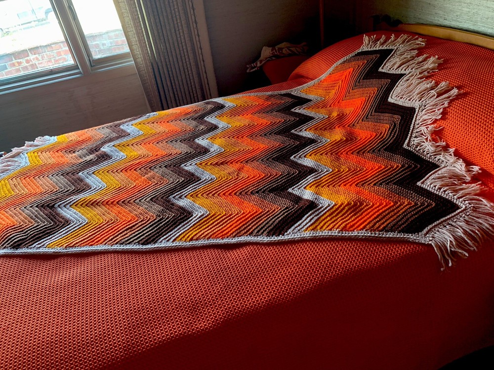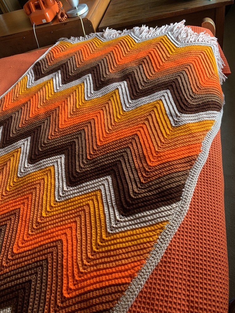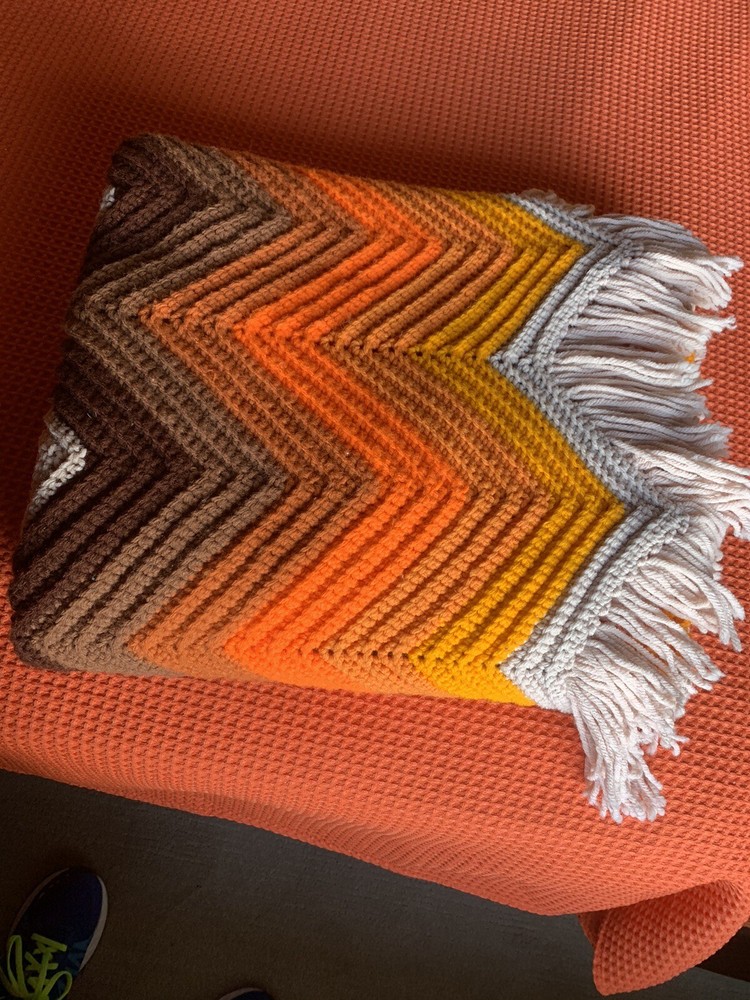 This grandma had talent ! Add a retro punch to your home decor with this beautiful zig zag afghan. The chevron pattern in shades of orange and brown, along with deluxe fringed edges, gives it a mid-century modern look. Perfect for snuggling up on the couch or as a decorative piece in any room. Approx 42x 61 inches Great condition. Vintage yarns.
