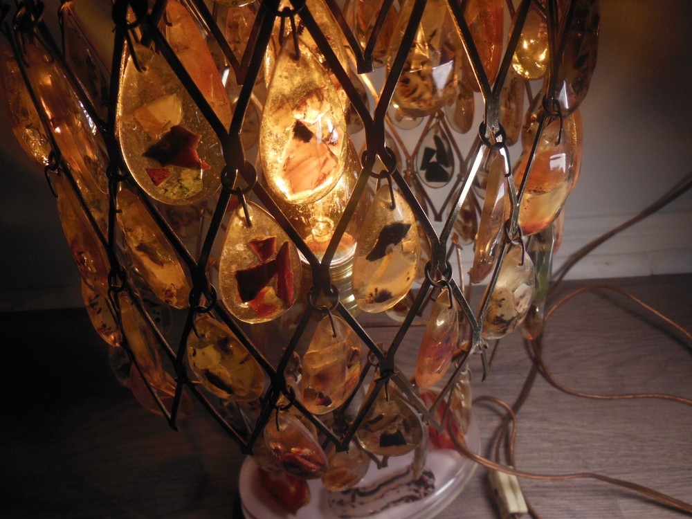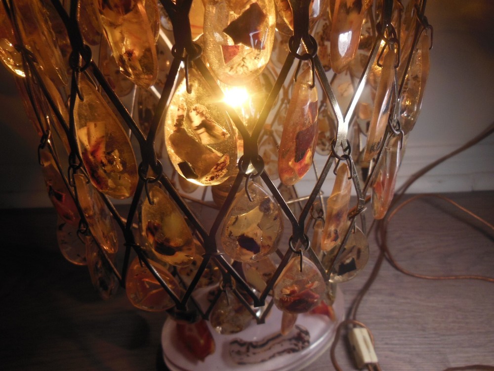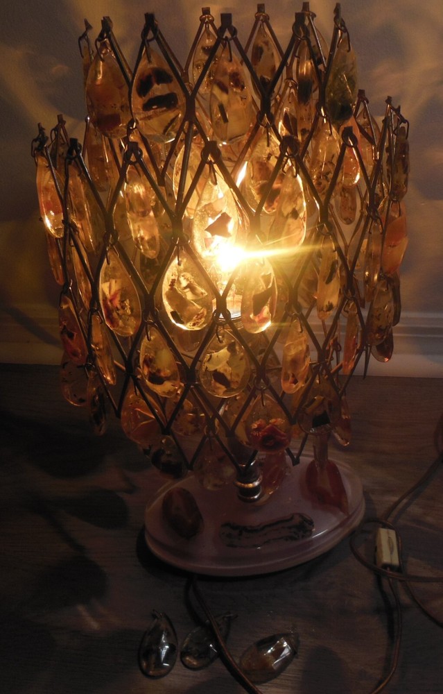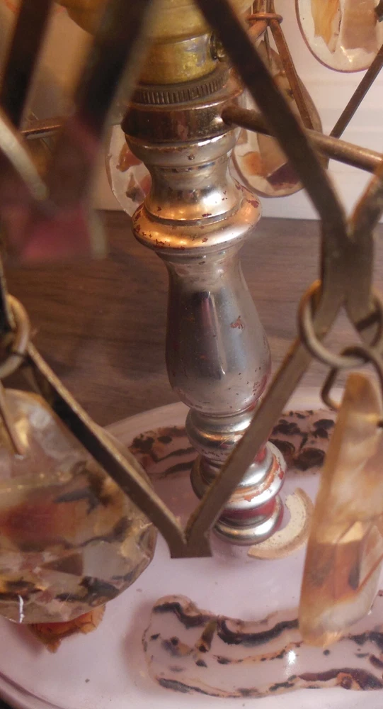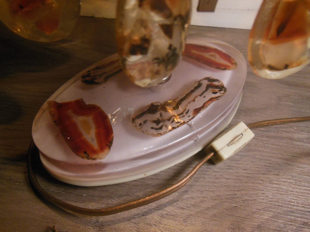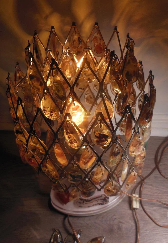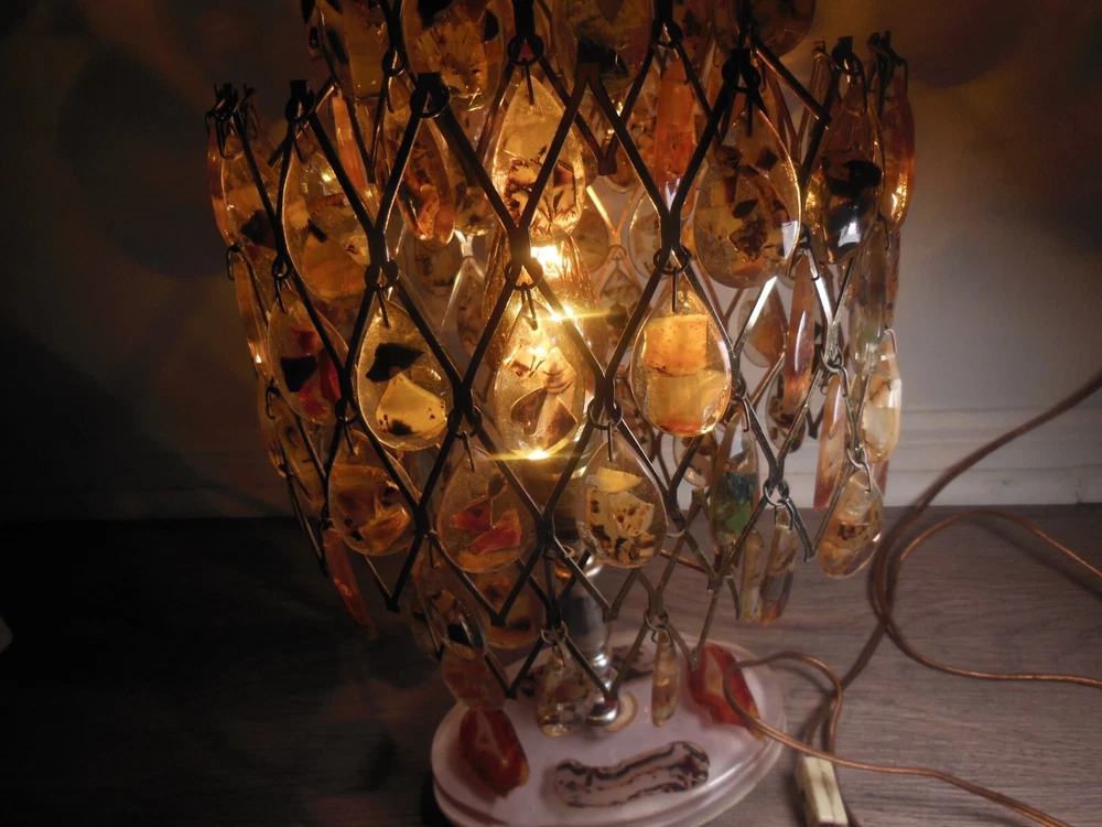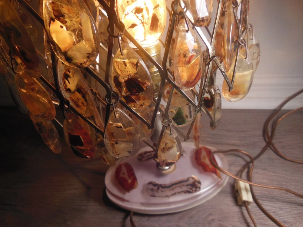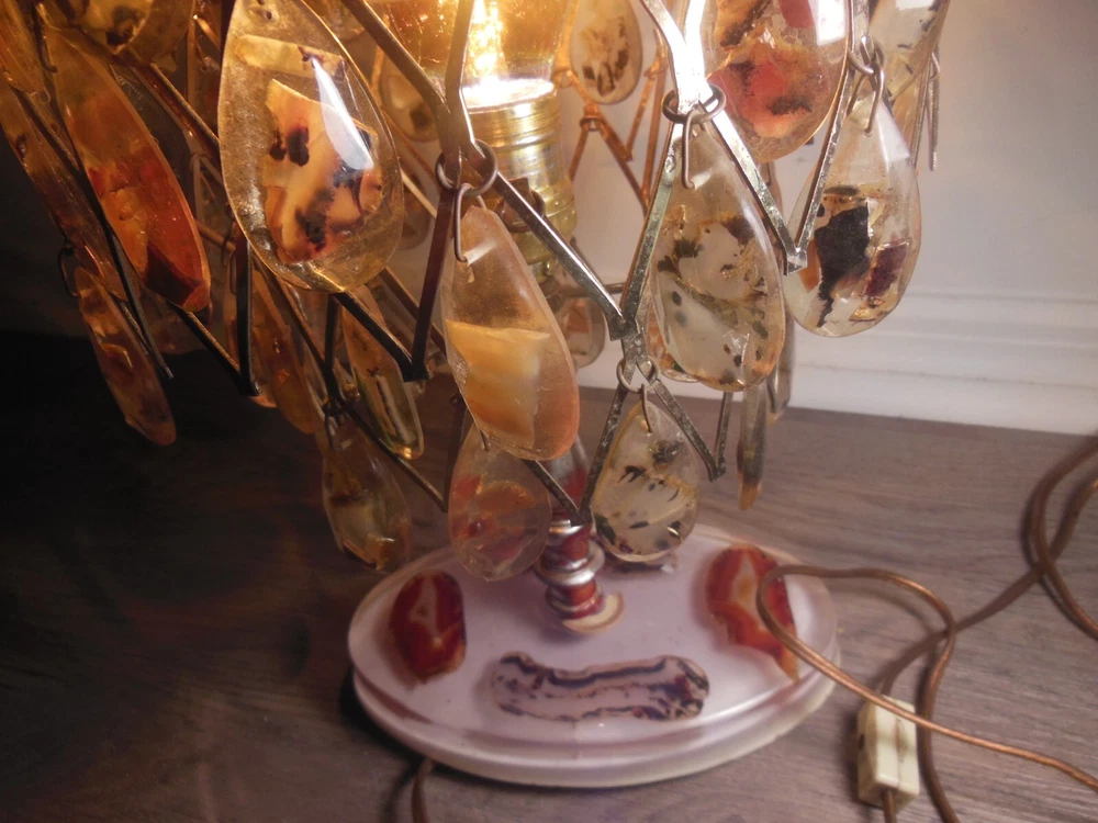 This listing is for a rare vintage lamp that has Lucite/acrylic agate filled dangles and base. Metal caged design with Montana Moss Agate in Lucite. The lamp is missing 13 of 120 dangles with 3 loose and 4 agate slabs within the acrylic base. The spacer is missing and lamp is wobbly at the base. The paint is worn and the metal looks like sterling silver but I'm not sure. This lamp needs cleaning. Light works. Please see photos for details, imperfections, and condition. Message with questions. Sold as is. No returns. Please add $14.99 shipping and handling. Shipped via USPS Ground Advantage.