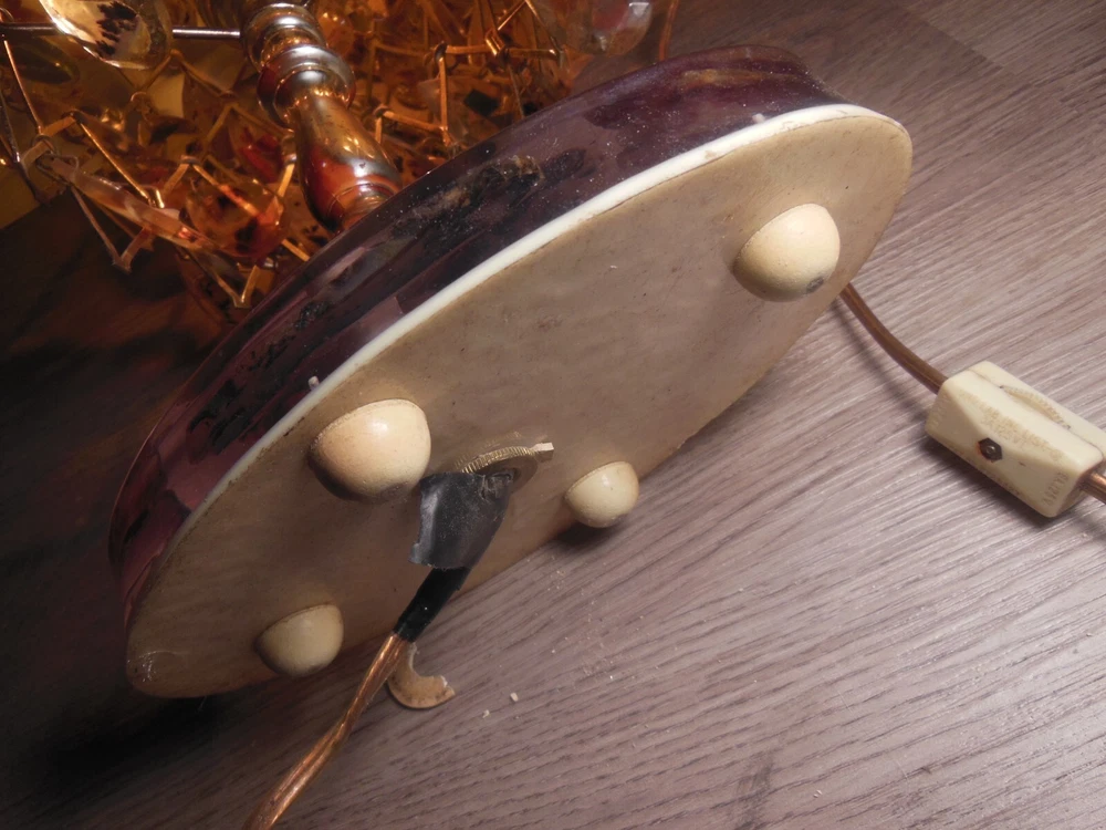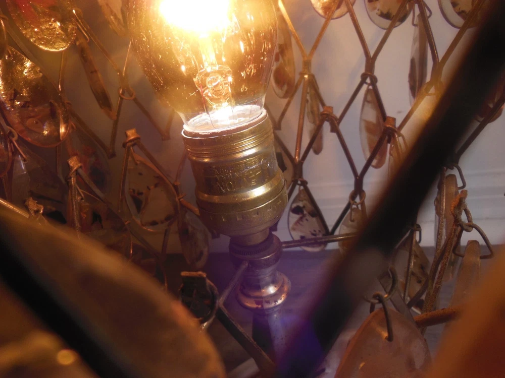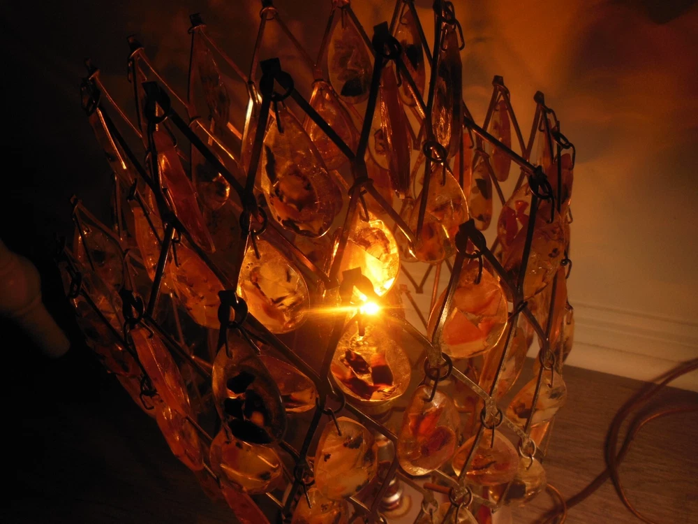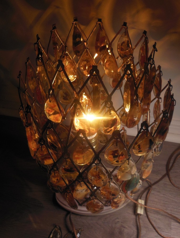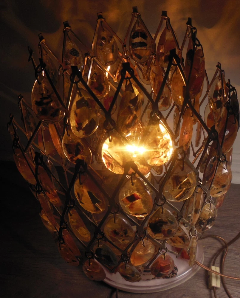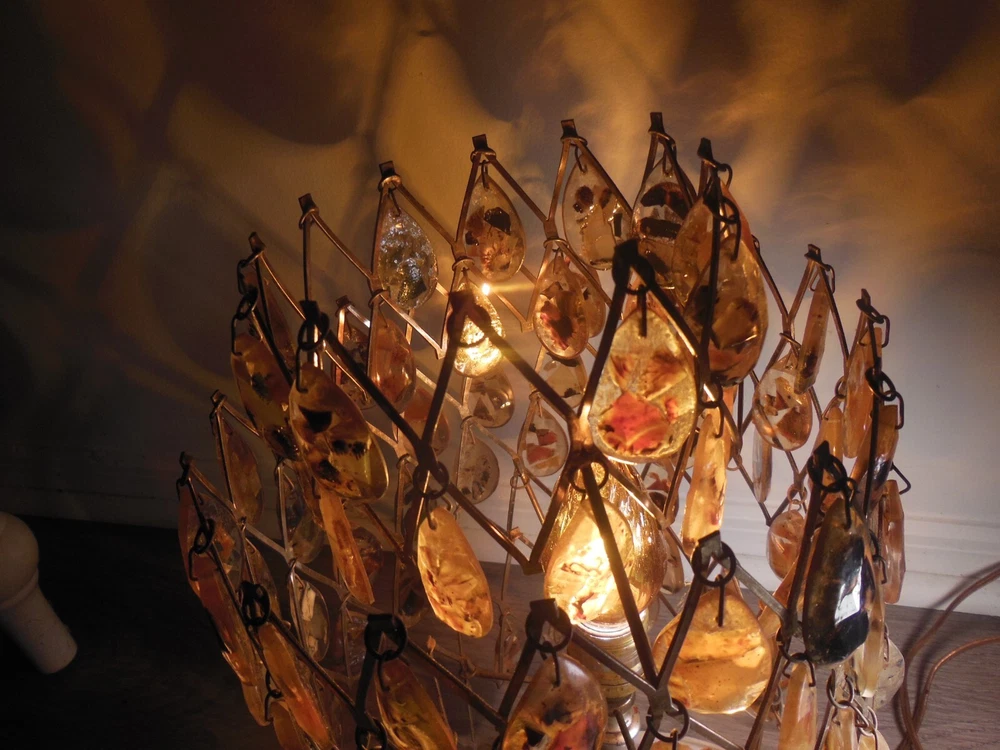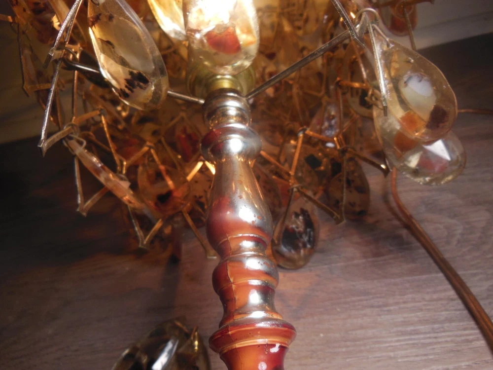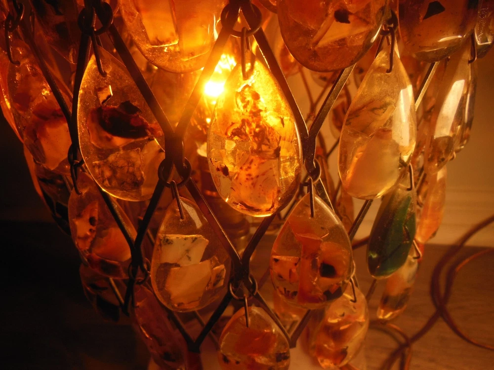 This listing is for a rare vintage lamp that has Lucite/acrylic agate filled dangles and base. Metal caged design with Montana Moss Agate in Lucite. The lamp is missing 13 of 120 dangles with 3 loose and 4 agate slabs within the acrylic base. The spacer is missing and lamp is wobbly at the base. The paint is worn and the metal looks like sterling silver but I'm not sure. This lamp needs cleaning. Light works. Please see photos for details, imperfections, and condition. Message with questions. Sold as is. No returns. Please add $14.99 shipping and handling. Shipped via USPS Ground Advantage.