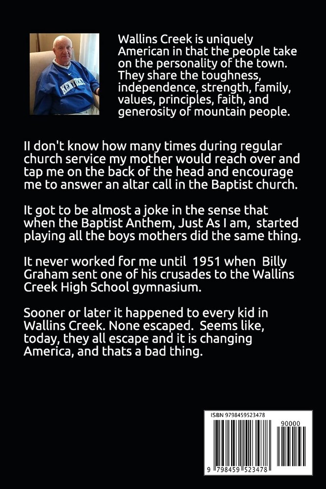 Wallins Creek: An American Town Nestled in Southeast Kentucky, by Benjamin Jones REVIEWS: "Wonderful Read! Reviewed in the United States on March 9, 2023 Easy, fun book that takes you right where the title says. Makes me want to visit now more than ever. You feel like a Creeker!" "Brings back memories of going thru on way to events .. Reviewed in the United States on October 12, 2022 My dad was born at kentenia in 1926....my mom an her mom would talk about coadiron. n Dixie town....need to go for a visit an find those places.....me I was born in Pineville an moved to Ohio when I was 3....glad I found the book an glad it is written they I heard about growing up...next time that way will have to stop instead of bypassing. "In a word ... Refreshing. Reviewed in the United States on September 17, 2021 Vivid descriptions of the folks who lived there and the treasured memories from the wholesome experiences of a pre-teen boy from Kentucky, in the 1950's. A "good read." DESCRIPTION The magic of Wallins Creek, a small town nestled in the mountains of Southeast Kentucky, is that it becomes an integral part of us. The cool water streams down from our majestic mountains into a creek that travels through our little town and mysteriously works its way into our DNA. This incredible "state of mind" passes down from one generation to the next. It transforms us all into Creekers. Some stay and others scatter across America. We all come back often to commune with the streams, the mountains, and our people. This, along with the values and principles learned in Wallins Creek makes us all uniquely, American Creekers. This book chronicles the first 13 years of my life growing up in Wallins Creek and the impacts it has 66 years later. Roger and I give you stories and information from fellow Creekers to give you glimpses of life in a small American town in the 1950's that exemplifies the tough, ingenious, honor, family, independence, strength and pure goodness of mountain people. Autographed by author, Benjamin Jones