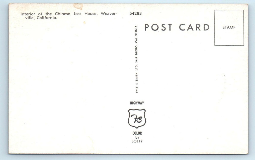 Please Add me to your Favorite Sellers and feel free to email me with questions about item conditions as I try to describe them accurately. Please Visit My eBay Store, new items are added every week. All of our postcards are vintage antique postcards - we don't sell copies or reproductions (unless Repro is in title). FREE SHIPPING within the U.S. - International Buyers pay $2.00 shipping. WEAVERVILLE, CA ~ CHINESE JOSS HOUSE Interior c1950s Trinity County Postcard WEAVERVILLE, CA ~ CHINESE JOSS HOUSE Interior c1950s Trinity County Postcard Click image to enlarge Description Please Add me to your Favorite Sellers and feel free to email me with questions about item conditions as I try to describe them accurately. Please Visit My eBay Store , new items are added every week. All of our postcards are vintage antique postcards - we don't sell copies or reproductions (unless Repro is in title). FREE SHIPPING within the U.S. - International Buyers pay $2.00 shipping. Get images that make Supersized seem small. Showcase your items with Auctiva's Listing Templates! THE simple solution for eBay sellers. Track Page Views With Auctiva's FREE Counter
