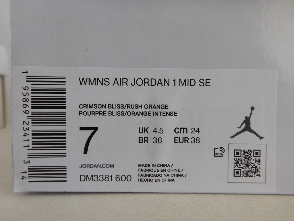 Women's NIKE AIR JORDAN 1 MID SE Features 100% AUTHENTIC BRAND NEW IN BOX. COLOR: Crimson Bliss-Rush Orange Fantastic heel cushioning for optimum performance Size & Style Info Women's SIZE 7 US INTERNATIONAL SIZES: (4.5 UK) (38 EU) (24 CM) Style # DM3381 600 Shipping We ship within 1-2 business days (excludes Saturday, Sunday, and holidays) from receipt of payment All domestic items are shipped USPS Priority Mail (Free shipping in the USA) We do ship to APO/FPO and Post Office box addresses We do ship to Alaska and Hawaii Tracking will be sent for all purchases within 24-48 hours Payment We accept payment by PayPal and credit card through PayPal Immediate payment is required Returns We offer a 30 day (after payment) 100% money back guarantee. Buyer pays return shipping All items MUST be in the original shipping condition for a refund. We inspect all returned items before a refund or exchange is given. Signs of wear and/or damage will not qualify for a refund or exchange Customer support Emails are answered within 48 business hours (this excludes weekends, and or holidays) Please contact us only through eBay "My Messages" Why NYZCORP ? 100% Authentic Nike products Unique, hard to find items 100% positive feedback Lightning fast shipping Thank you for visiting and shopping with Nyzcorp!! Have a wonderful day!