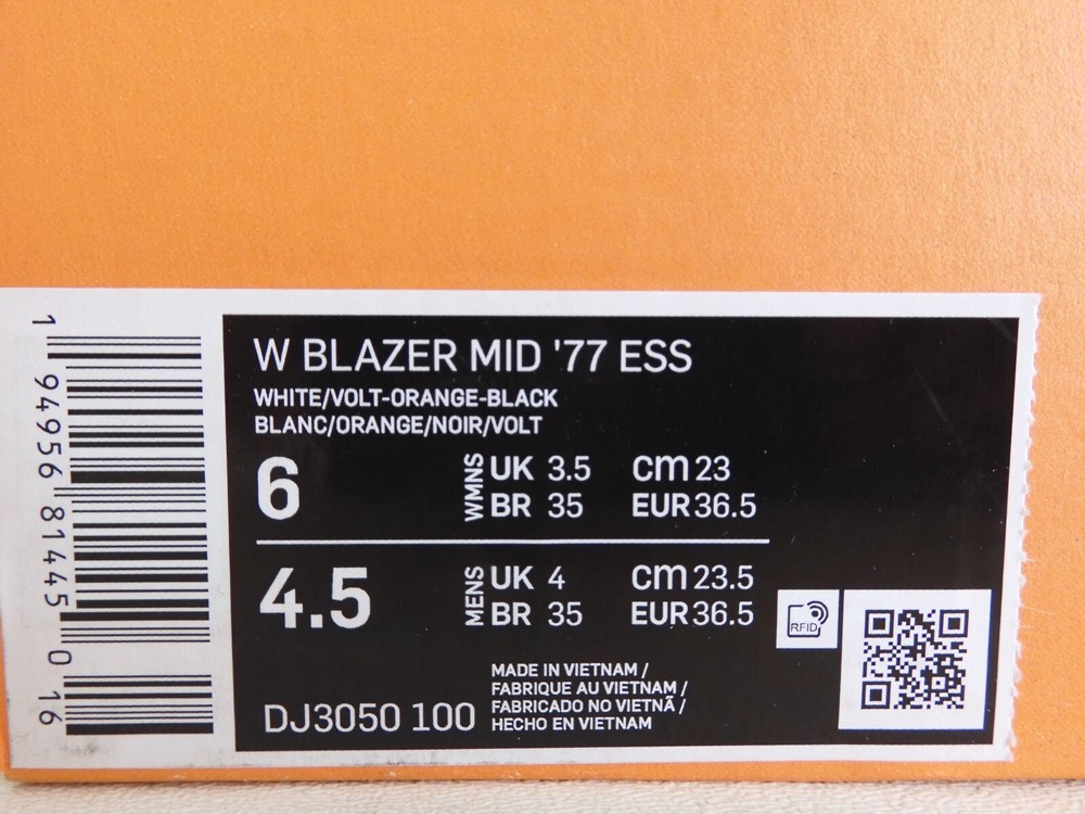 Women's NIKE BLAZER MID 77 ESSENTIAL Features 100% AUTHENTIC BRAND NEW IN OPEN TOP BOX. COLOR: WHITE-VOLT-ORANGE-BLACK Amazing running shoes or casual shoes Features a cool plain, but standout colorway Size & Style Info SIZE 6 WOMENS US INTERNATIONAL SIZES: (3.5 UK) (36.5 EU) (23 CM) Style # DJ3050 100 Shipping We ship within 1-2 business days (excludes Saturday, Sunday, and holidays) from receipt of payment All domestic items are shipped USPS Priority Mail (Free shipping in the USA) We do ship to APO/FPO and Post Office box addresses We do ship to Alaska and Hawaii Tracking will be sent for all purchases within 24-48 hours Payment We accept payment by PayPal and credit card through PayPal Immediate payment is required Returns We offer a 30 day (after payment) 100% money back guarantee. Buyer pays return shipping All items MUST be in the original shipping condition for a refund. We inspect all returned items before a refund or exchange is given. Signs of wear and/or damage will not qualify for a refund or exchange Customer support Emails are answered within 48 business hours (this excludes weekends, and or holidays) Please contact us only through eBay "My Messages" Why NYZCORP ? 100% Authentic Nike products Unique, hard to find items 100% positive feedback Lightning fast shipping Thank you for visiting and shopping with Nyzcorp!! Have a wonderful day!