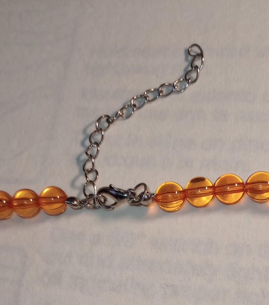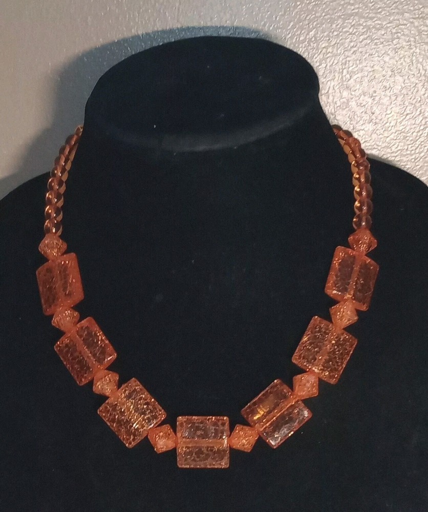 Add a pop of color to your outfit with this stunning women's necklace. The necklace features a lobster closure and measures 19 inches in length. The orange crackle beaded necklace is perfect for any occasion, whether it be a Christmas, graduation, birthday, or Valentine's Day gift. The retro style and vintage era make it a unique addition to your jewelry collection. The necklace is made of crackle plastic beads. It is not signed, but its pretty and fashionable design speaks for itself. Get ready to turn heads with this gorgeous beaded necklace.