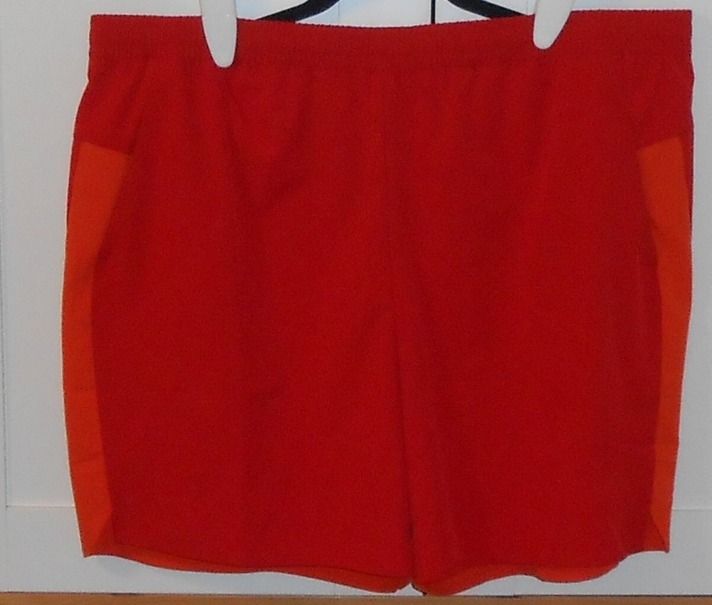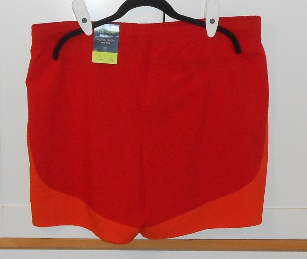 WOMEN'S TEK GEAR RED WITH ORANGE SIDE TRIM MID-RISE WOVEN TRAINING SHORTS - SIZE XXLARGE - ELASTICIZED WAIST WITH INTERIOR DRAWSTRING - ON SEAM SLASH POCKETS IN FRONT - HIDDEN ZIPPER POCKET IN BACK - VENTED SIDES MEASUREMENT FOR WAIST FROM SIDE TO SIDE UNSTRETCHED IS APPROXIMATELY 21" - THE RISE IS APPROXIMATELY 13 1/4" EMAIL ME WITH ANY QUESTIONS THANKS FOR LOOKING SMOKE FREE HOME I DO COMBINE SHIPPING