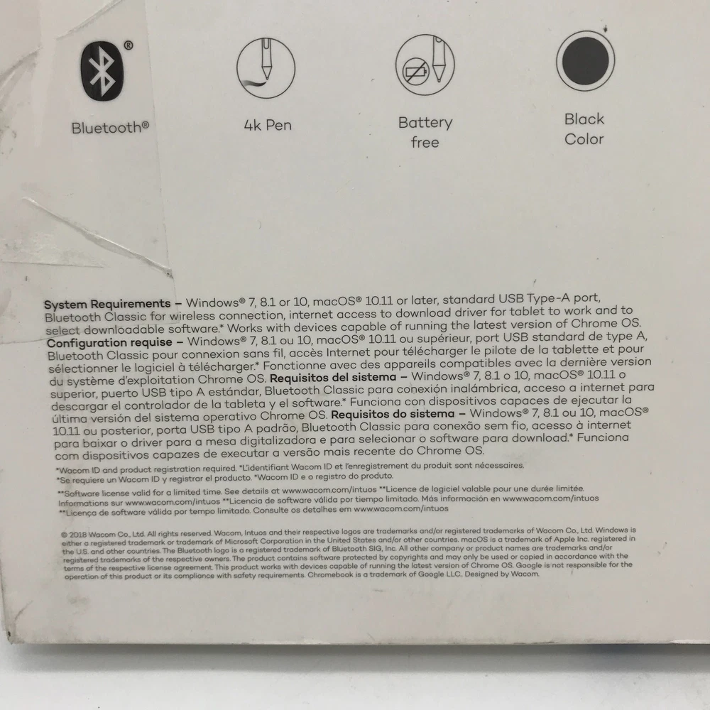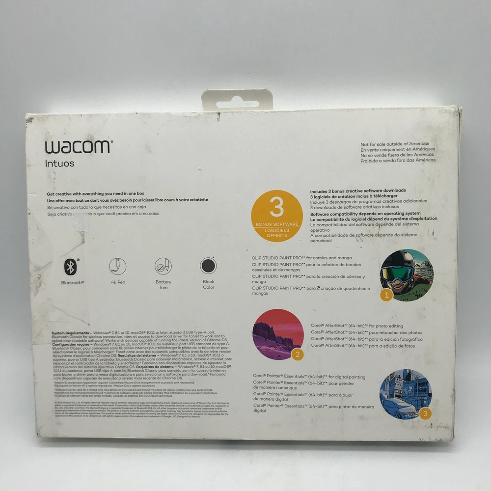 IMPORTANT: Please review ALL photos carefully as the condition is shown in the photos. You will receive exactly what is pictured unless otherwise noted and not including photo props (if applicable). Wacom Intuos Bluetooth Creative Pen Drawing Tablet Model CTL-6100WL CONDITION: Open box, good (see photos) Normal wear (see photos) A few scuffs (see photos) Box is in rough shape (see photos) DETAILS SIZE: 10.4" x 7.8" FEATURES: Wacom Intuos Creative Pen Tablet Model CTL-6100WL Bluetooth 4K Pen Batteries not needed Black Includes 3 bonus creative software downloads: Clip Studio Paint Pro for comics and manga, Corel AfterShot for photo editing, Corel Painter Essentials for digital painting Copyright 2018 Wacom Co. See back of box for system requirements Questions? Message us. We will respond as quickly as possible. We make every reasonable effort to inspect items and describe / photograph them accurately. However, we are human and may miss flaws now and then. Therefore, we offer 30-day returns on most items.