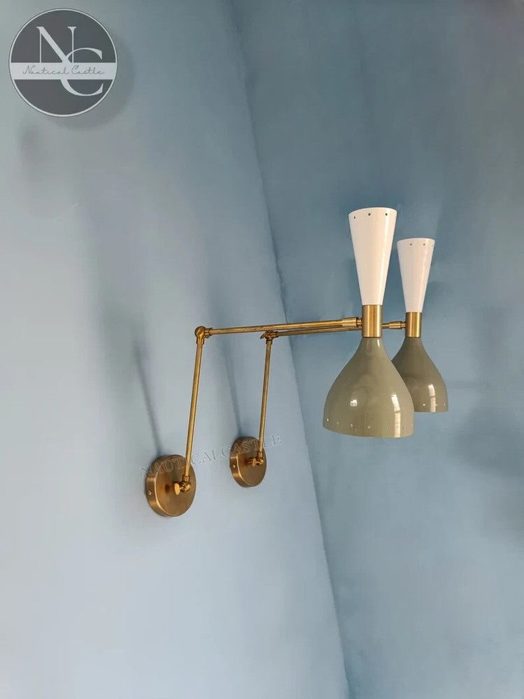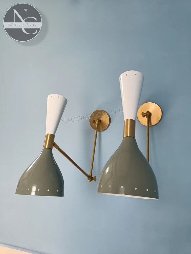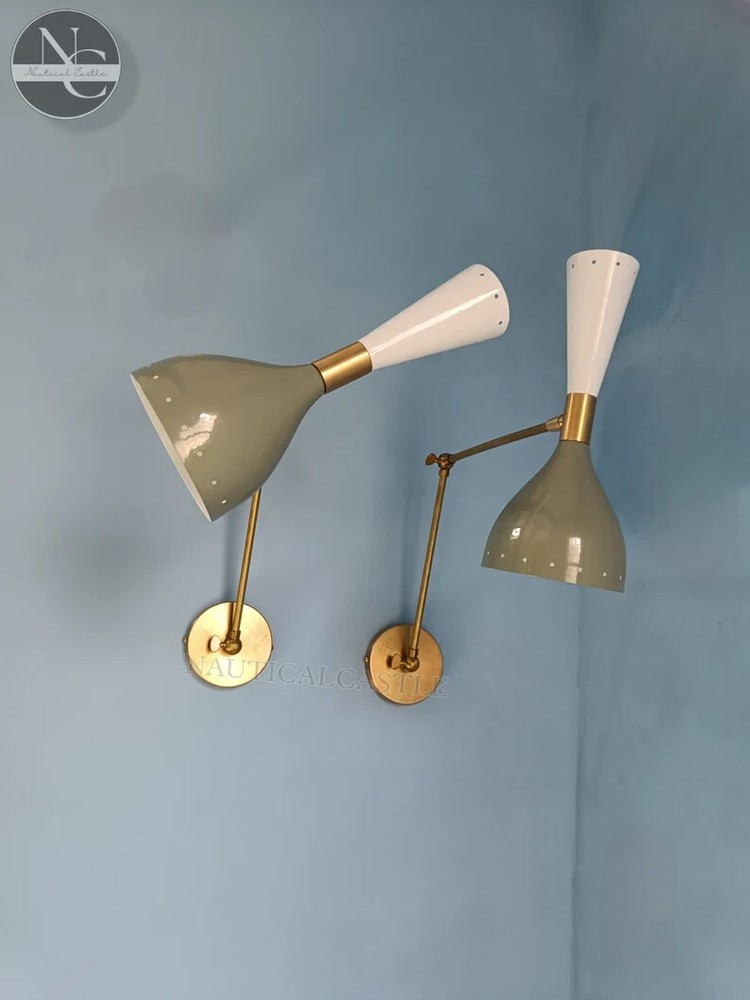 Width: 5 inches Height: 10.5 inches Depth: 8 inches Wall Sconce Diabolo Pair of Modern Italian Wall Lights Orange Wall Fixture Lamps. PRODUCT DETAILS:- Wall Sconce Diabolo Pair of Two Modern Italian Wall Lights Black & White Wall Fixture Light . This is Stilnovo Style light fixture is made with UL approved parts. It has 1 arms/lights and measures 5" in diameter without light bulbs. It uses standard sconce socket light bulbs. We recommend 15W to 40W max. Light bulbs are not included. Wall canopy can be adjustable at different angles so you can mount this sconce. We hand craft all of our light fixtures. This chandelier has been made with brass material. Minor variations in finish are an inherent characteristic of such material and add to the beauty and uniqueness of the product. PRODUCT SPECIFICATIONS: • Premium quality mid-century Wall Fixture. • Made of pure brass brass shiny finish . other brass finishes are available at request. • Measurements is :L x 10.5 inch B x 5'' inch H x 8'' inch Wall canopy To Light Socket Edge • Set of Two Diabolo Wall Fixture • Grey White, Brass, Glass Finish • Wall Fixture used standard sconce E-12 or E-14 light bulbs. (not included) • Canopy 4 Inches • This Is Reproduction Production Not Sold Antique. MATERIALS: • Brass And Iron • All Components are UL approved. BULB TYPE: • Requires Four (4) 15 watt bulb type A (not included). • E-12 or E-14 socket Rated with 125 voltage, 75 watt max. • 7 watt to 15 watt bulbs are recommended. • These Wall Sconce Use Incandescent Bulbs, Energy Saying, LED Bulbs.