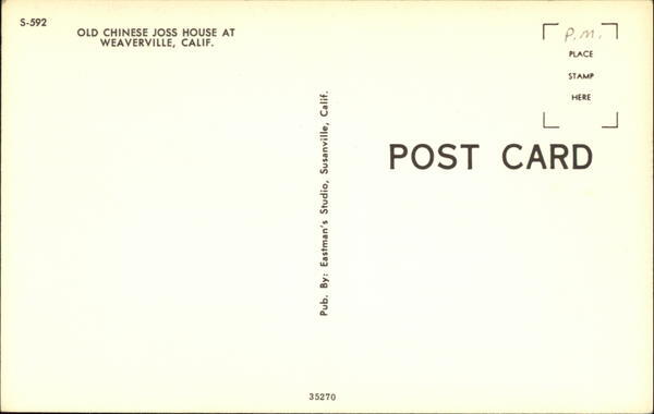 Title: Old chinese Joss House City/State: Weaverville,CA (California) County: Trinity Type/Era: Postcard, Chrome Publisher: Eastman's Studio Size (approx.): 3.5" x 5.5" (9 x 14 cm) Categories: US State & Town Views/California/Weaverville Cardcow id: 259419, /images/set342/card00290 View our other listings from CALIFORNIA ! FREE SHIPPING (US addresses) for this card We ship all cards in clear archival-quality , pvc-free, acid-free sleeves. Frequently Asked Questions How quickly do orders ship? Most first class orders currently ship within a week. For time-sensitive orders you can select Priority shipping which will usually mail within 1-2 business days via USPS Priority Mail. Please send a direct message after checkout if there is some time-urgency for your order. Do you buy collections? Yes, we're always looking to buy quality collections, accumulations, and albums of postcards, trading cards, and other ephemera. When is payment due? Payment is due within 7 days. Can you leave me feedback? We automatically post feedback when buyers leave positive feedback. What are the dimensions of this postcard? The size is listed above in the listing attributes. We typically round sizes to the closest 1/4" so actual size may vary slightly, but size shown is usually quite accurate. International Buyers Please Note: Country-specific Import duties, taxes, and charges are not included in the item price or shipping cost. These charges are the buyer's responsibility. Please check with your country's customs office to determine what these additional costs will be prior to bidding or buying. Text from card (OCR/Computer Generated, may not be accurate so check the images above): 商普需 德課 S-592 OLD CHINESE JOSS HOUSE AT WEAVERVILLE, CALIF. remiz , 7 Pub. By: Eastman's Studio, Susanville, Calif. 35270