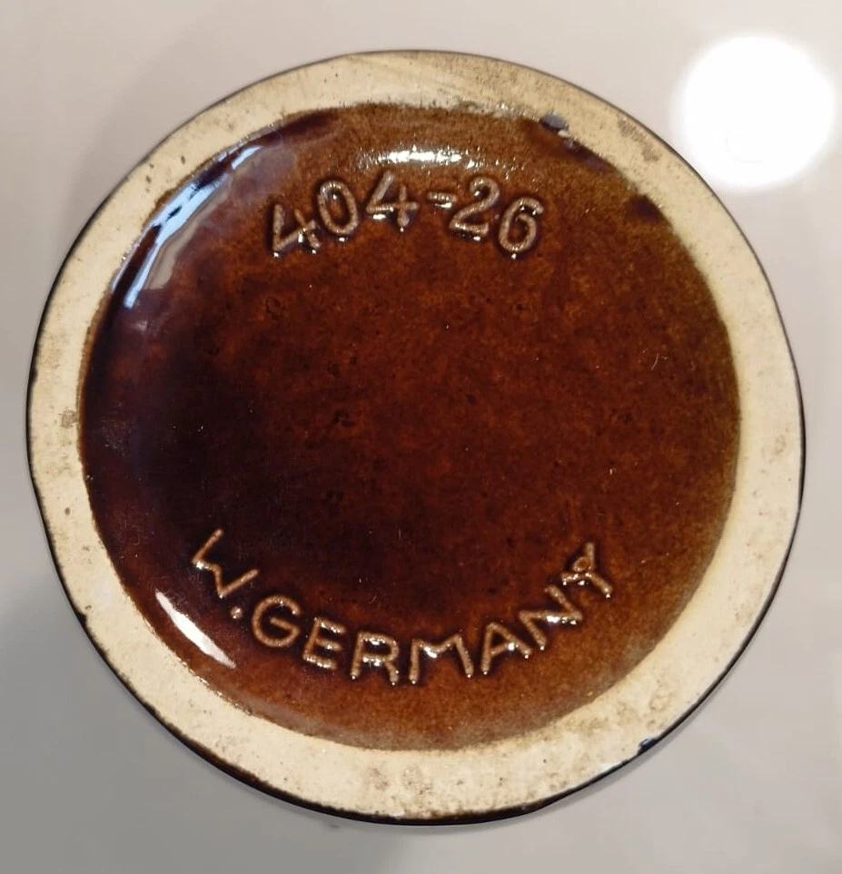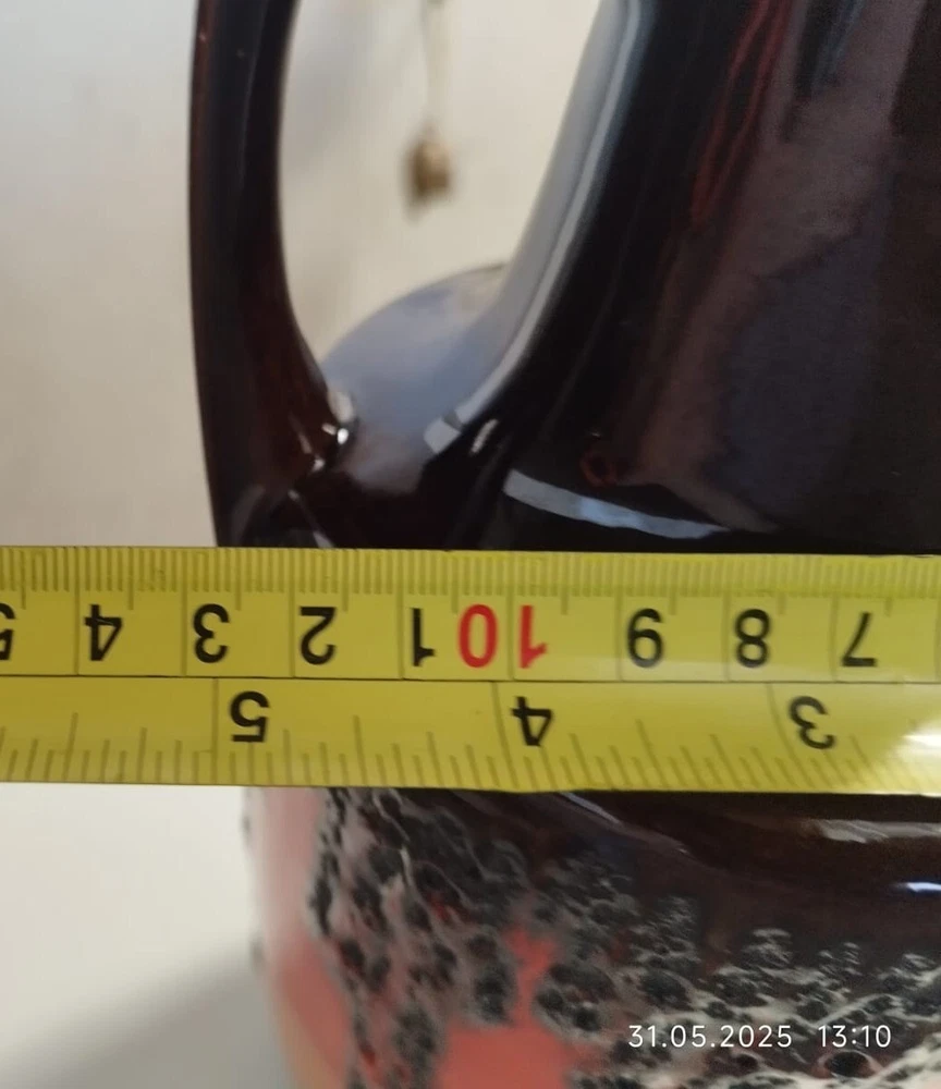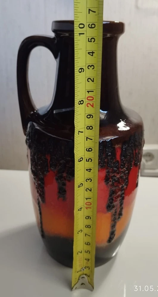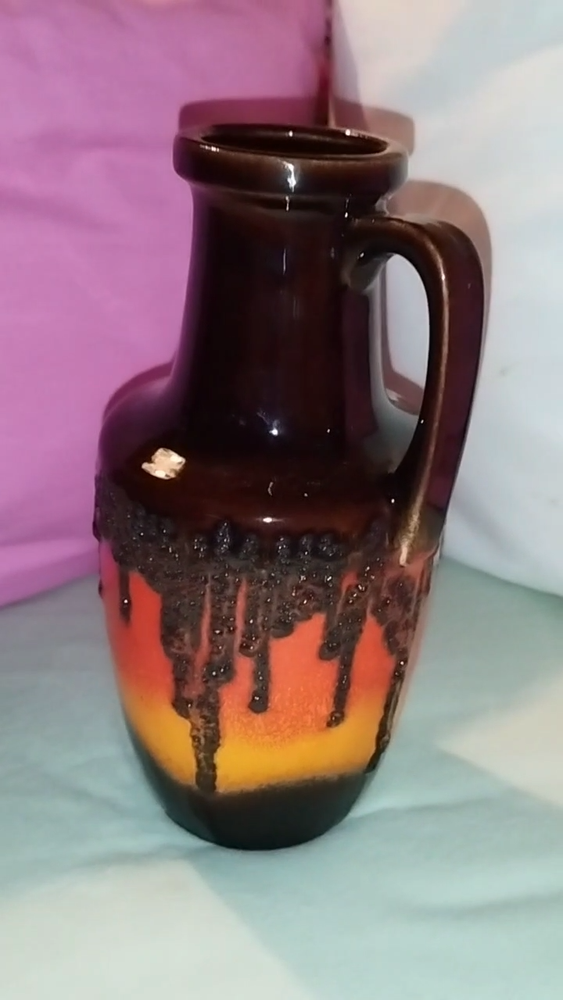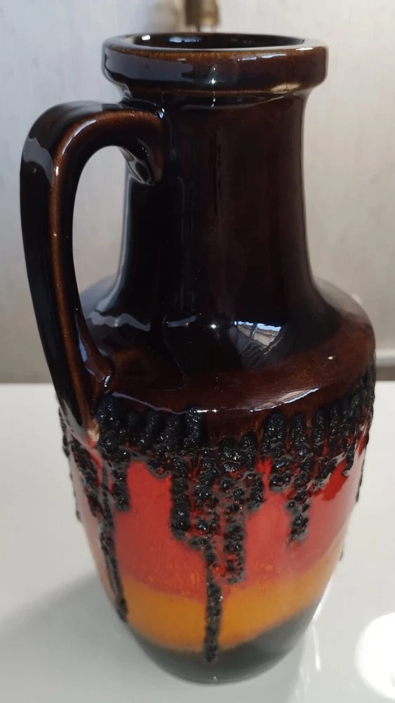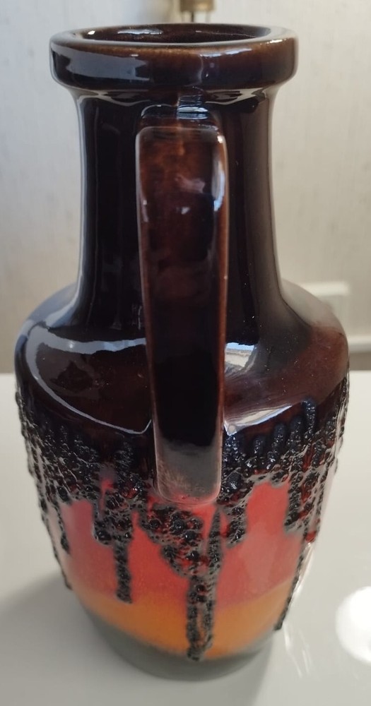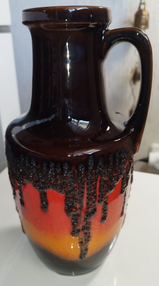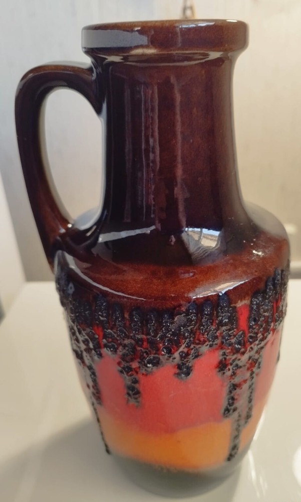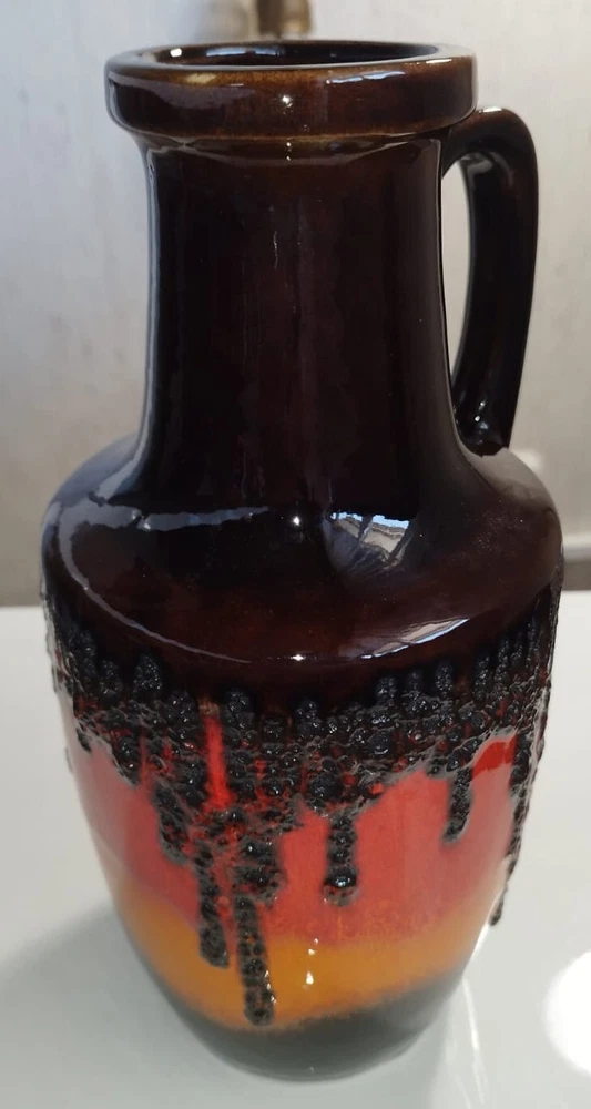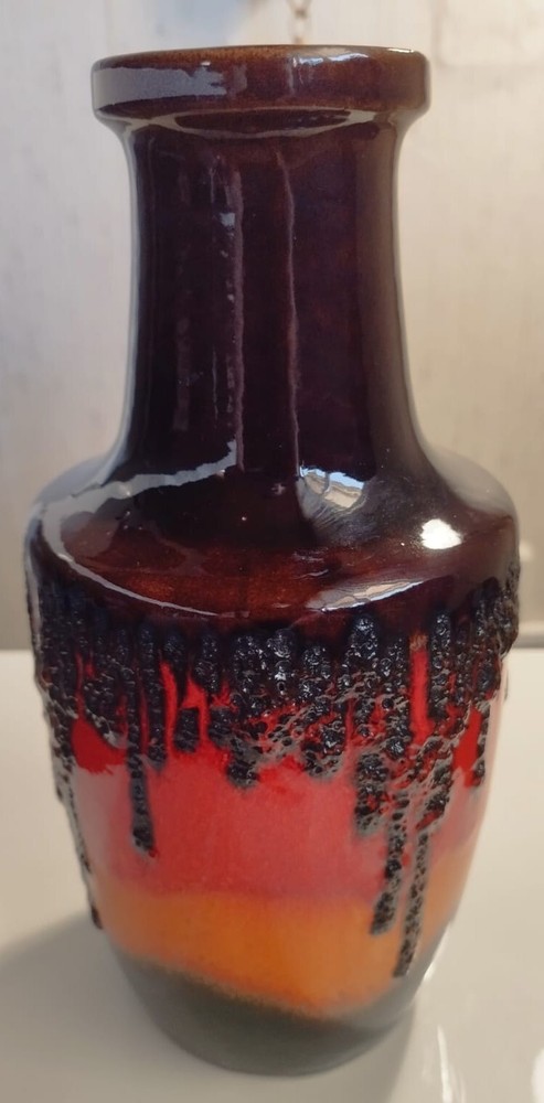 Original West German pottery vase by Scheurich, model 404-26. Features glossy chocolate-brown glaze at the top, flowing into vibrant orange and red lava texture with volcanic black accents. Height: 26 cm (approx. 10.2 in), Diameter: ~12 cm. Marked “404-26” and “W. Germany” on the base. Excellent vintage condition – no chips, cracks, or repairs. Minor age wear consistent with vintage ceramics. Carefully packed and shipped from Germany. Shipping cost included. Shipping time: 10 to 16 days. Perfect for mid-century, retro, or eclectic interiors.