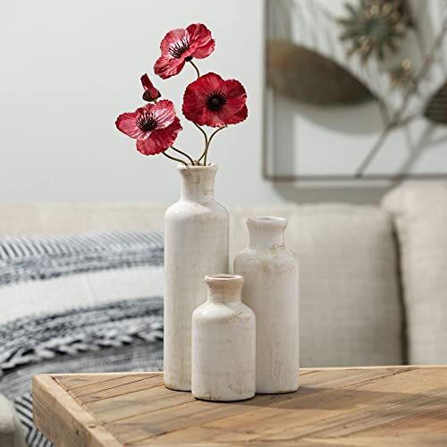 Absolutely love this set! The distressed white finish gives a charming rustic look, perfect for farmhouse or coastal decor. Each vase is well-made with a nice weight, and the different sizes add versatility—great for flowers or standalone decor. The ceramic feels durable, and the set is a fantastic value. Would buy again!