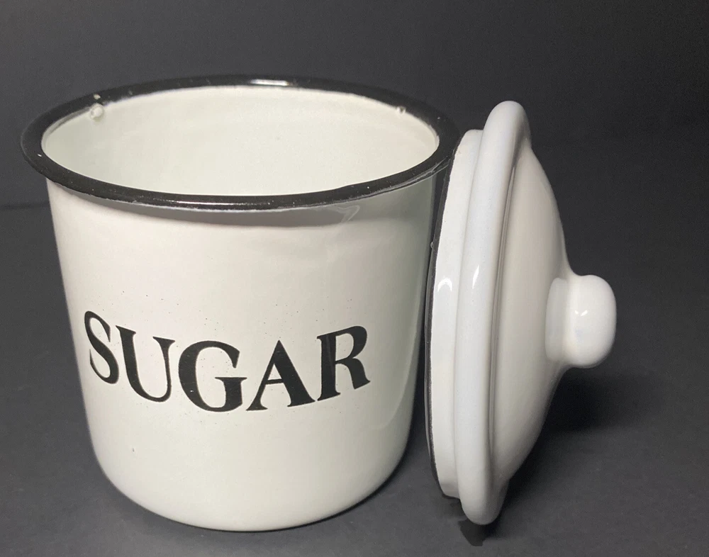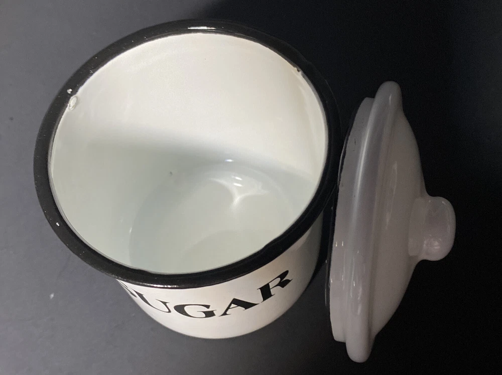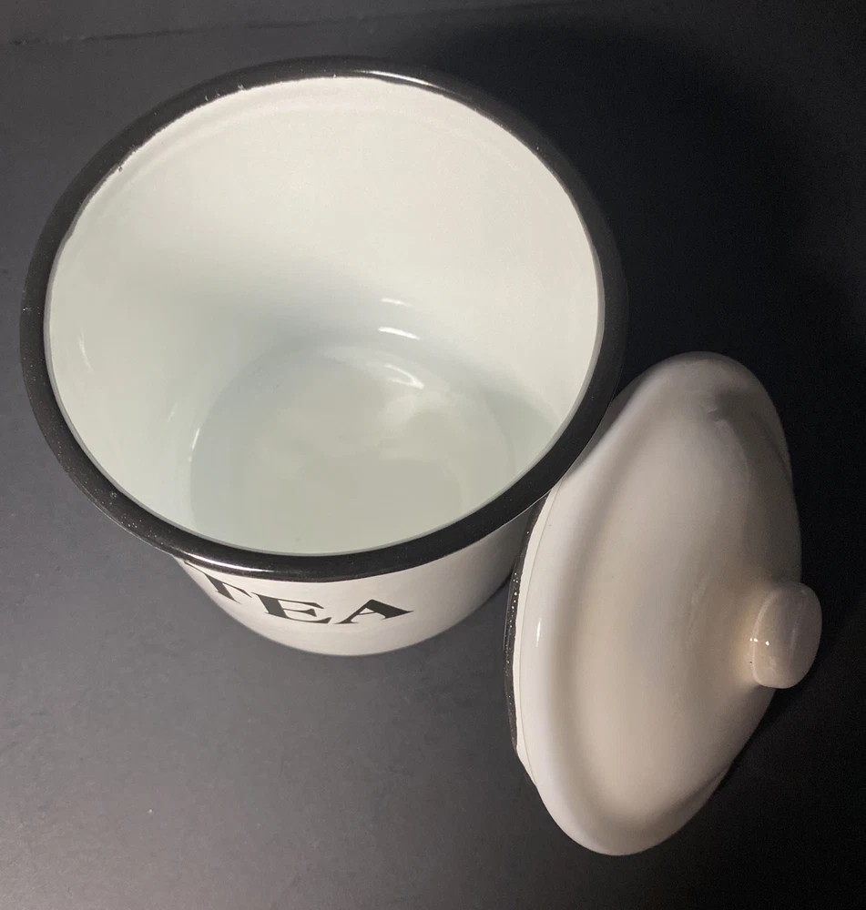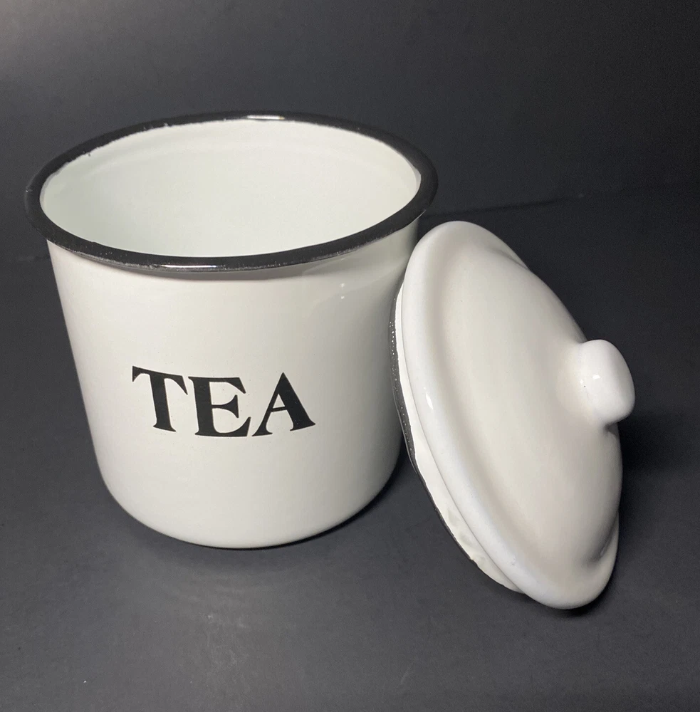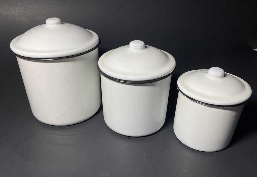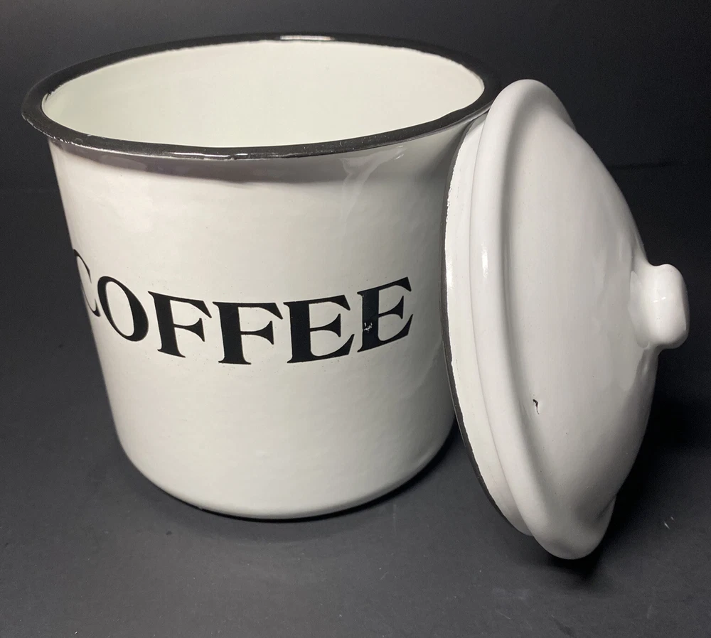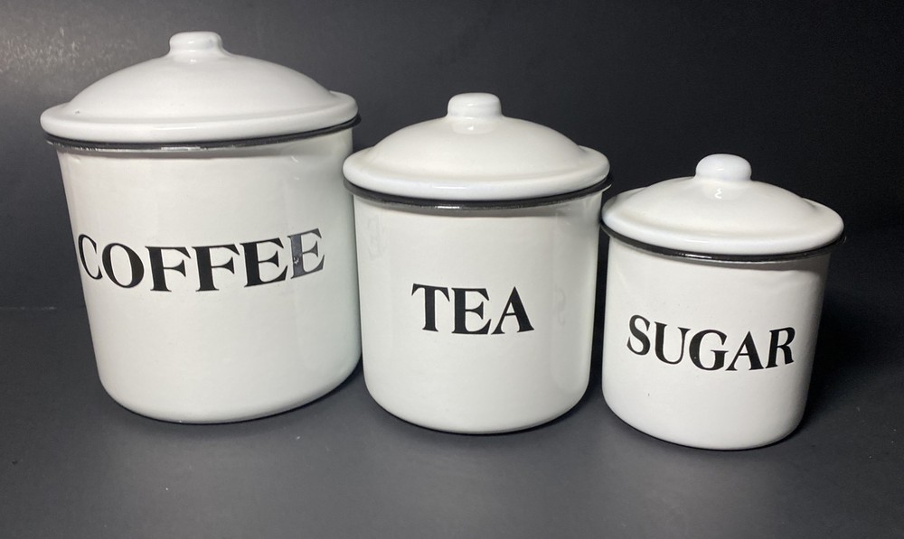 Pre-owned Excellent Condition Creative Co-op White Metal and Enamel Canisters with Lids Set of 3 Canisters + Lids (Labeled as Coffee, Tea, and Sugar in black lettering ) Small chippy appearance is part of the “farmhouse look” Perfect for small countertop areas! Coffee canister measures: 6.25" H x 5.25" W. Tea canister measures: 5" H x 4.5" W. Sugar canister measures: 4.25" H x 3.25"W Please see photos! CLEAN Smoke free home Please ask any questions prior to bidding or purchase! All Sales Final No Returns Thank you! Please be sure to check out my other listings! 😊