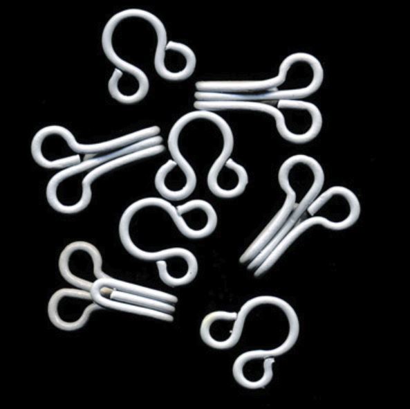 Top Quality Hooks and Eyes Up for sale is this packet of white hooks and eyes size 1. Ideal where a smaller hook and eye is needed. There are 14 sets in the re-sealable plastic pack. Size 0 Length of Hook: 8.4mm Width of hook (at widest edge): 6.5mm Length of Eye ; 5.7mm Width of Eye: 7.3mm Size 2 Length of Hook: 10.2mm Width of hook (at widest edge): 7.2mm Length of Eye ; 7.9mm Width of Eye: 8mm Please feel free to email if you have any questions. We're more than happy to combine purchases to save on postage costs. Happy Buying!! Stock code 51466