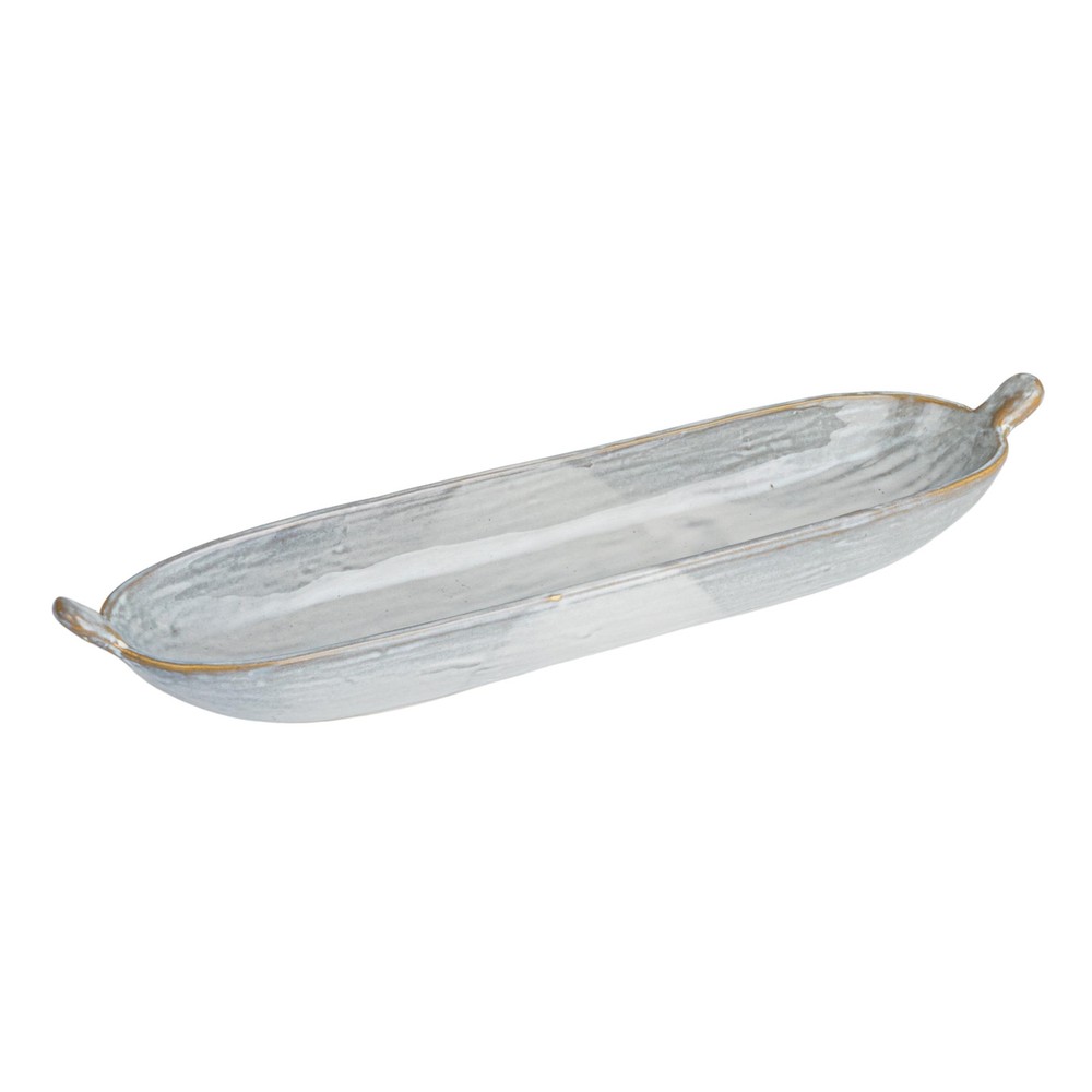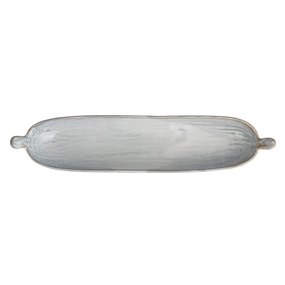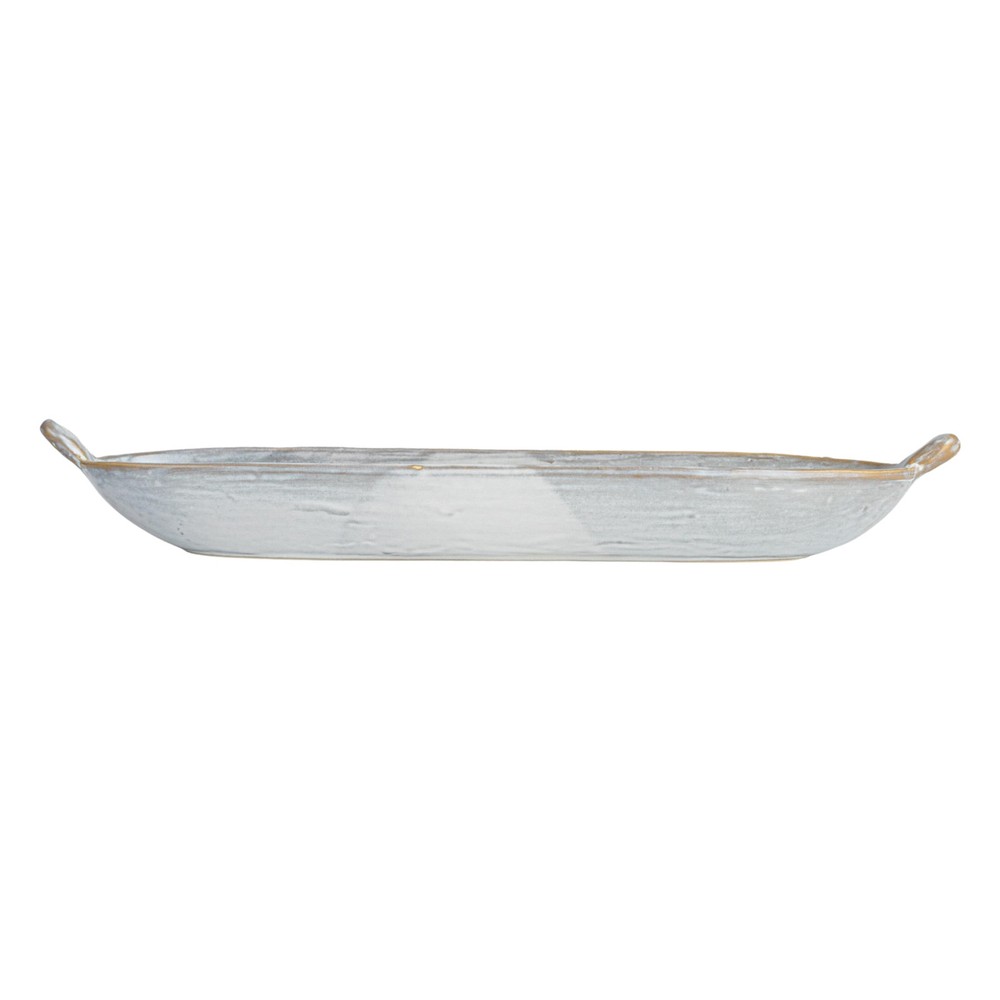 This 13.25-inch long and 2-inch high Stoneware Dish is a versatile culinary companion that marries functionality with aesthetic charm. The oval shape is complemented by practical handles and a reactive glaze that gives each dish a -of-a-kind look. Its generous dimensions make it ideal for serving a variety of dishes, while the white color ensures it will coordinate beautifully with any table setting. Whether the home style is rooted in the rustic simplicity of the farmhouse, the sleek lines of contemporary design, the timeless allure of French country, or the adaptability of transitional decor, this stoneware dish is sure to become a cherished part of every dining collection. A pristine white stoneware dish, accentuated with reactive glaze, that offers a touch of elegance with its functional handles An ideal addition to any farmhouse, contemporary, French country, or transitional styled dining ensemble This dish is designed for both serving and presentation, enhancing the visual appeal of any culinary creations Made of high-quality stoneware with a reactive glaze finish, ensuring durability and a unique touch to each piece 13.25” L x 2” H