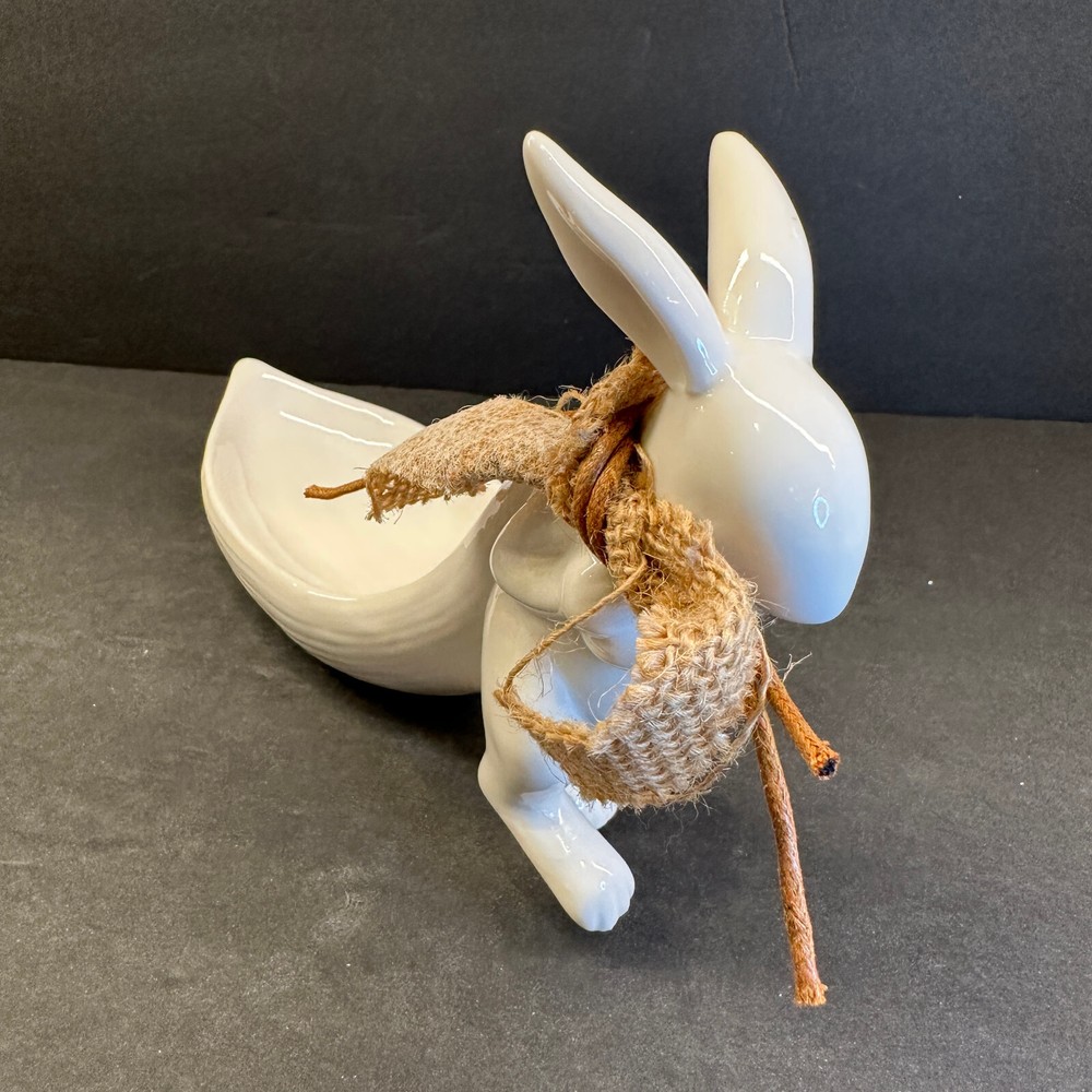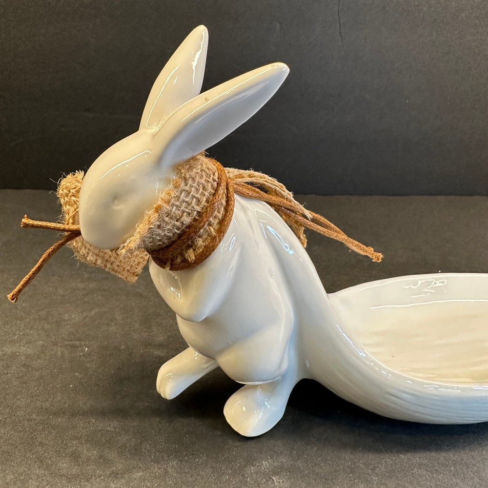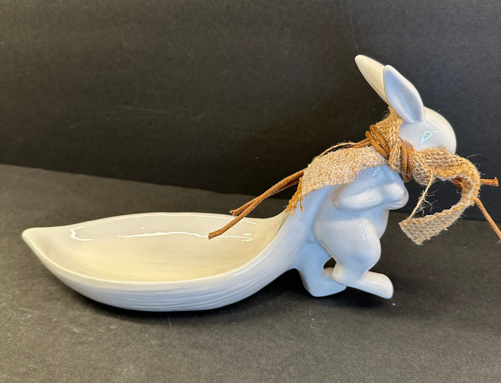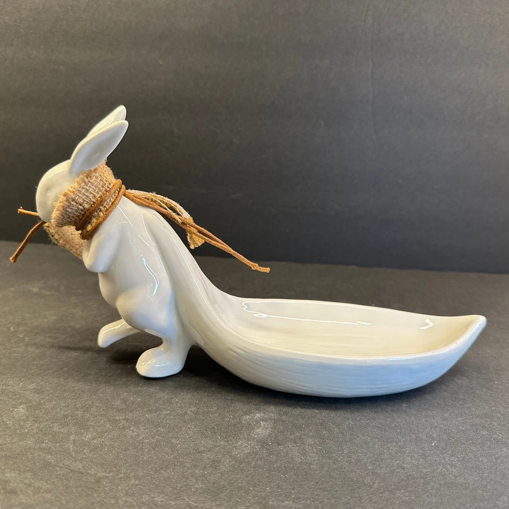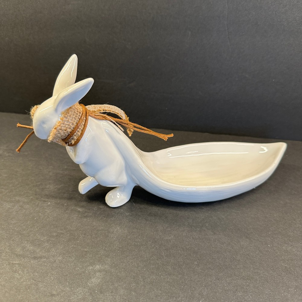 White Stoneware Bunny Rabbit Pulling Leaf Shaped Trinket / Candy Dish - Creative CoOp Made with stoneware Approximately 9.5"L x 3"W x 5.5"H Leaf Shaped Tray approximately 6"L x 2.75"H Excellent preowned condition. Most of the items I sell are estate or thrift store finds, and are presented to you in as is, as found condition. They are described to the best of my knowledge. Some wear is to be expected, unless described as flawless or mint. Because of their age, items may have some imperfections such as minor scratches, rim wear, light staining, and/or minor crazing. I try to describe each item accurately and list all known flaws or damage, however I could miss something. Please look closely at all the photos for condition as they are considered to be part of the description and email with any questions before buying.
