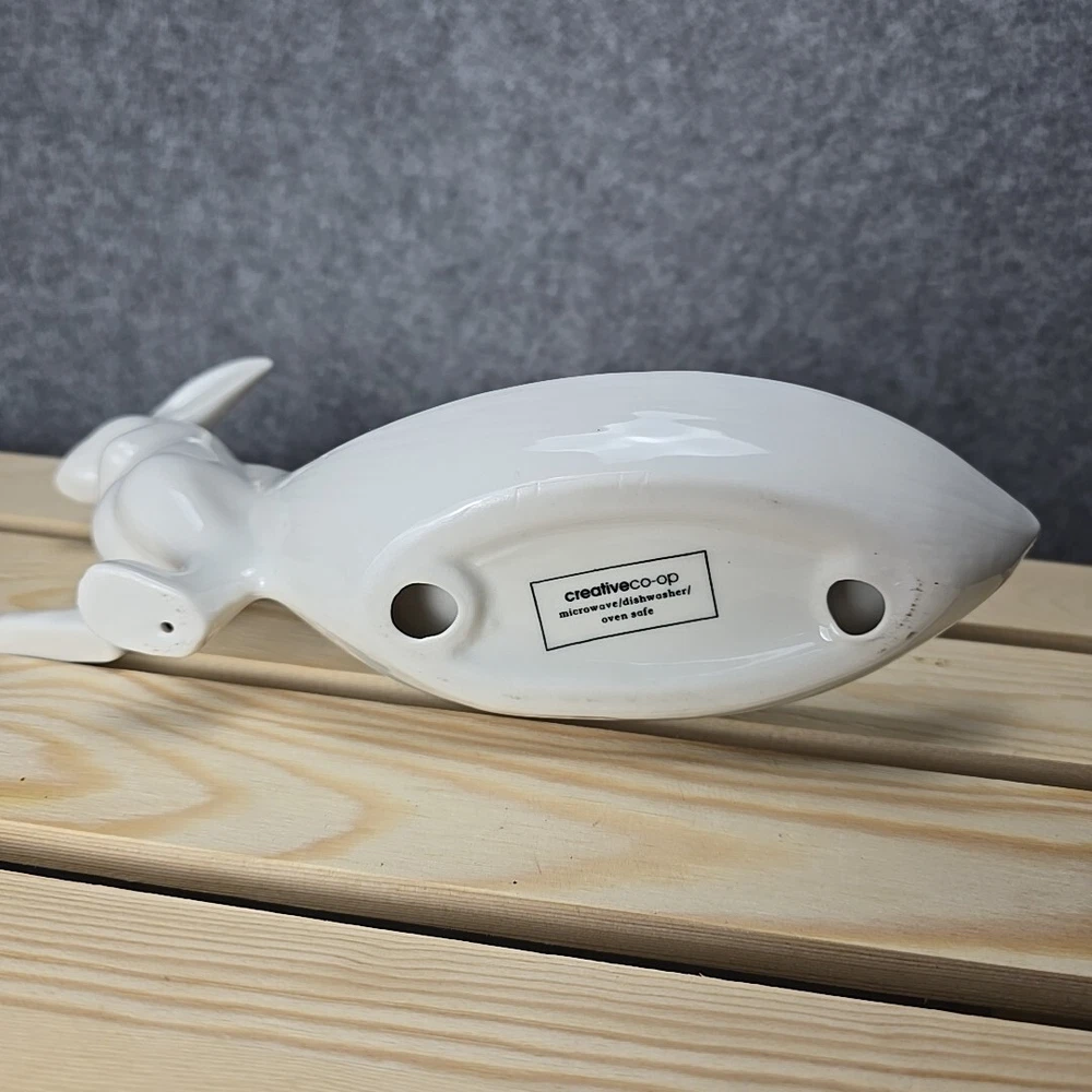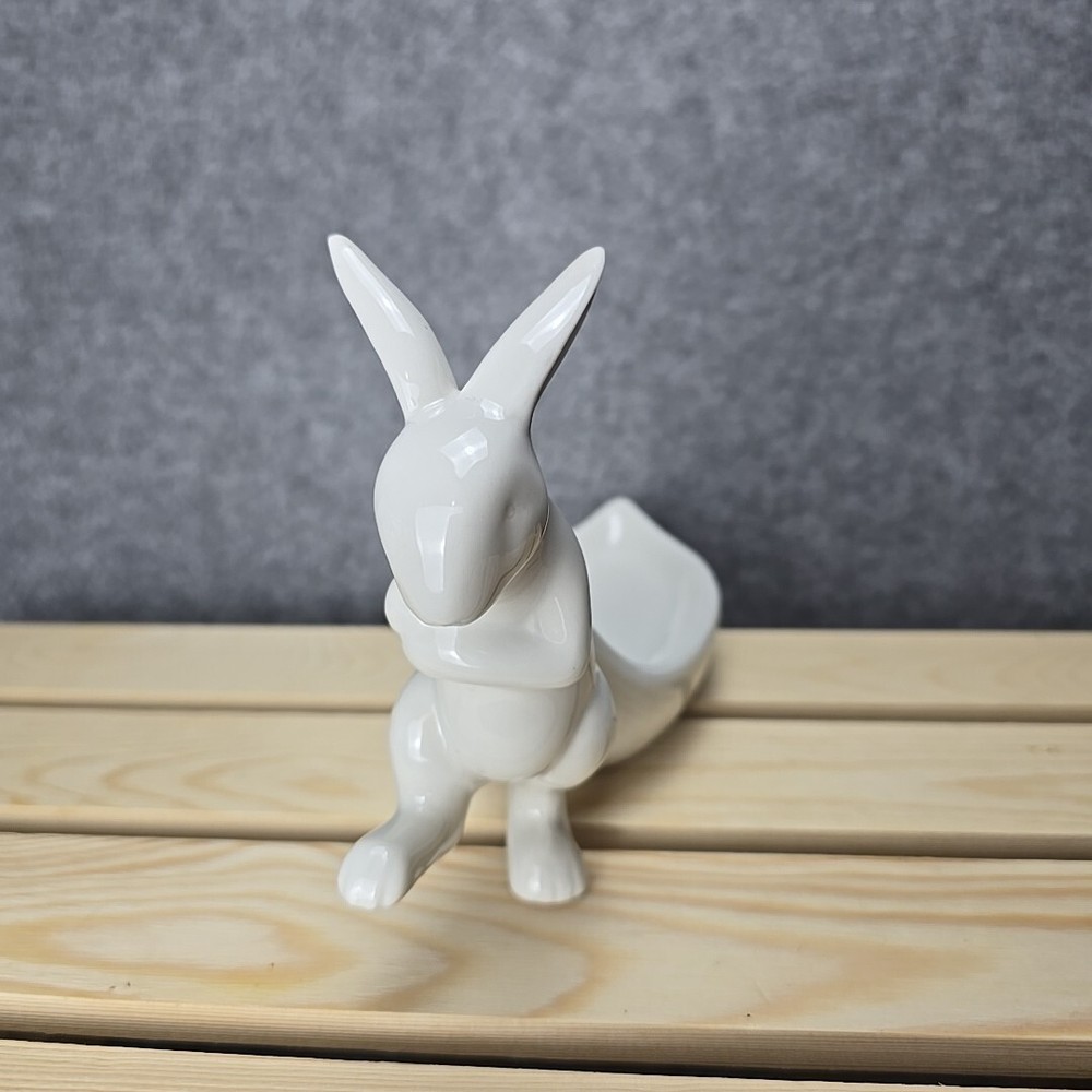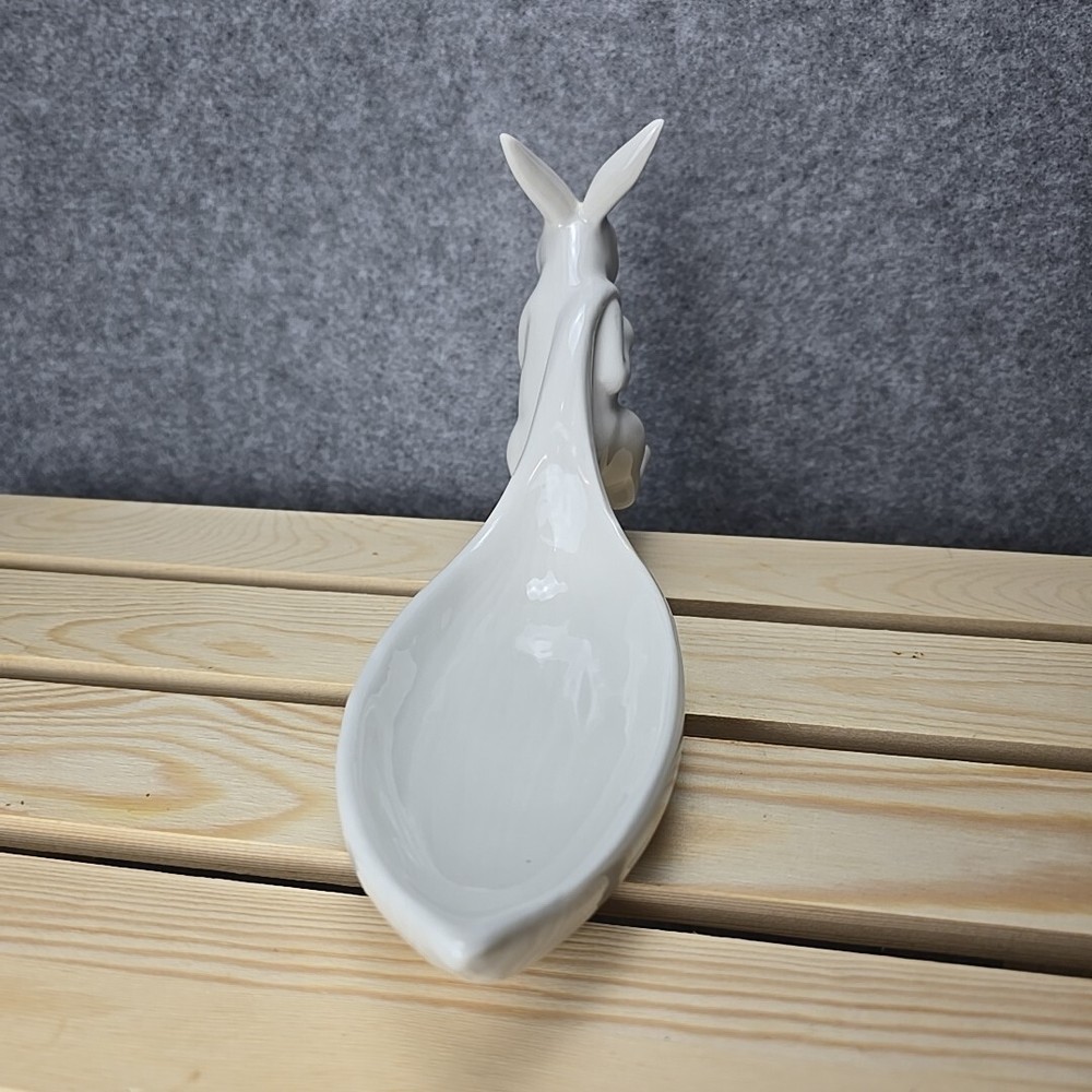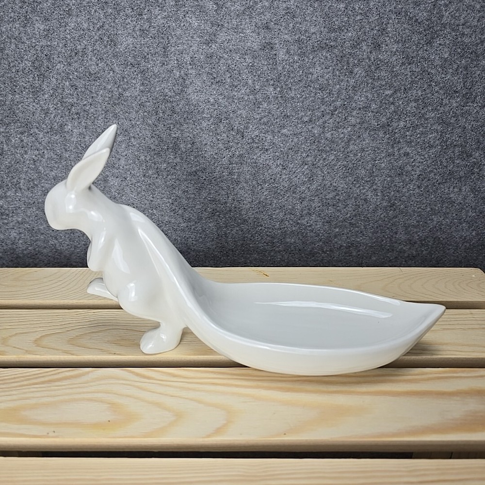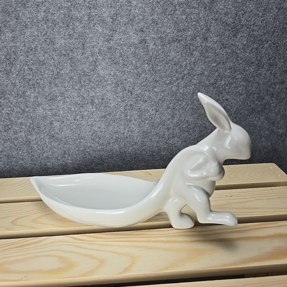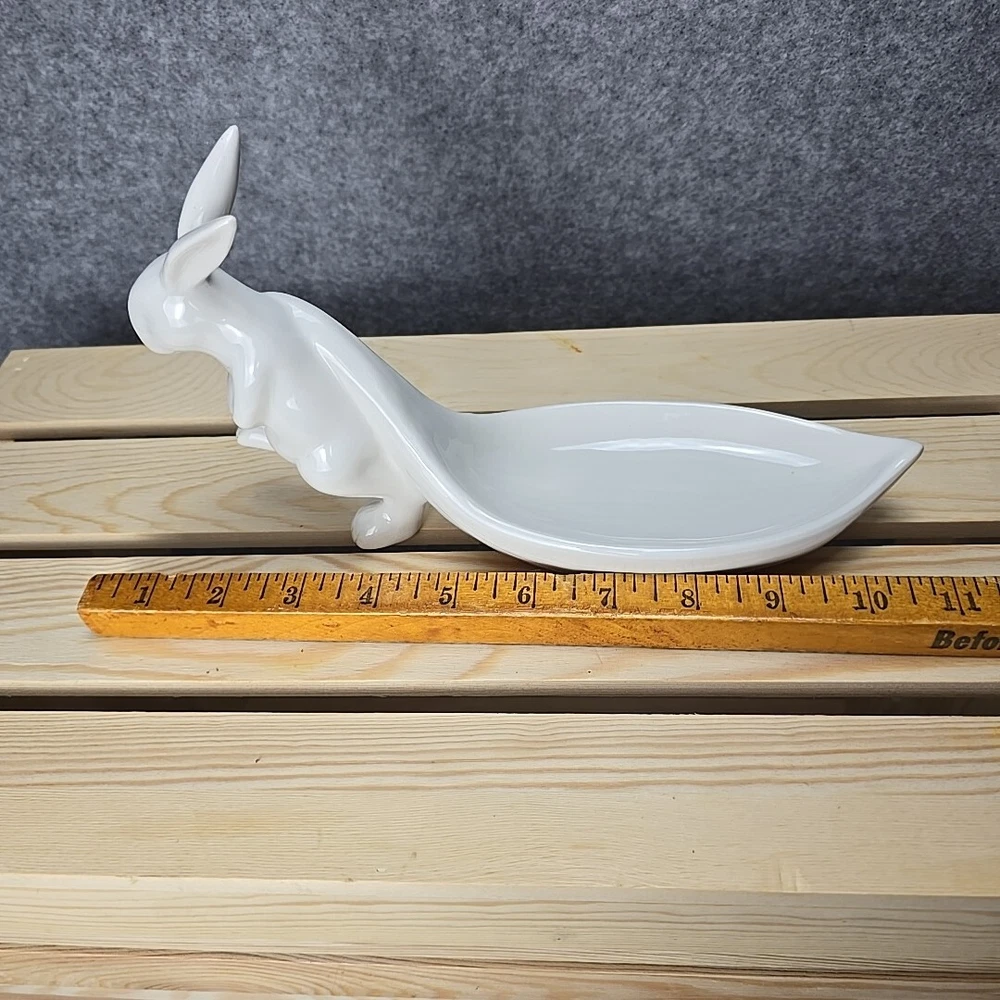 Excellent pre-owned condition. White Stoneware Rabbit Pulling Leaf Shaped Dish Creative CoOp Bunny Trinket Dish Please see photos for details and measurements.