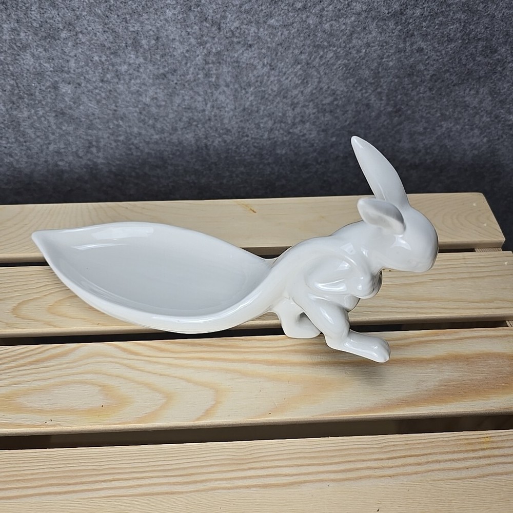 Excellent pre-owned condition. White Stoneware Rabbit Pulling Leaf Shaped Dish Creative CoOp Bunny Trinket Dish Please see photos for details and measurements....