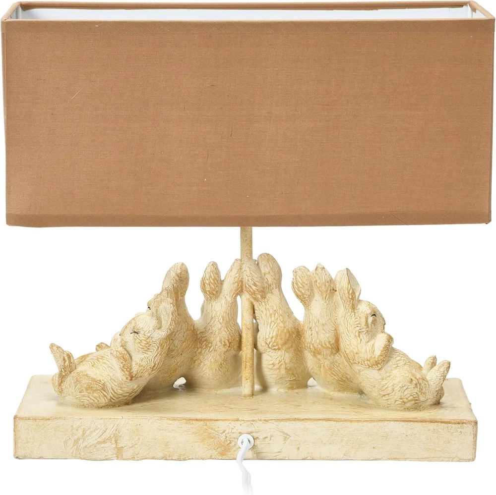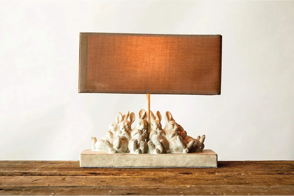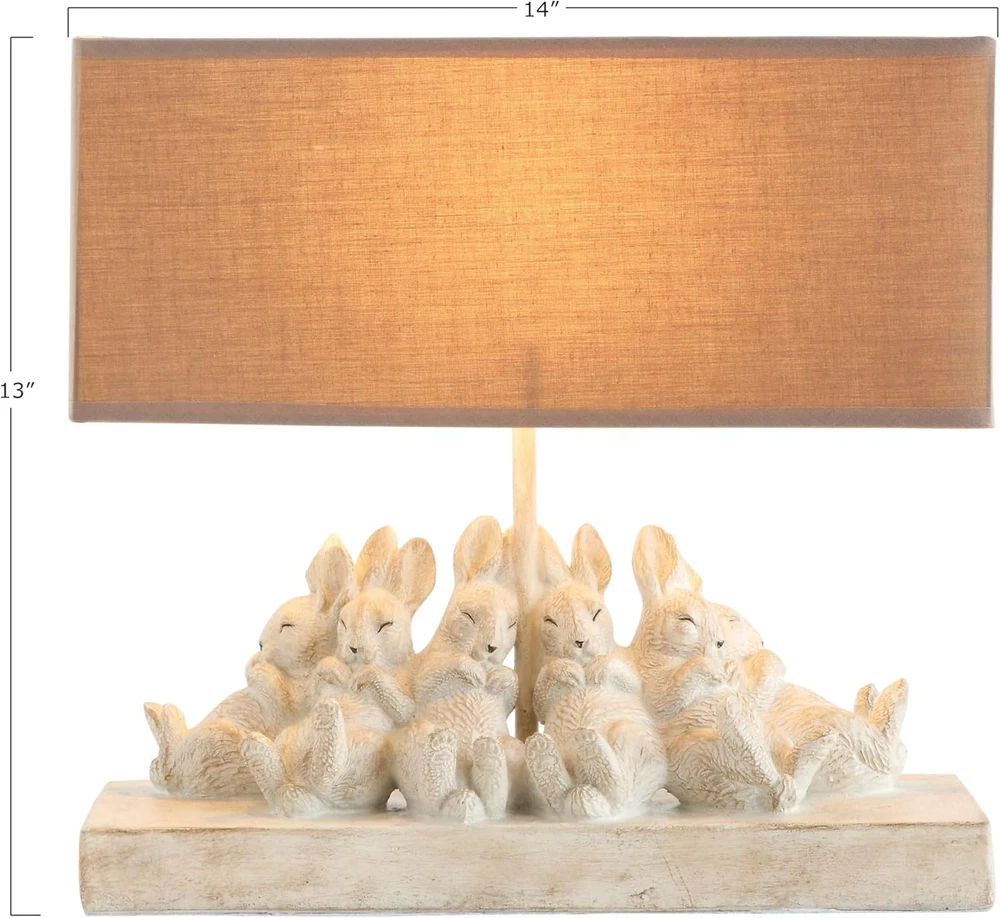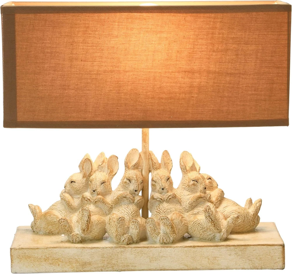 Whitewashed Rabbit Table Lamp with Sand Colored 14" L x 5.5" W x 13" H, White Product Details Base Material: Resin Product Dimensions: 5.5"D x 14"W x 13"H Item Weight: 4.4 Pounds Lamp Type: Table Lamp Shade Color: sand Shade Material: linen,resin Switch Type: Rotary Style: Ivory Bunny Rabbits Brand: Creative Co-Op Color: White Light Source Type: CFL Material: Resin Room Type: Nursery Shape: Rabbit Number of Light Sources: 1 Connectivity Technology: USB Included Components: Sand Color Resin Table Lamp with Rabbits and Linen Shade Is Waterproof: False Mounting Type: Tabletop Wattage: 100.00 Number of Items: 2 Lighting Method: incandescent Control Method: Touch Indoor/Outdoor Usage: Indoor Specific Uses For Product: Reading Water Resistance Level: Not Water Resistant Installation Type: Tabletop Number of Pieces: 1 Connectivity Protocol: Other Voltage: 1E+2 Volts Base Diameter: 1.75 Inches Is Cordless?: No Size: 14" L x 5.5" W x 13" H Manufacturer: Creative Co-Op Item Weight: 4.4 pounds Item model number: DA6893 Is Discontinued By Manufacturer: No Specifications: UL Assembly required: No Batteries required: No Whitewashed Ivory colored resin Bunny Rabbit table lamp is the perfect decorative accent for a farmhouse, woodland or farm-themed nursery or for a cute animal bedroom light This cute animal bedside lamp has 6 cute baby bunnies sleeping at the base of the lamp and adds the perfect accent light for a little girl or boy's bedroom or nursery Includes a sand-colored linen lamp shade Table lamp requires 1 maximum 40W light bulb (not included), includes a 78' cord Measures 14"L x 5.5"W x 13"H Set a relaxing tone in your home with this group of sleeping bunnies. The light from the lamp spotlights how precious and content these little friends are and passes that feeling on to you. The base has a white washed finish. Let these sleepy friends be the light in your room decor.