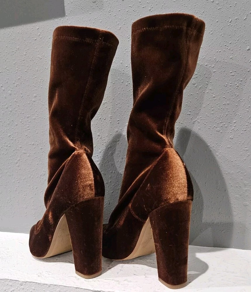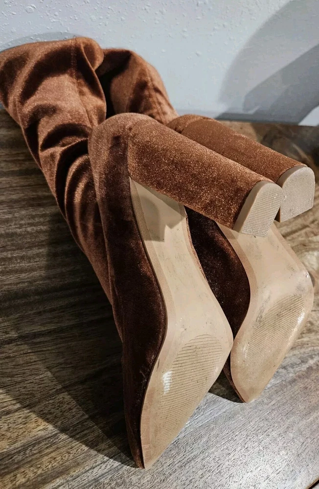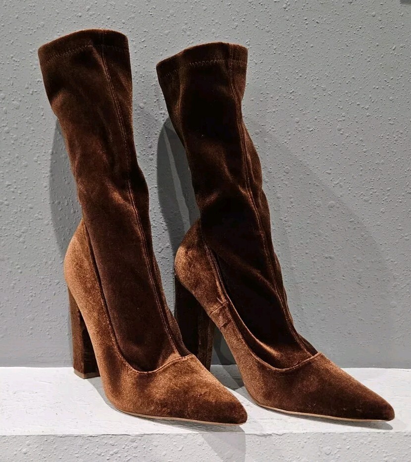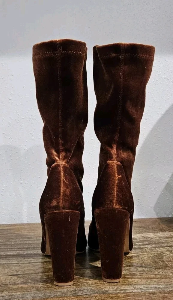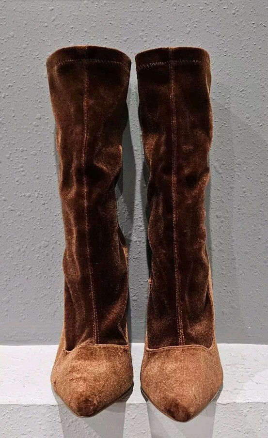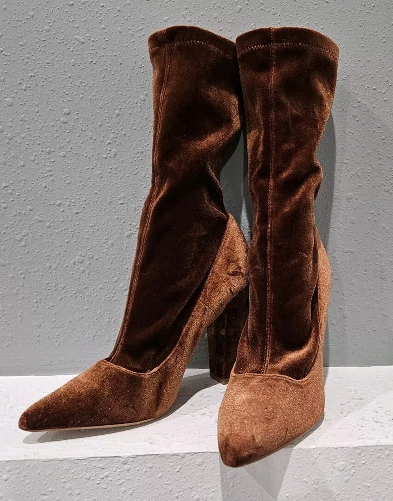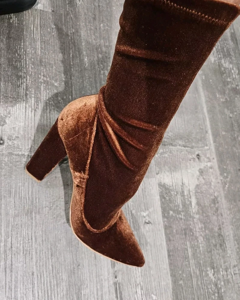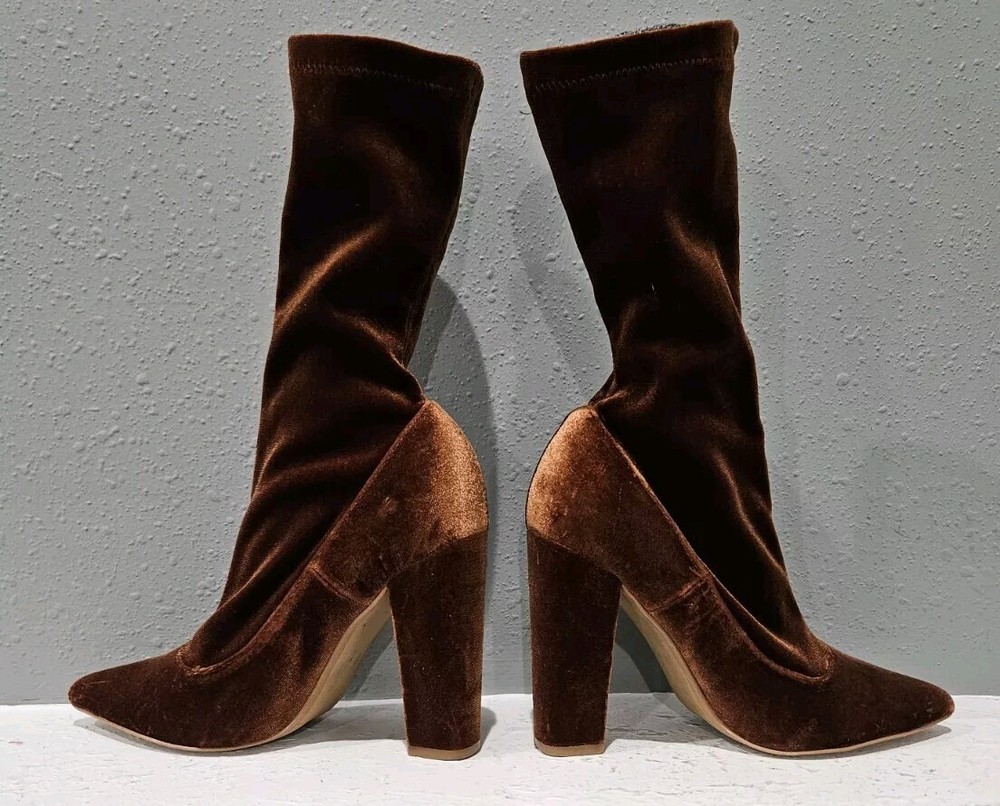 Step out in style with these stunning burnt orange velvet booties. Featuring a pointed toe and mid-calf shaft style, these boots are perfect for any occasion. The pull-on flexability makes them easy to wear, while the medium calf width ensures a comfortable fit. These retro-inspired boots have a high block heel, measuring between 3-3.9 inches and a shoe width of M. The upper material, as well as the heel, is made of luxurious velvet, adding a touch of elegance to your outfit. Ideal for women who want to make a fashion statement, these boots are a must-have for any shoe collection.