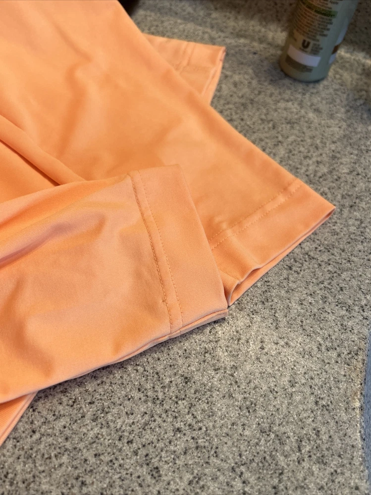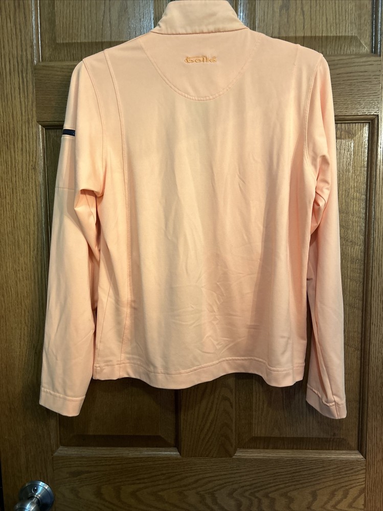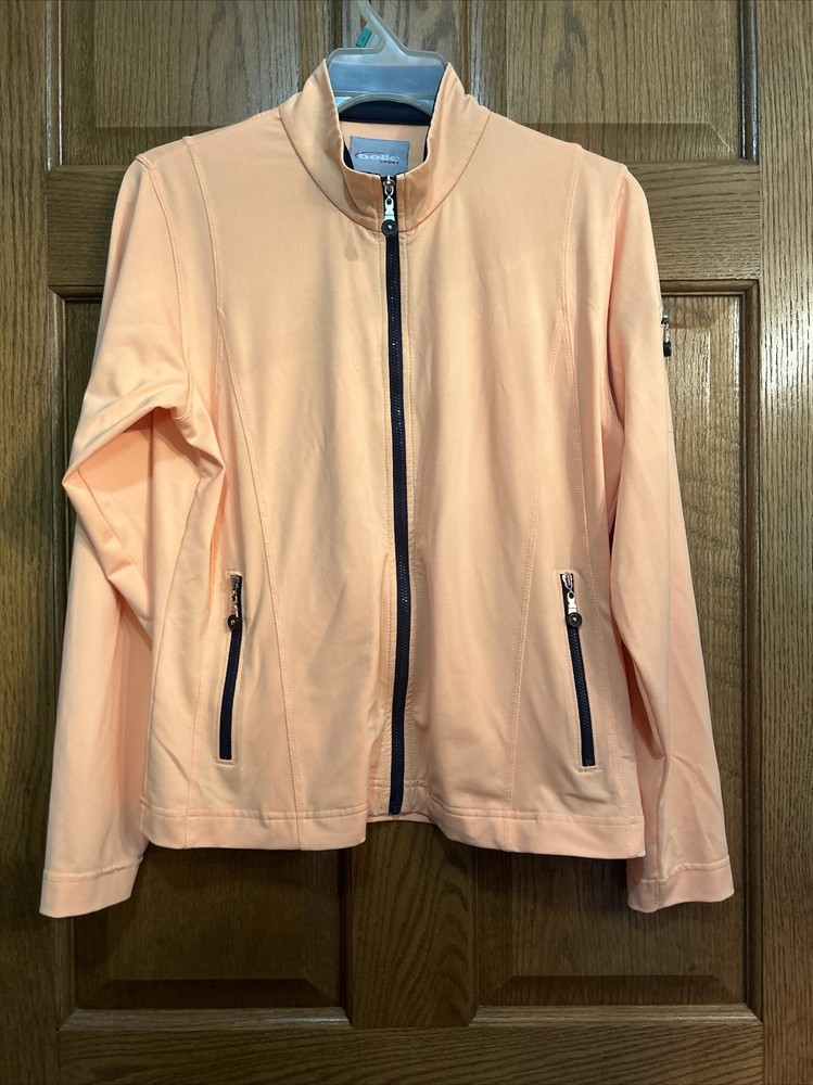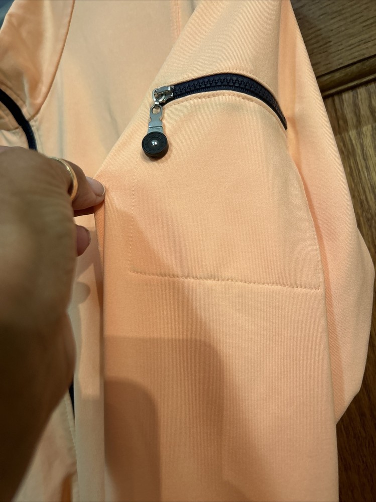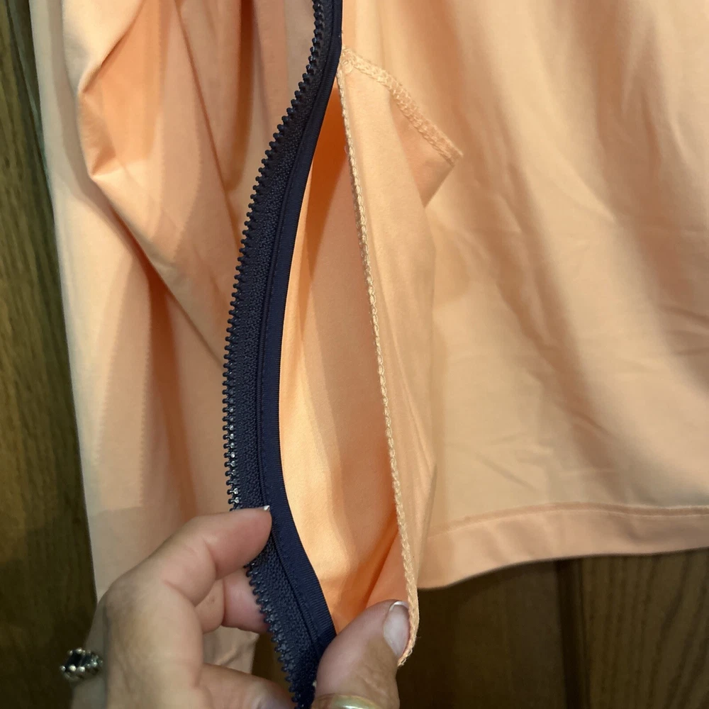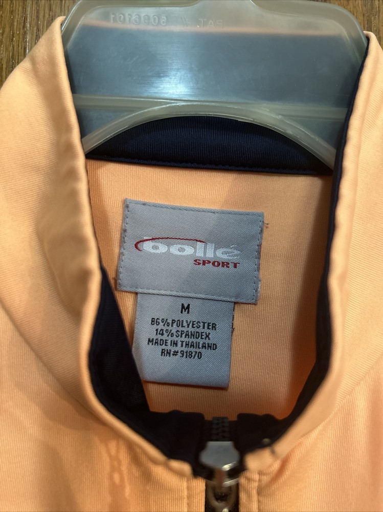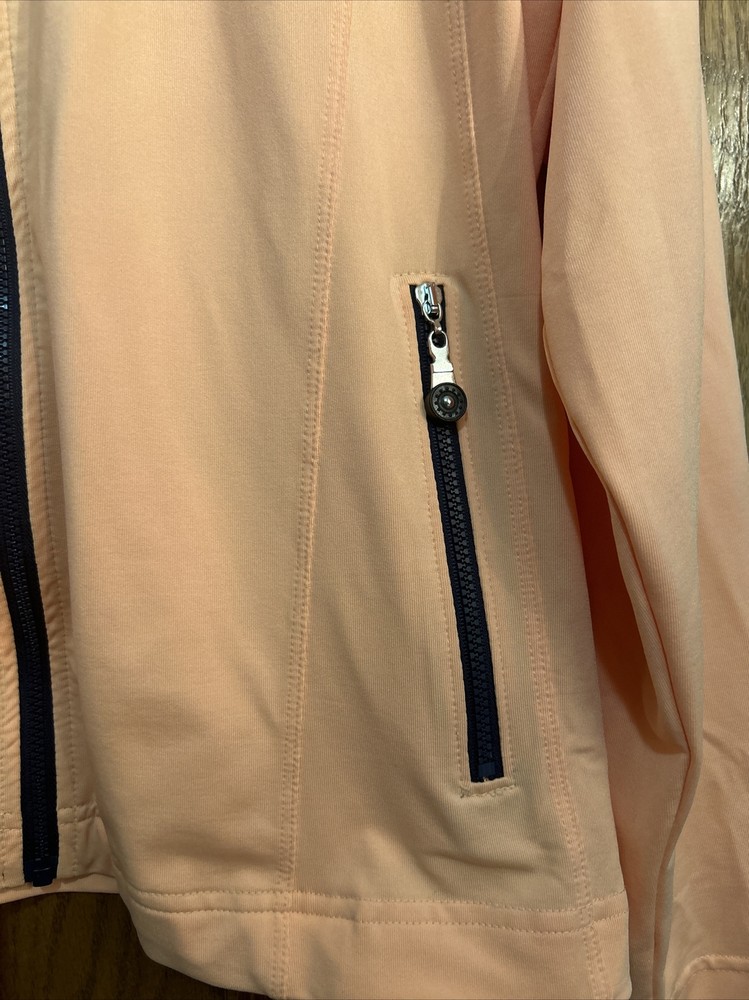 This women's Bolle jacket in size M is a stylish and functional addition to any wardrobe. The jacket features a solid orange color and a mid-length cut, perfect for both casual wear and travel. The lightweight and breathable polyester blend outer shell material is easy to care for with machine washable garments care. The jacket boasts a full zipper closure and long sleeves for added comfort. Zipper accents add a touch of style to the classic fit of the jacket. Ideal for fall and spring weather, this Bolle jacket is an excellent option for any woman looking for both fashion and function. Zippered pockets on sides and one arm. Melon colored with black trim. Pit to pit zipped is 20” and length is 22.5”. Nice jacket
