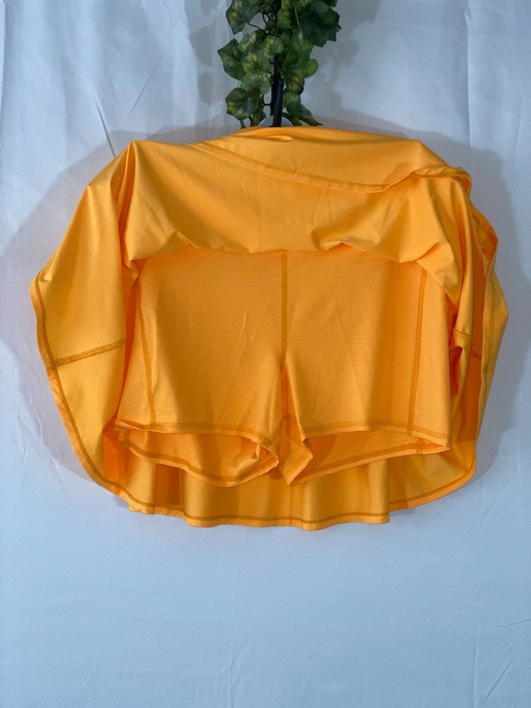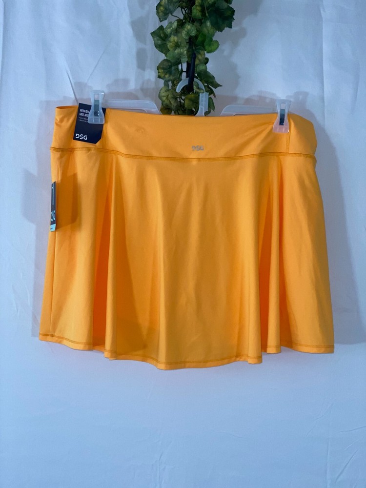 Women's DSG Performance Flounce Mid Rise Skort with built in short Orange XL Sits below natural waist Moisture wicking Built in mesh short Body 78% Polyester 22% Spandex Under Short: 90% Polyester 10% Spandex