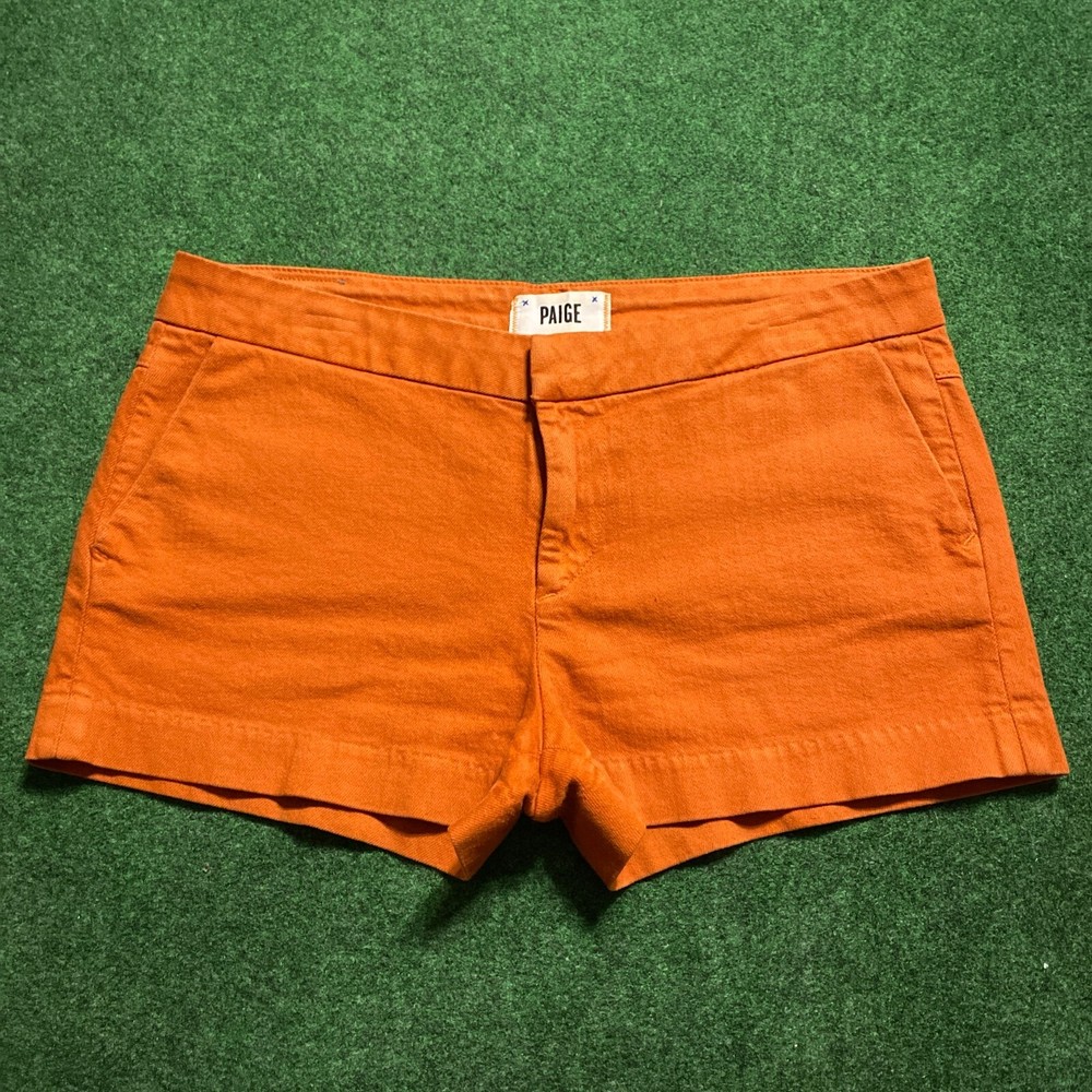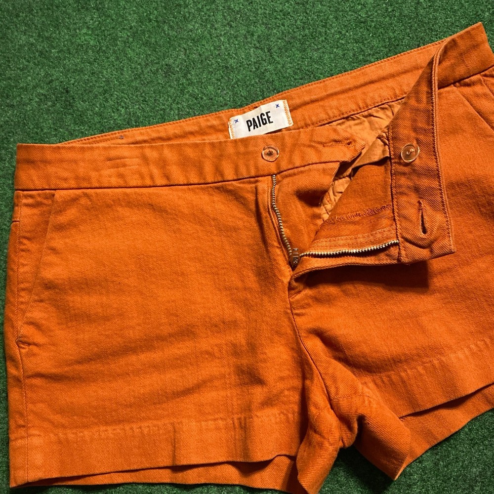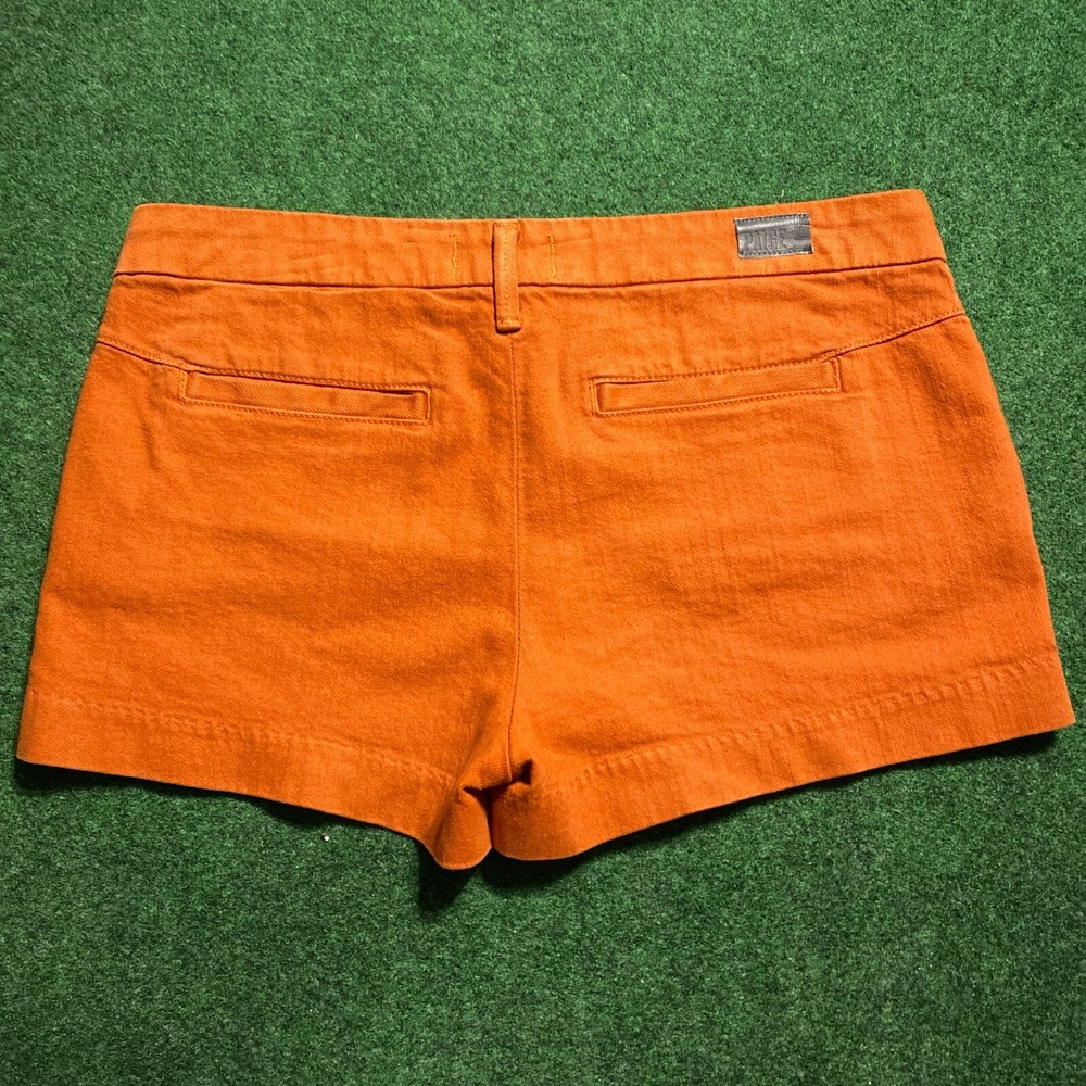 - The burnt-orange, zip-up and double button enclosure, mid-rise shorts features a fixed waistband with a single belt loop and a 4-pocket system - Made in U.S.A. - 99% Cotton 1% Elastane - Width: 17”, Length: 11”, Hip: 19.5”, Inseam: 2.5”, Leg Opening: 12” - Good condition; no major wear, tears, or stains - DISCLAIMER: Orders are shipped within 3 business days. Items are being sold as is and all/most of its information is provided in the description. Feel free to ask any questions regarding the item. Please refer to the clothing article’s measurements (measured flat). If measurements are not listed or displayed, they are available upon request. Most/All garments are no longer washed or dry cleaned to prevent shrinking, unless an odor was previously present. Please wash garments upon receiving the item
