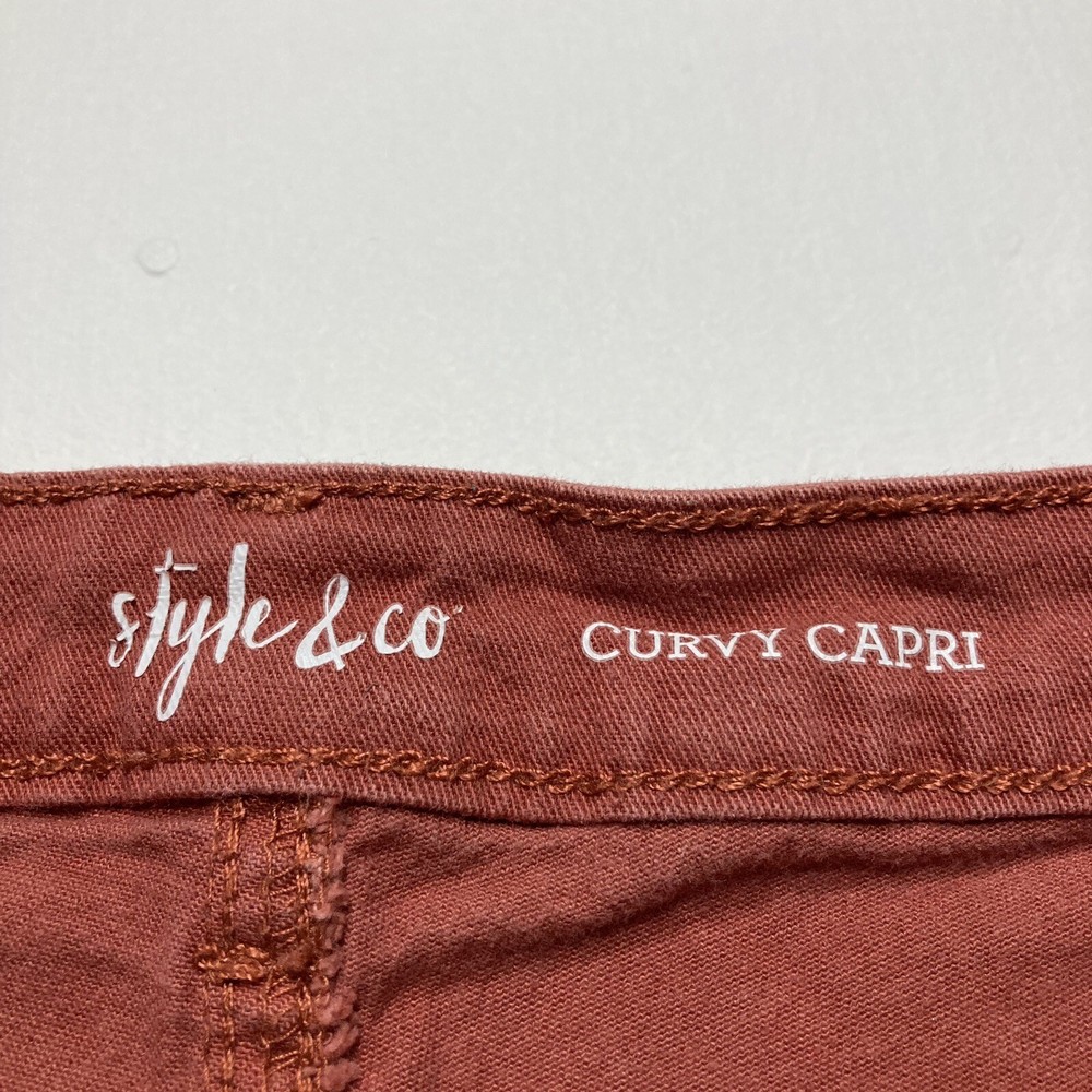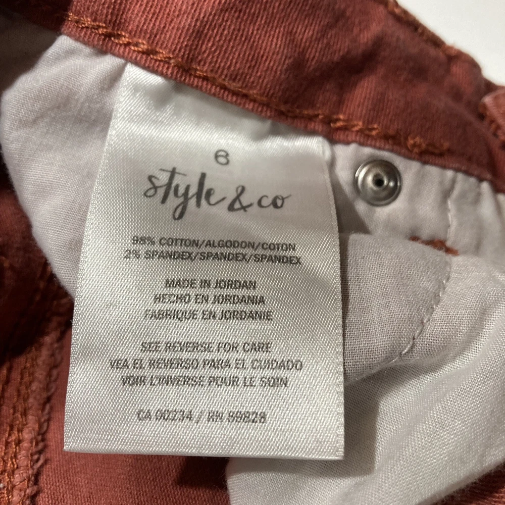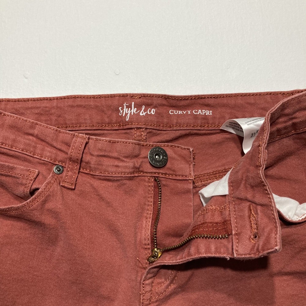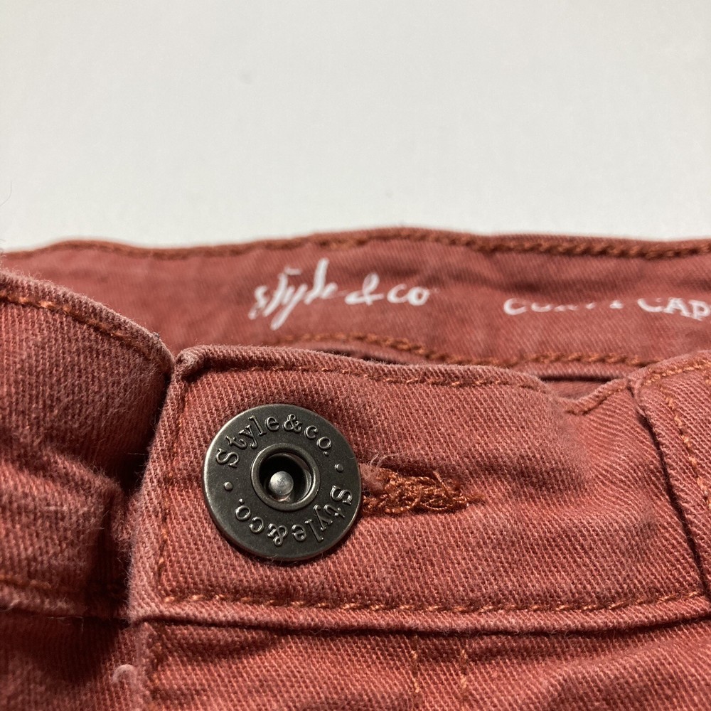 Upgrade your wardrobe with these stylish and comfortable capri pants from Style & Co. These pants are perfect for women who want to look fashionable and feel comfortable at the same time. The pants are made of a blend of spandex and cotton material that ensures maximum comfort and flexibility. The design features a mid-rise waist that sits comfortably on the hips, and a flat front that slims the tummy area. These pants come in a beautiful orange color, perfect for adding a pop of color to your outfit. The pants have a straight leg style and an inseam of 22.5 inches, making them perfect for any occasion. The closure is a combination of a zip and button, ensuring a secure fit every time. These pants are perfect for women who prefer a regular size fit and a stylish design. The pants are pre-owned but are in excellent condition, making them perfect for those who want to enjoy the benefits of a high-quality pair of pants without breaking the bank.