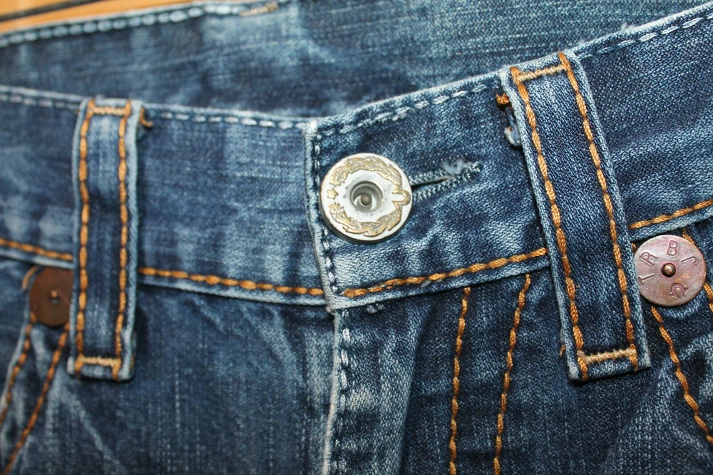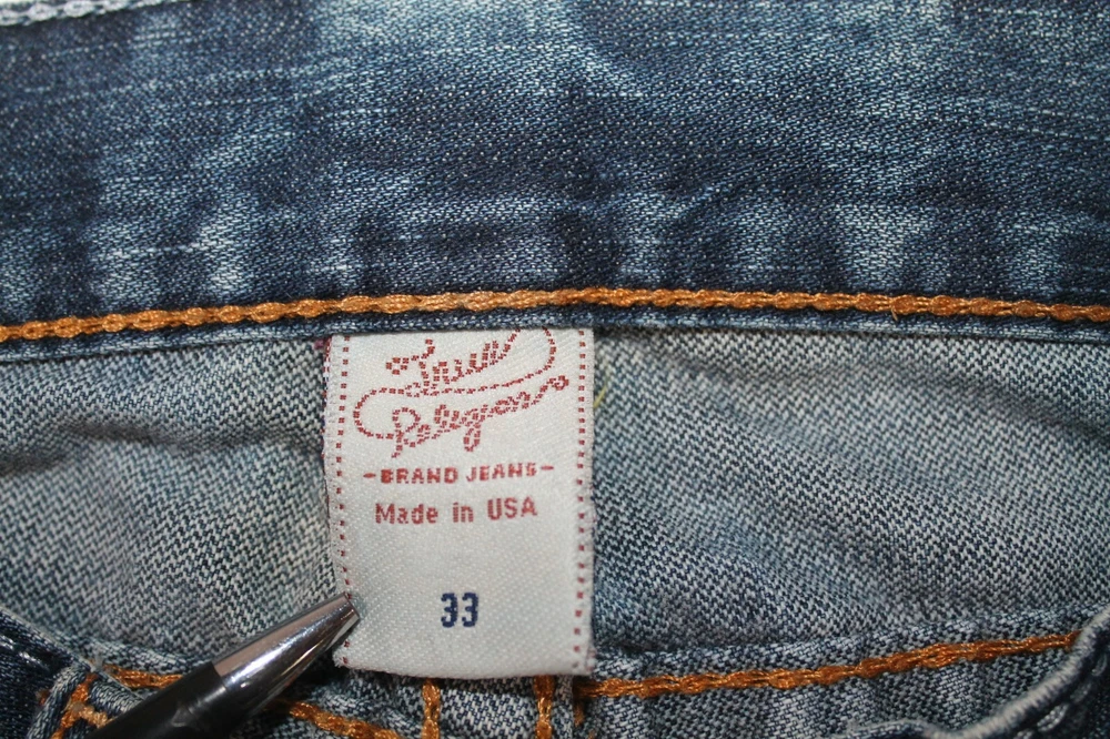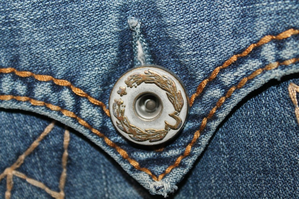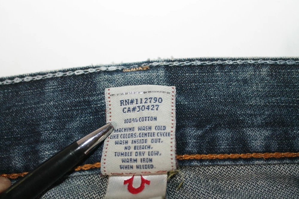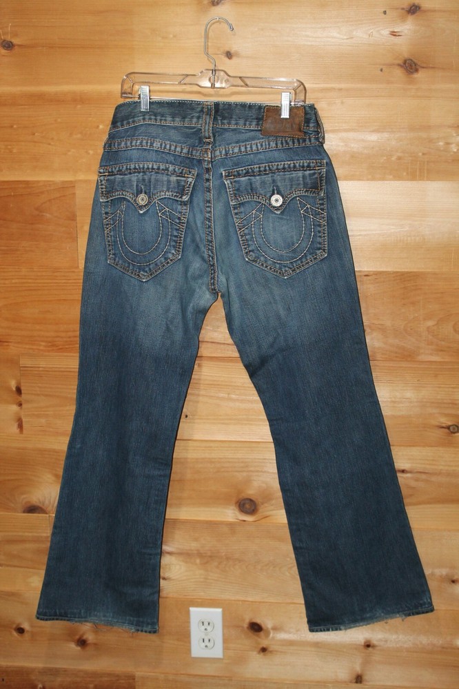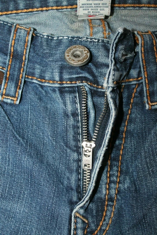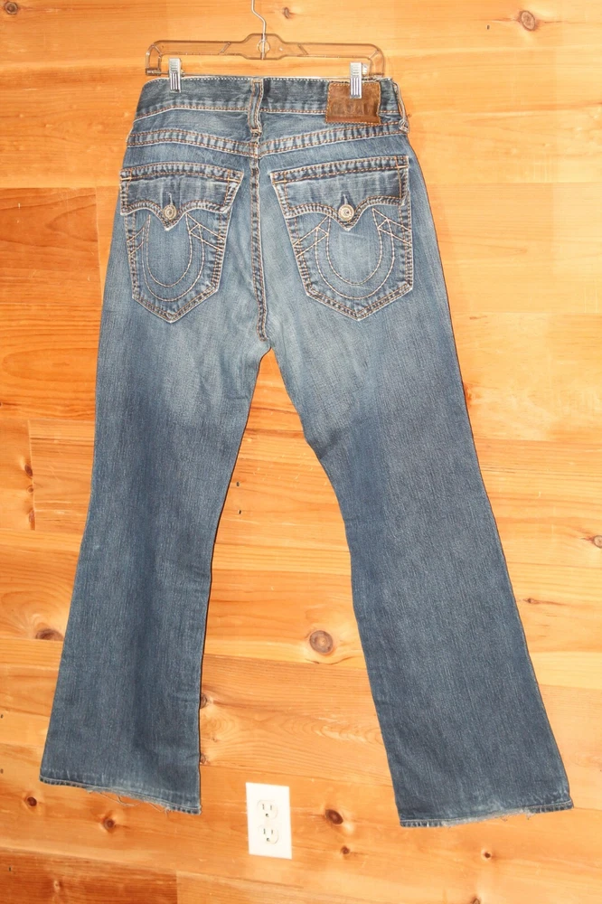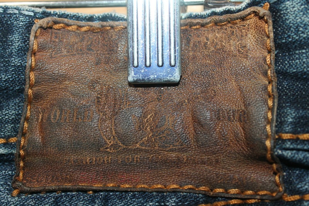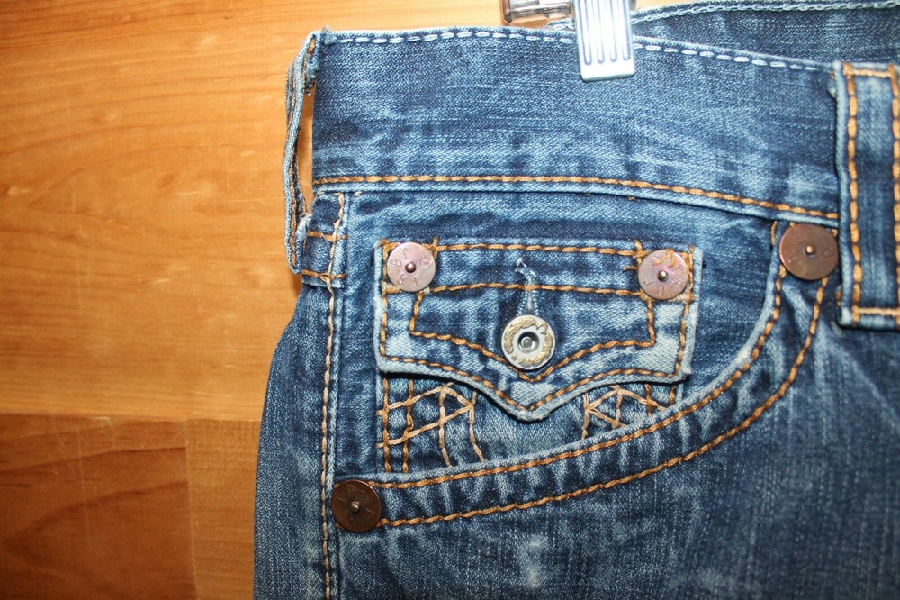 Women's TRUE RELIGION Thick Orange Gold Stitch Flap 33x31 Embossed Gold Buttons Rockabilly Western Style Across the Thigh = 11" Rise = 10"...