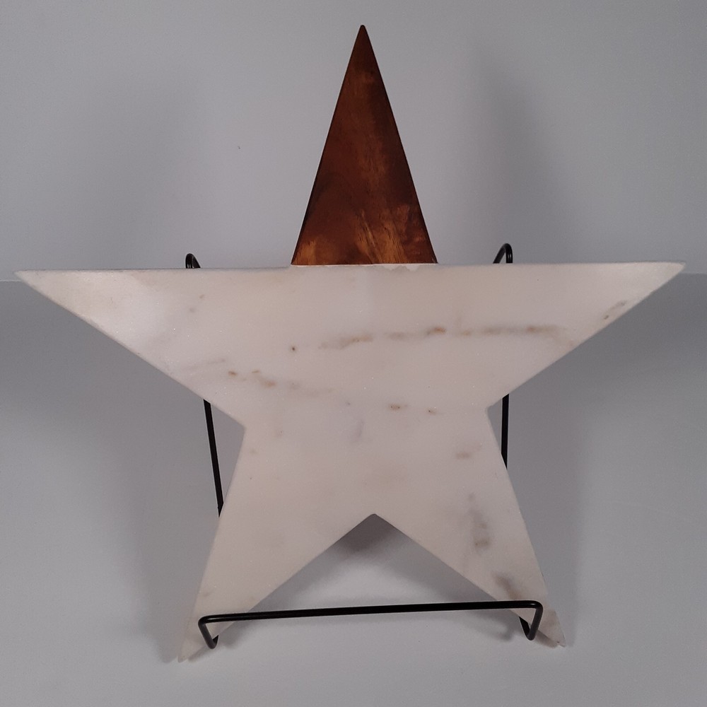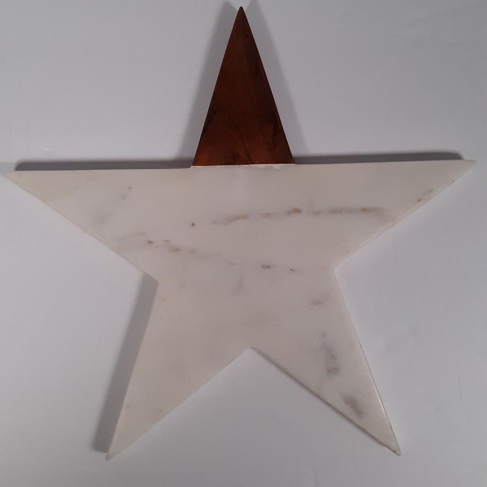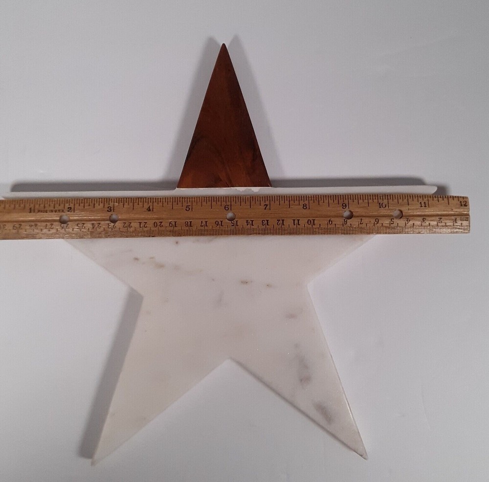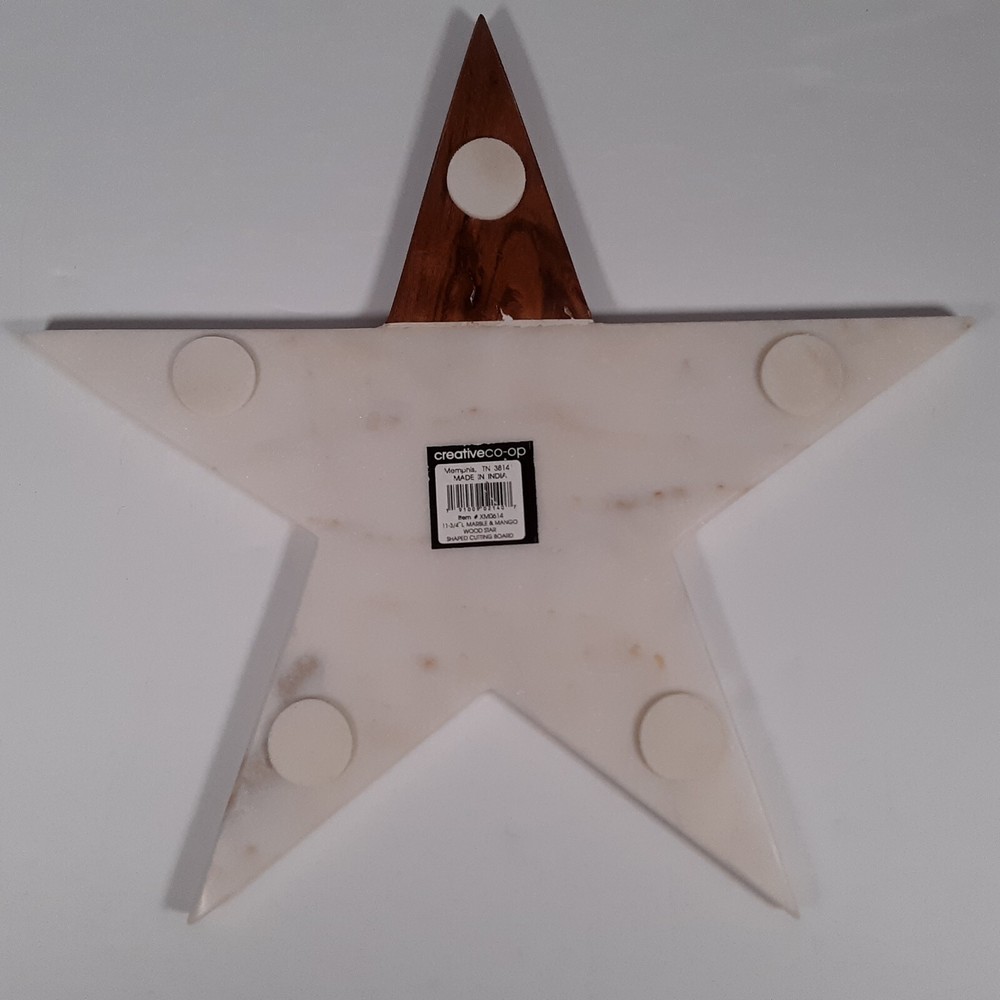 Creative Co-Op Star-shaped Mango Wood Marble Cheese Charcuterie Board Texas Star 11 3/4" Easy to store Gently used - no scratches Small blue smudge on tip of star -- see photo #6. See all photos as part of condition details. I pack my items with care, and ship promptly.