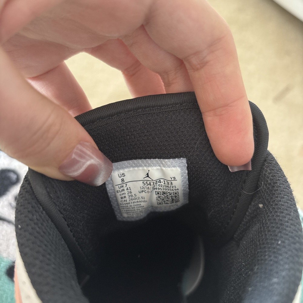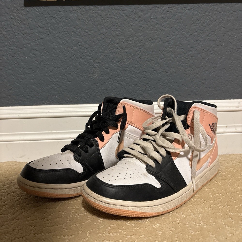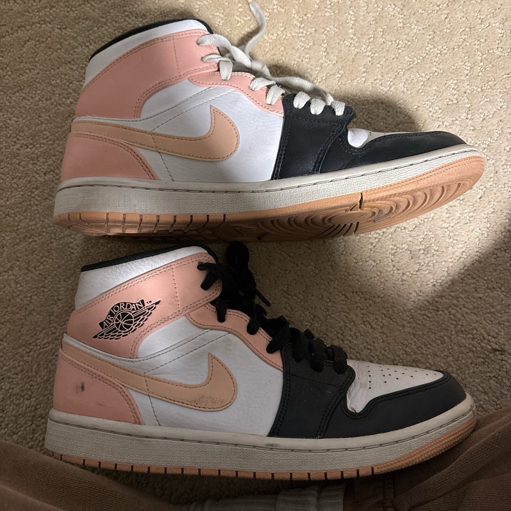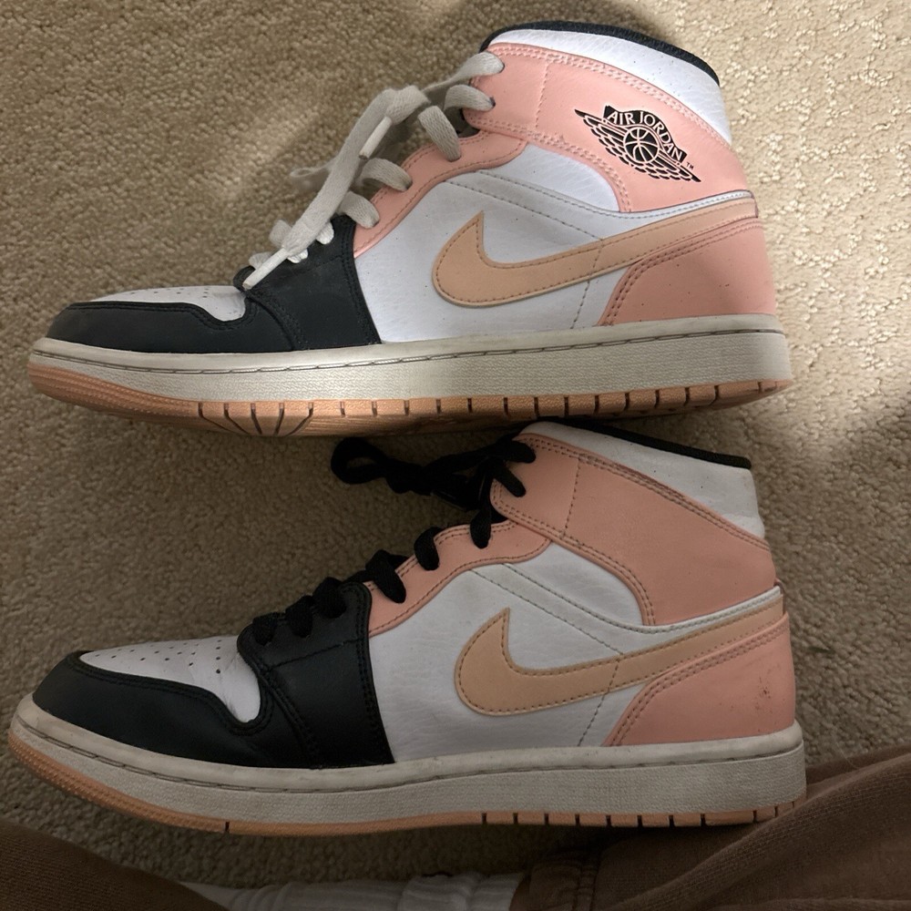 These are pre-owned Jordan sneakers in a women's size 8, featuring a mid-top shoe shaft style in a striking crimson orange colorway known as "Crimson Tint". The design includes a mix of white, black, and Arctic orange accents, crafted with a leather upper material. The shoes exhibit some signs of wear and slight creasing, adding character to their athletic appeal.