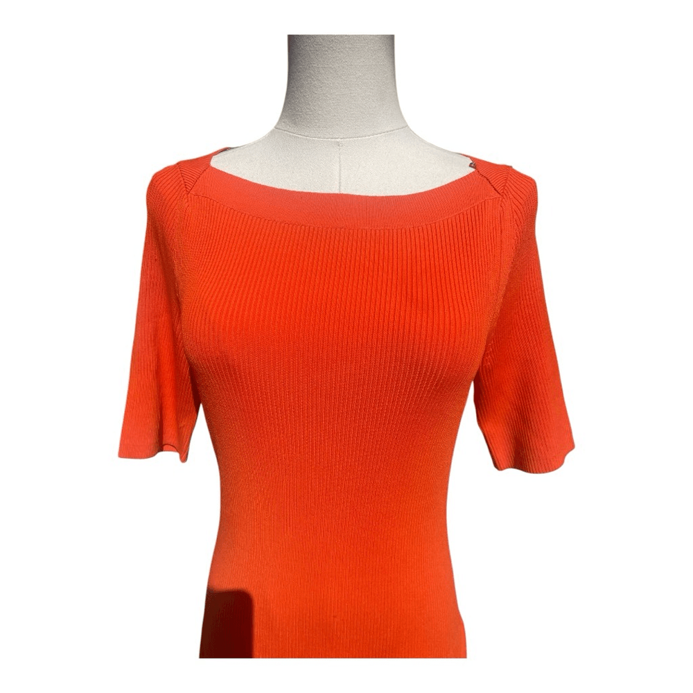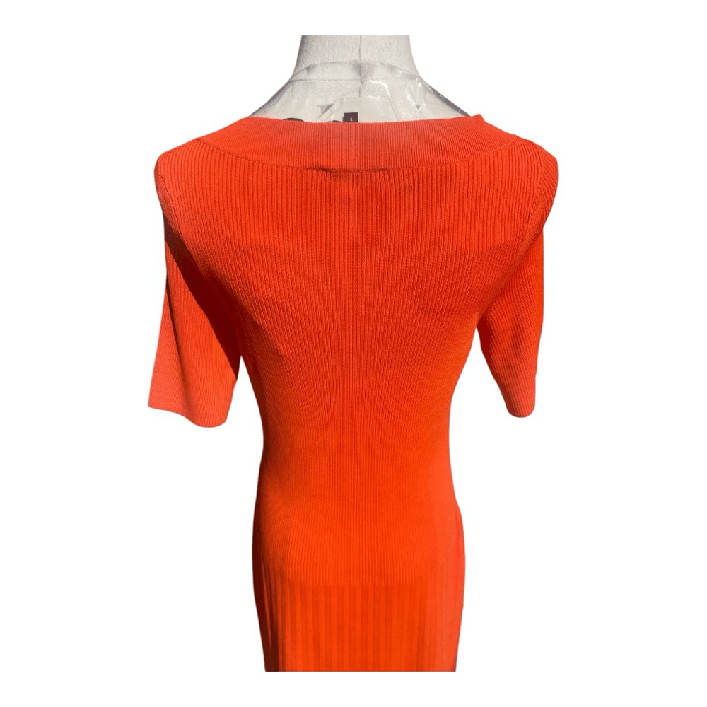 Worth NYC Orange Knit Fit and Flare Dress. Size Small. Measures 15” P2P and is 38” long from shoulder to hem. This dress is an excellent preowned condition with metal wear. No stains or flaws.