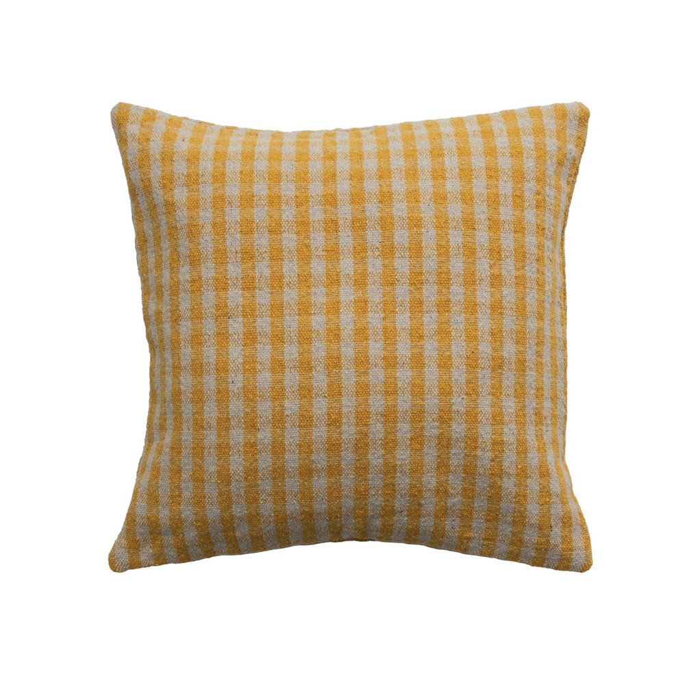 Mustard and white woven recycled cotton blend pillow cover with gingham print; Cover: 45% Cotton, 42% Polyester, 7% Rayon, 6% Acrylic; 18" L x 18" W Mustard and white woven recycled cotton blend pillow with cover gingham print; Insert not included Machine Wash Warm, Gentle Cycle, Do Not Bleach, Tumble Dry Low, Warm Iron If Needed Cover: 45% Cotton, 42% Polyester, 7% Rayon, 6% Acrylic Prop 65 Compliant 18" L x 18" W