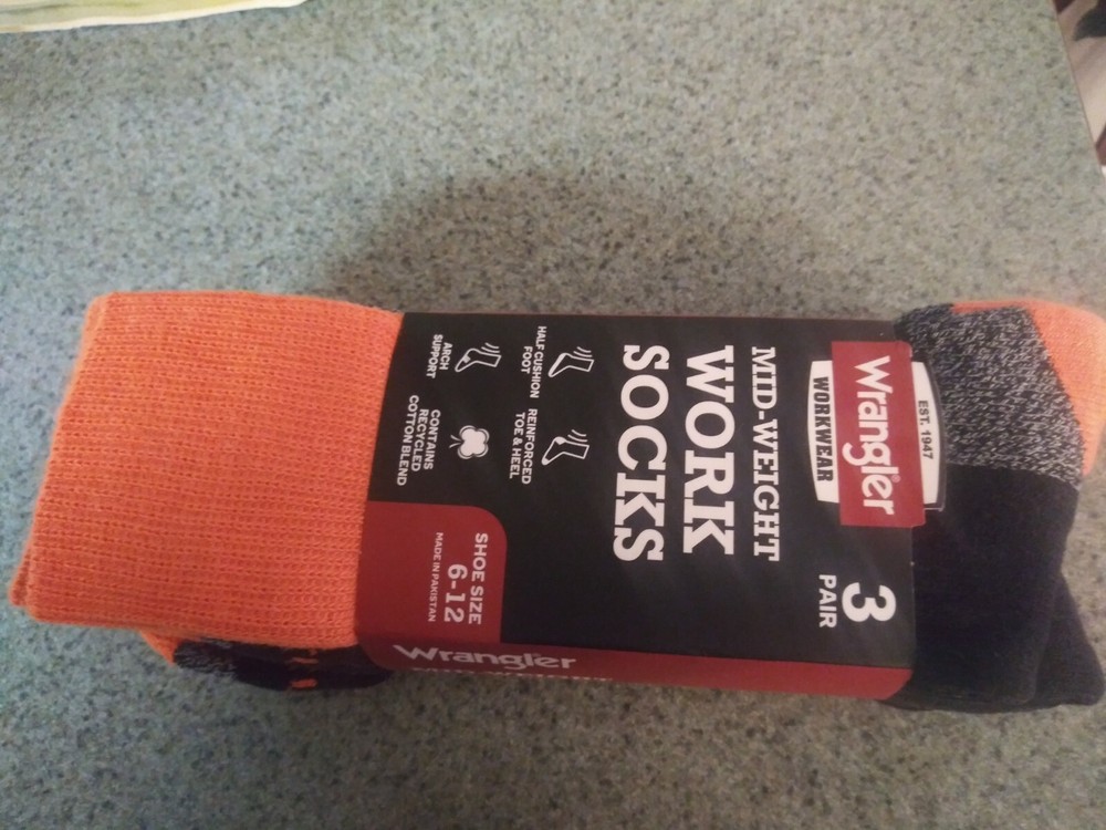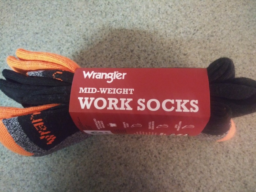 Wrangler Workwear -Mid-Weight Work Socks -3 Pair -Black & Orange - Size 6-12....