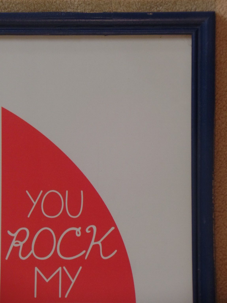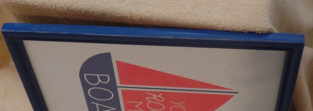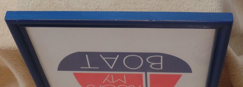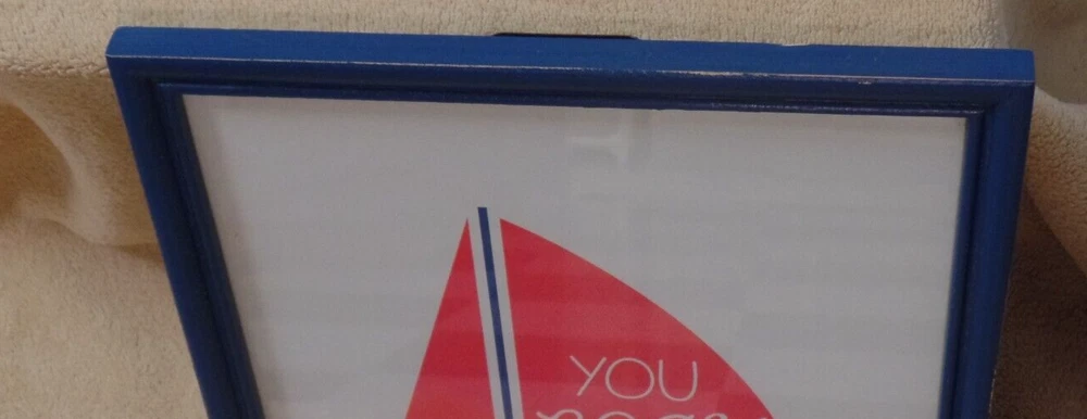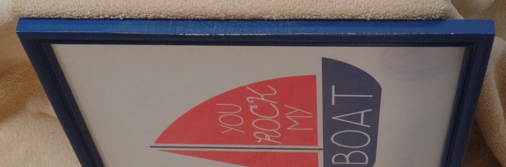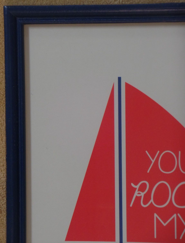 Fun nautical themed print " You Rock My Boat ." Red and blue sailboat on a soft white background. Matching blue frame. 11" x 14". 2014, from Creative Co-op. Very good condition - some minor loss of blue paint on the frame...an be used as is, repainted, or replaced with another frame.
