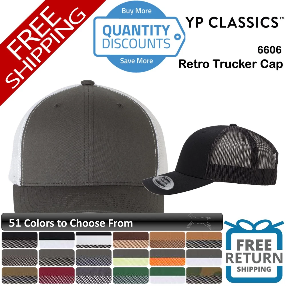 "We stand behind every deal, we have many successful transactions, all with positive reviews. We have been selling items on eBay for the last 23 years." - Easy Free Returns - Deep Volume Discounts - Factory Direct Pricing - All Items are Brand New 🔥 YP Classics Men Retro Trucker Cap Hat six-panel, mid-profile Snapback 6606 Material: Cotton Blend Model: 6606 Weight: Pocket: Stand out from the crowd with our YP Classics Men Retro Trucker Cap Hat! This six-panel, mid-profile snapback features a permacurv visor for that perfect curved look. Made with a cotton blend and mesh material, this hat is not only stylish but also comfortable to wear all day long. Stay cool and trendy with the snapback closure that allows for a customizable fit. 65/35 polyester/cotton Camo is 85/15 polyester/cotton Multicam is 60/39/1 polyester/cotton/spandex Kryptek and Veil are100% polyester Mesh back Structured, six-panel, mid-profile Permacurv® visor Camo and Multicam have a black undervisor Heather/Black & Heather/White have grey undervisors (was matching, this is a rolling change) Kryptek and Veil have a silver undervisor Snapback closure Adjustable Crown Height 3 1/2" Measurements Hat size: 6 5/8 - 7 3/8 Companion Styles Check out these other great deals on sale -Why does the price change on the listing ? The price for clothing can very largely with in the same product model, by color and size, ebay lists the lowest Options item, more often White, as the starting price. -My items don't have any retail hanging tags, are these 1st quality? We only stock 1st quality products. - No Seconds or Cuttag flawed items.- the reason we can sell our items at low prices is these are not tagged for retail giants, there come in bulk cases of 72 ready for printing. -Do you have bulk discounts? we are ways working with the manufactures to set the lowest price possible, and we are constantly adjusting our prices to be the lowest they will allow, at this time this item is at the lowest price in the market. -What does x oz. mean on shirt weight? Weight is determined by fabric density, and so it is industry standard to measure 1 inch of cloth to determine its weight by multiplying 1 inch by the amount of square fabric used in the making of the full garment. example a 5 oz shirt is light weight,and 6.1 in heavyweight. -What are "Heather" colors? These are shirts, that to be made are a mix of cotton and polyester, the percentage will vary, these colors have a unique pattern with main color and light color speckles, these shirts are often Options less that the regular color shirts, Heather shirts are mostly named, Ash, Light steel, Birch, Oxford, and Heather something. -Why is White so much cheaper ? White T-shirts are Dyed. Just like every other shirt, but the White dye is the most abundant and cheapest available, because face it cotton is mostly white to start with, so is does not take much to change it. and we pass the saving on to you. -Why is 2XL and up so much more? Most manufactures do not have sales on the bigger sizes, I'm not sure why, We try to keep the bigger sizes at the lowest prices we can. Except where noted, most orders are shipped within 2-3 business days. -We do not ship on weekends, or any US Postal holidays. -We provide tracking to all customers. We will provide proper delivery tracking information to customer.If the delivery tracking states delivery to the shipping address provided by Customer, then Customer will accept this tracking as final proof of delivery, even in the event the customer did not sign for package. -If address provided is a PO Box We may also need a physical address for some shipping. -Shipping Issues Customer must notify us within 14 days of any shipping problems and we will work through how to correct it. We try to get your order to you as fast as possible, but please understand the post office sometimes takes longer that estimated times. We will continue to monitor the tracking of your package, and if it appears it is lost or will not arrive to your location, we will contact the post office and contact you Customer is responsible for providing correct shipping address information. If the package was shipped to an incorrect address provided by the customer, the customer takes full responsibility to retrieve package.