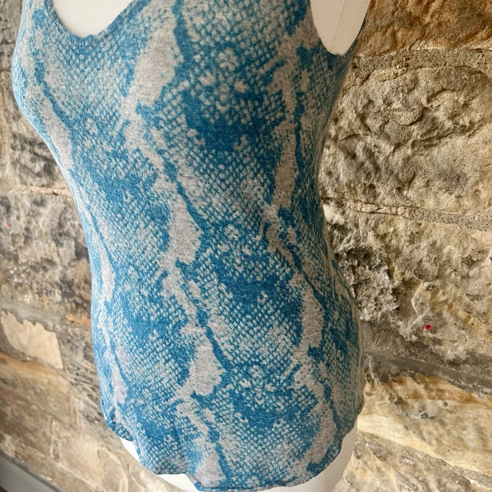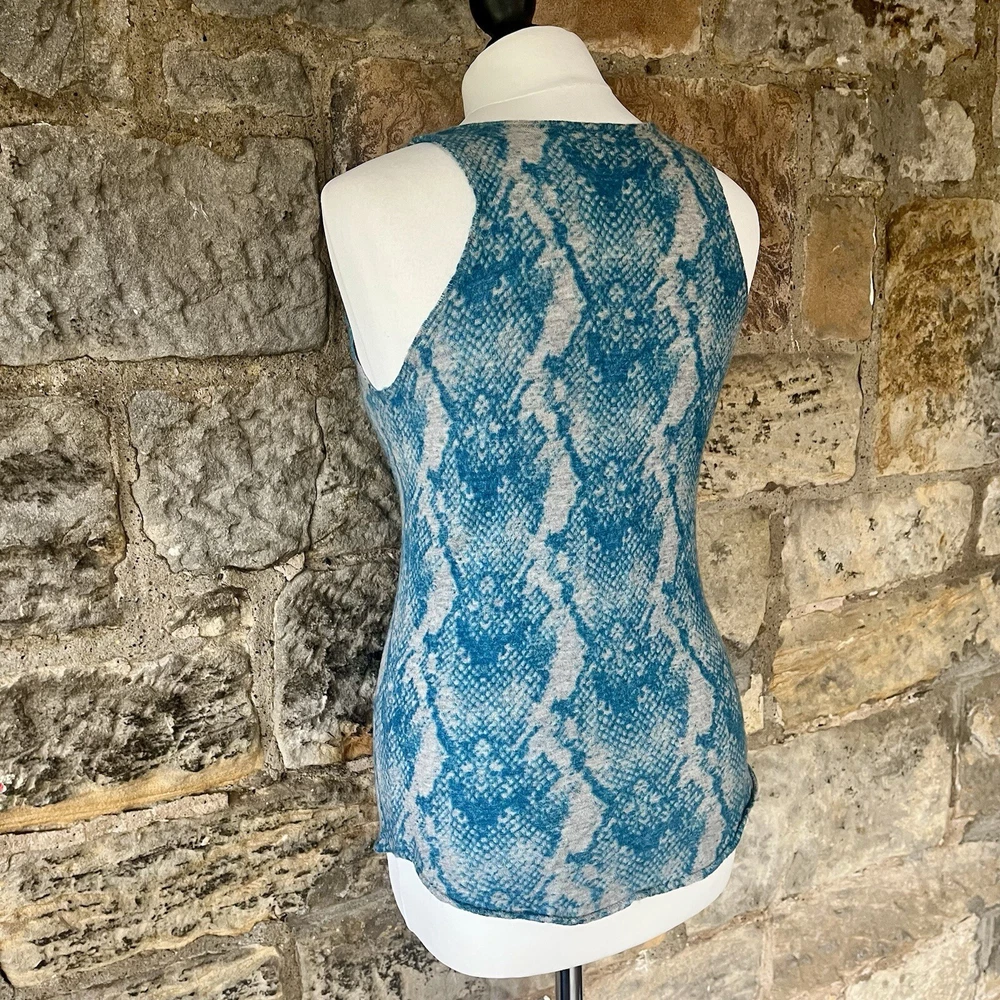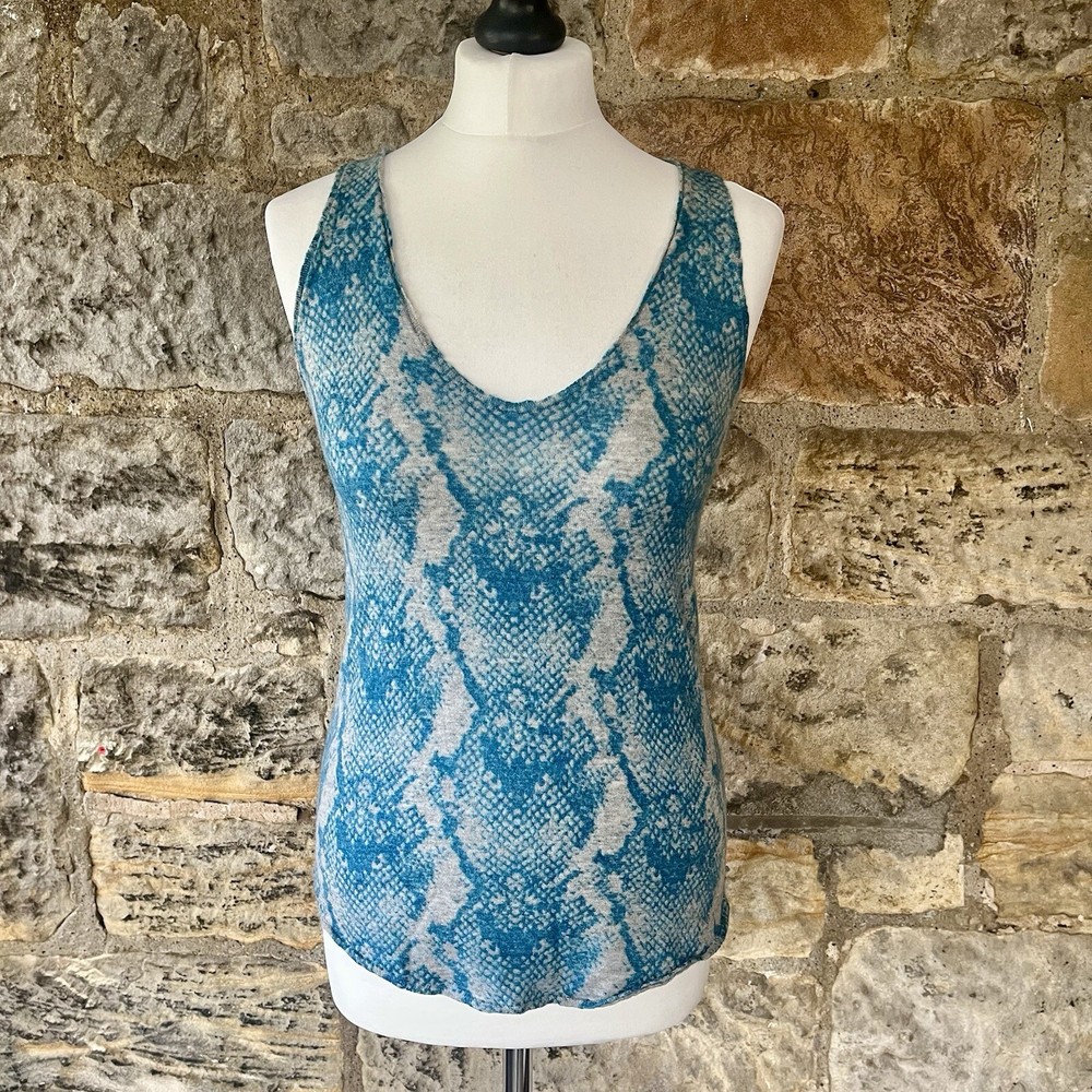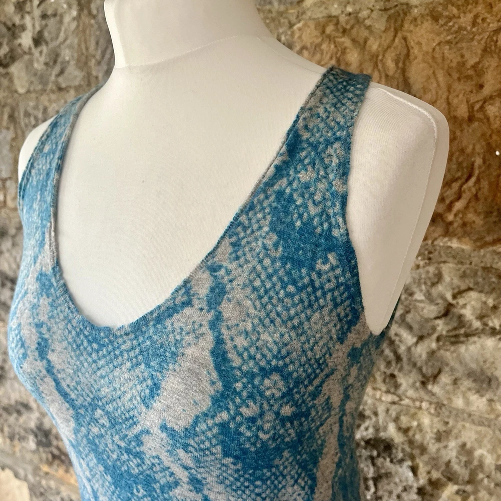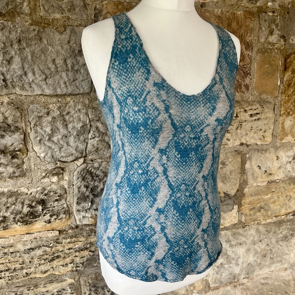 Zadig & Voltaire Deluxe Joss Cashmere Tank Top RRP $350 Size S - would fit a UK 8 - 10 - for reference the mannequin is a size 10 Azure Blue & Grey 100% Cashmere Sleeveless Vest top is crafted from snake-print cashmere with fine ribbing at the edges. V-neck In good condition