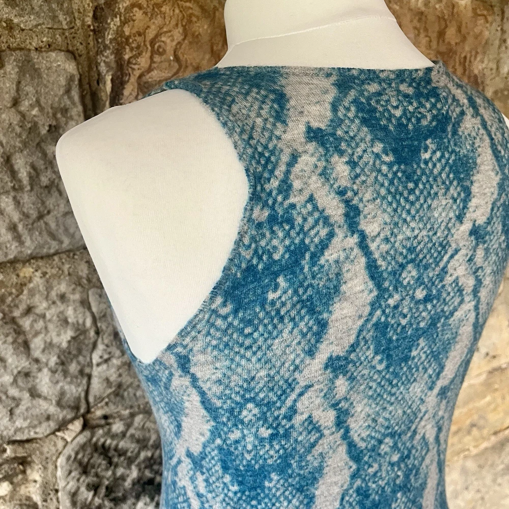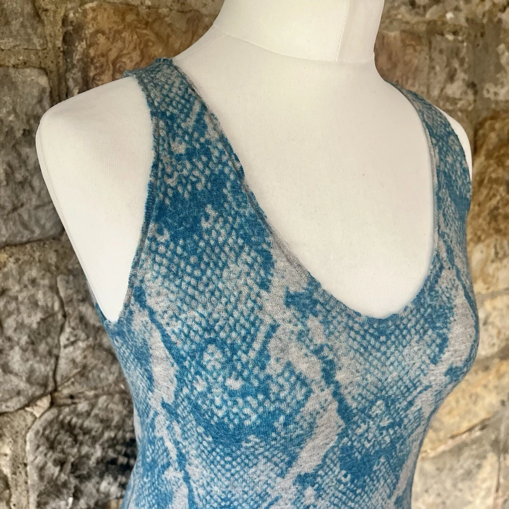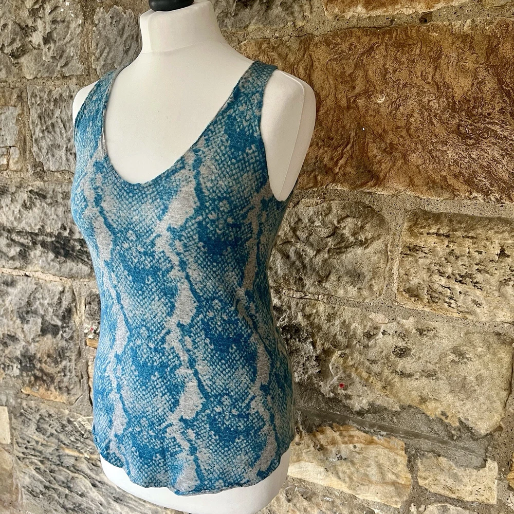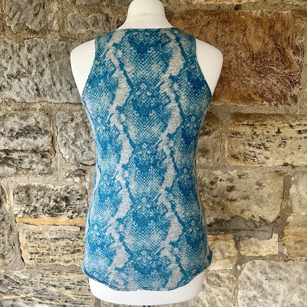 Zadig & Voltaire Deluxe Joss Cashmere Tank Top RRP $350 Size S - would fit a UK 8 - 10 - for reference the mannequin is a size 10 Azure Blue & Grey 100% Cashmere Sleeveless Vest top is crafted from snake-print cashmere with fine ribbing at the edges. V-neck In good condition
