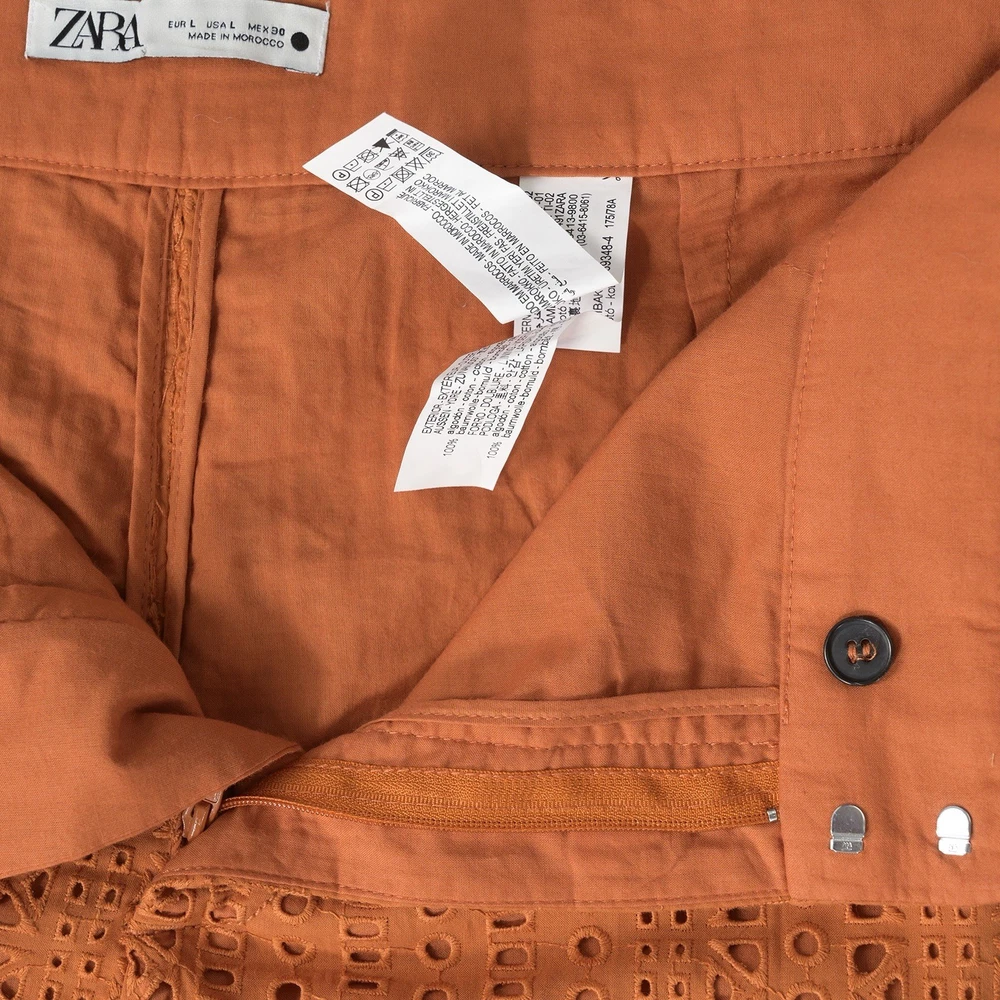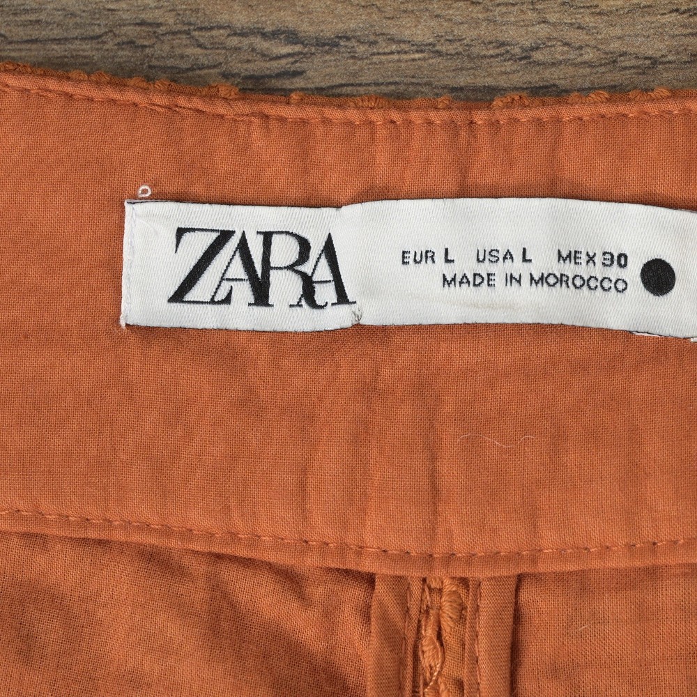 The Zara Women’s L. Orange Crochet Wide Leg Crochet Fashion Pants are a stylish and versatile addition to any woman's wardrobe. Made of comfortable cotton fabric with a mid-rise and a 23.5-inch inseam, these pants feature a unique crochet accent and a zipper closure. Suitable for various occasions such as travel, party, casual outings, and workwear, these pants offer a bright and fun vibe with a touch of bohemian flair. The breathable and stretchy design ensures comfort, while the pockets add practicality to the overall look. Ideal for the summer, fall, and spring seasons, these pants from Zara are a must-have for those who appreciate a classic and trendy style. *Good condition - nice fabric - fun pattern - light sign of wear/wash.