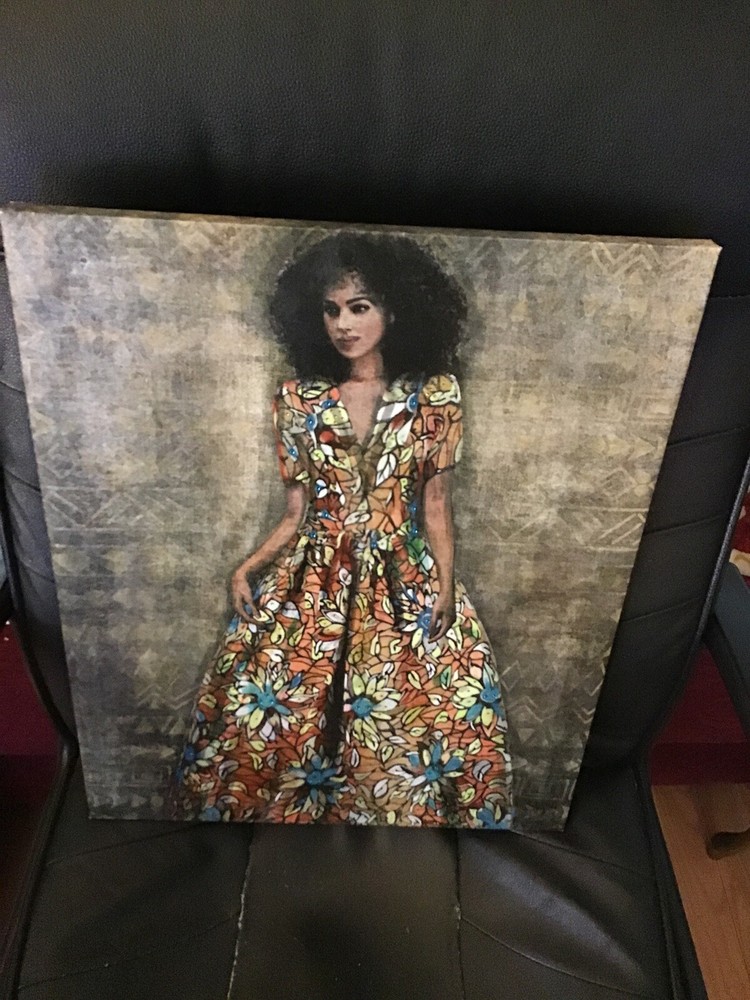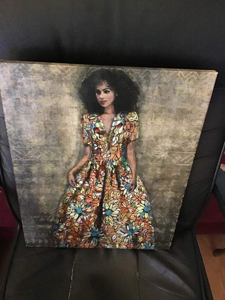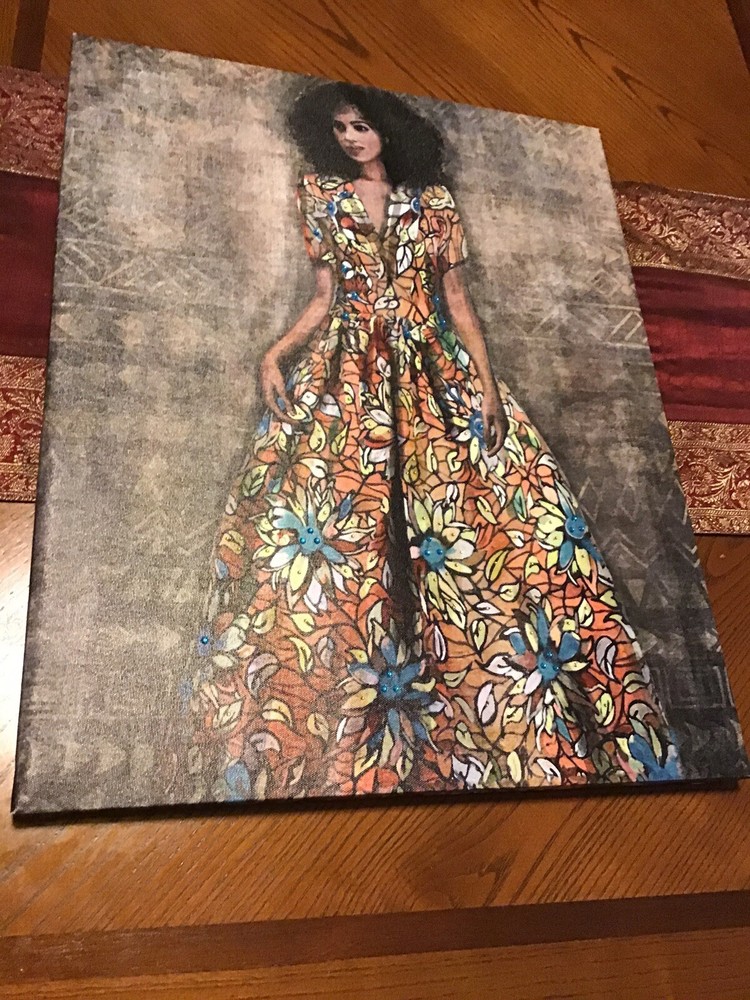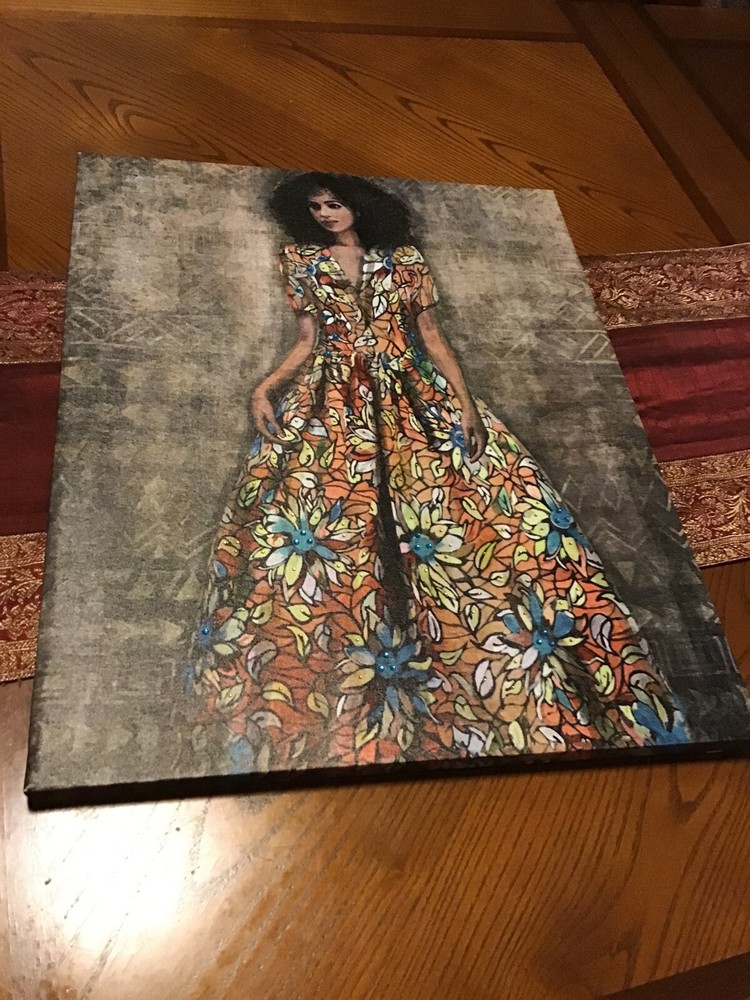 Zhei Wadon Creative Art Co: The Beautiful Lady - 9 / 2019. This is a lovely picture of a lady. It looks like real painting but it be a lithograph print. Measurement is approximately 20 inches long and 16 inches wide. The dress is decorated with rhinestones. It was made in 9/2019. Finished product contains composition wood.
